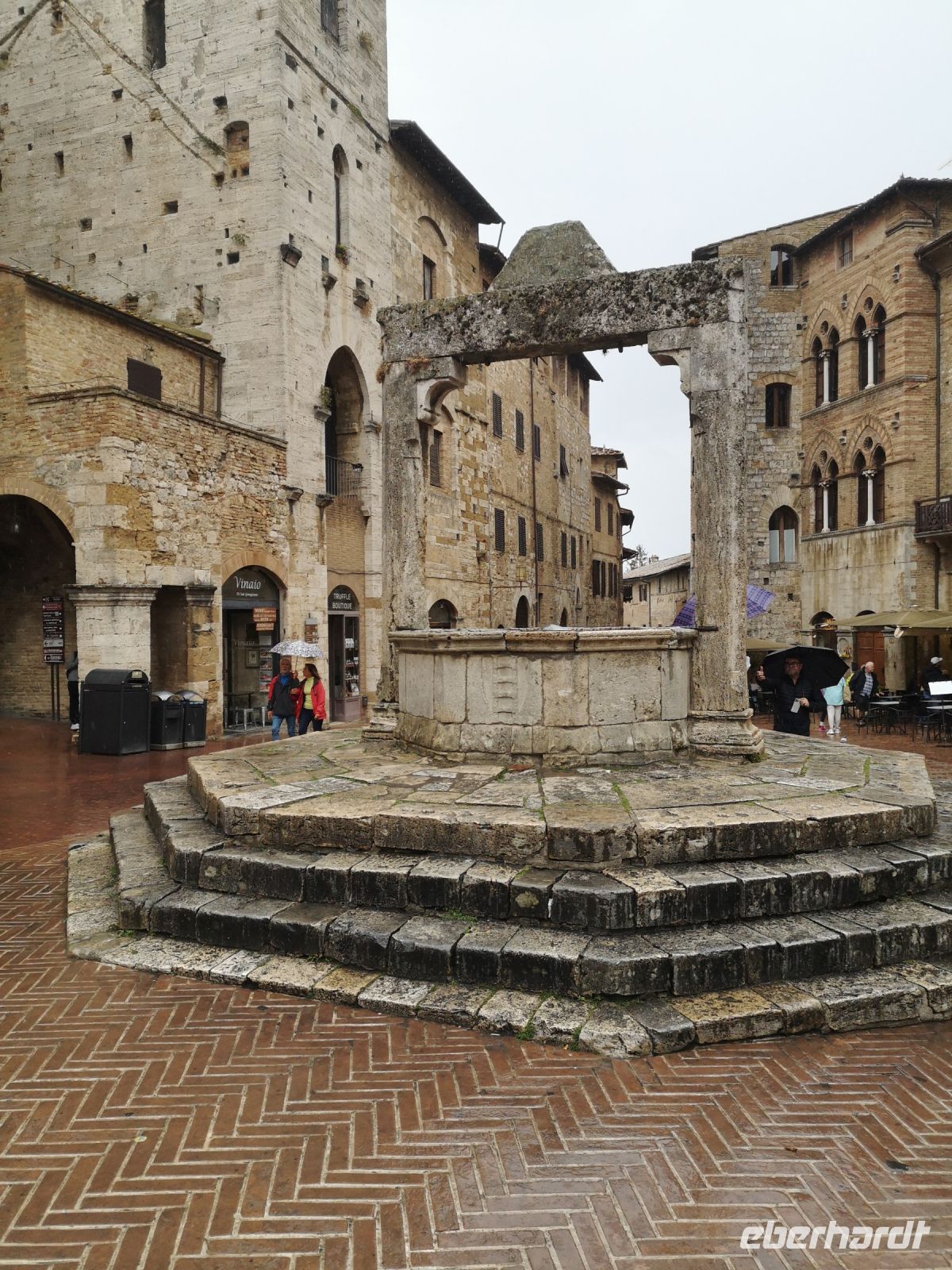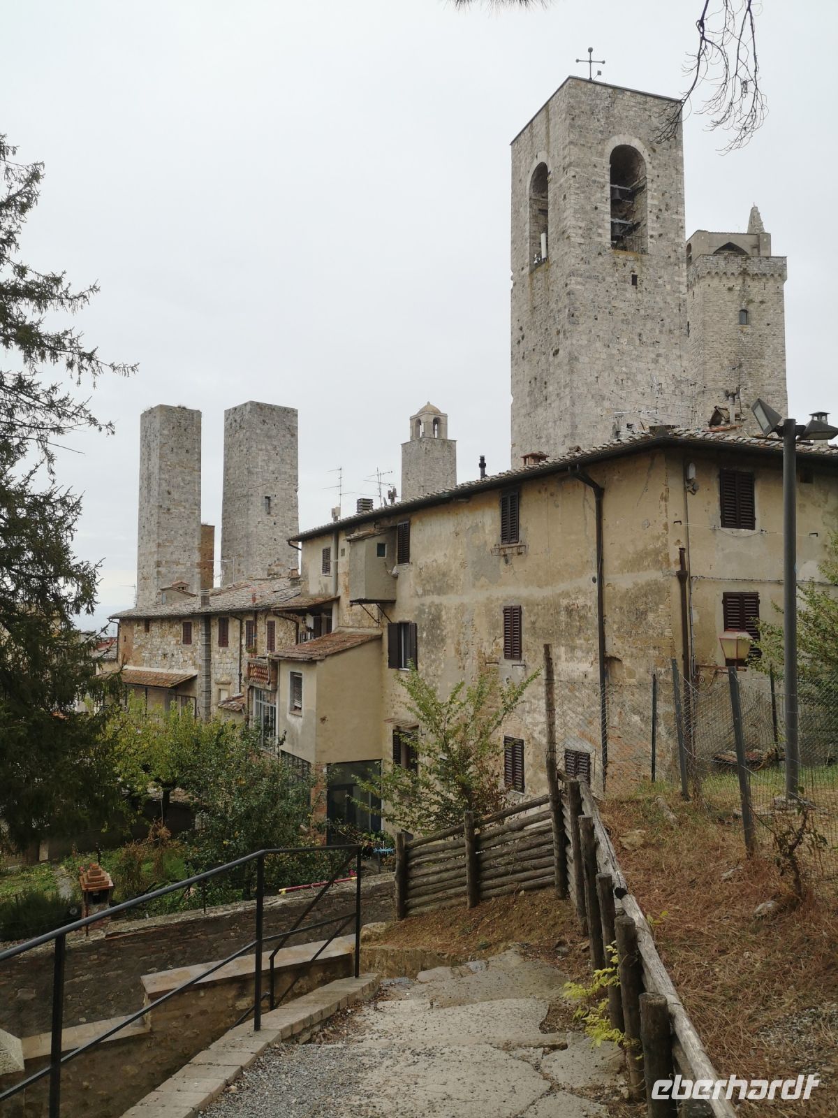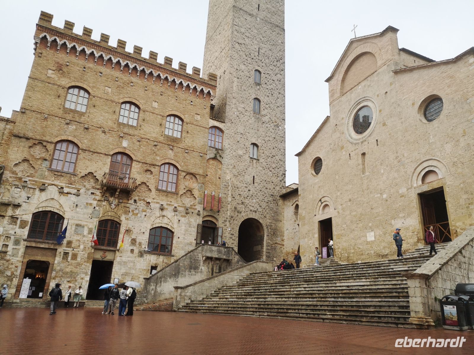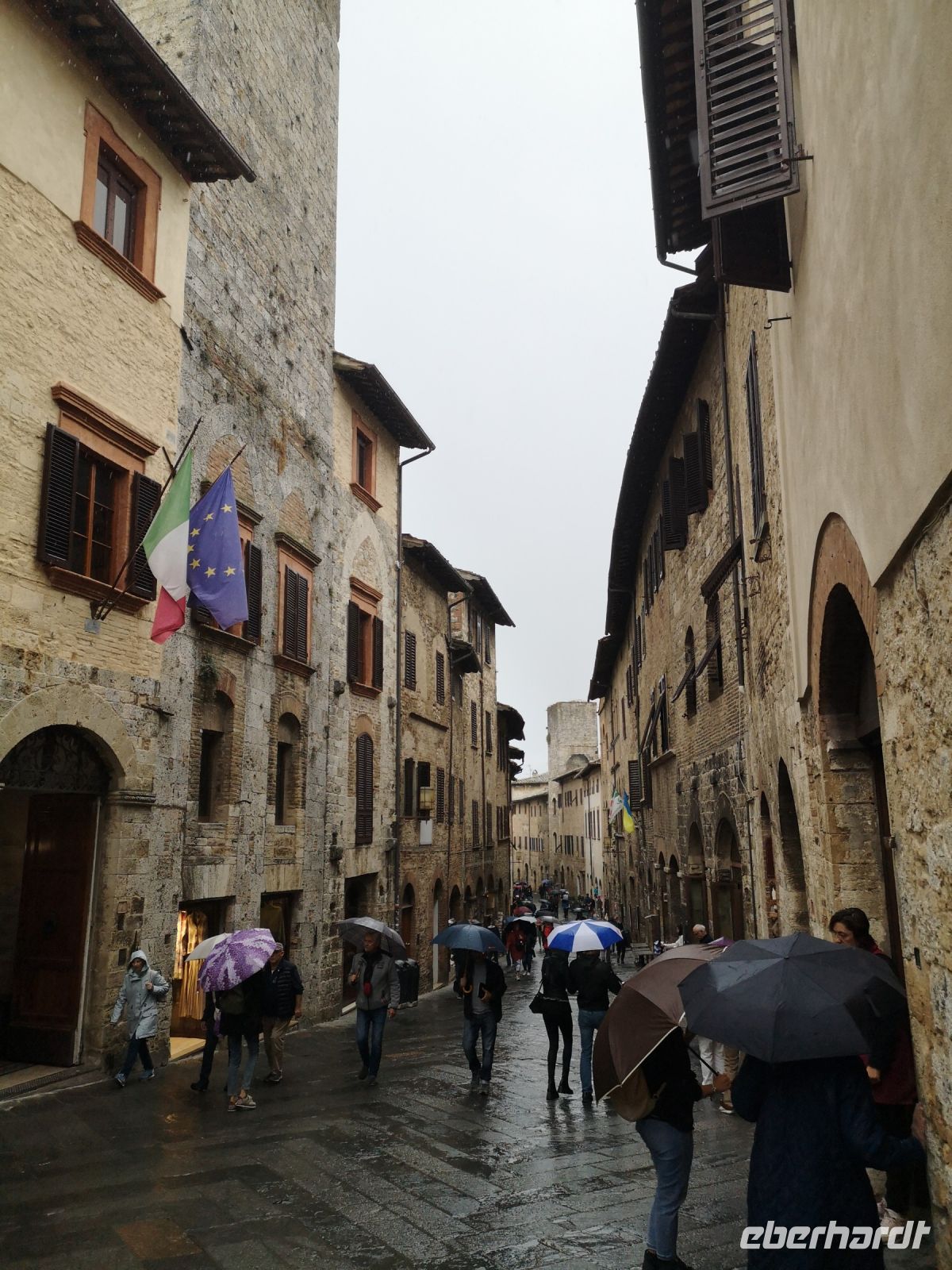Am letzten Tag unserer Toskana Reise, hat sich das Wetter leider etwas verschlechtert. Wir haben Regen und müssen die letzten beiden Städte mit Regenjacke und Schirm besuchen. Erst fahren wir nach San Gimignano, der Ort ist bekannt für seine vielen Türme in der Stadt. Die ehemalige etruskische Siedlung hatte, Ende des 12. Jahrhunderts, stolze 72 sogenannte Geschlechtertürme, die jeweils an ein Bürgerhaus angebaut wurden, und Zuflucht boten vor streitsüchtigen Nachbarorten. In diesen Türmen konnten sich die reichen Familien nach oben verbarrikadieren und ihren Reichtum sichern. Heute gibt es in dem kleinen Ort noch 15 dieser Türme, was aber auch schon sehr imposant aussieht.