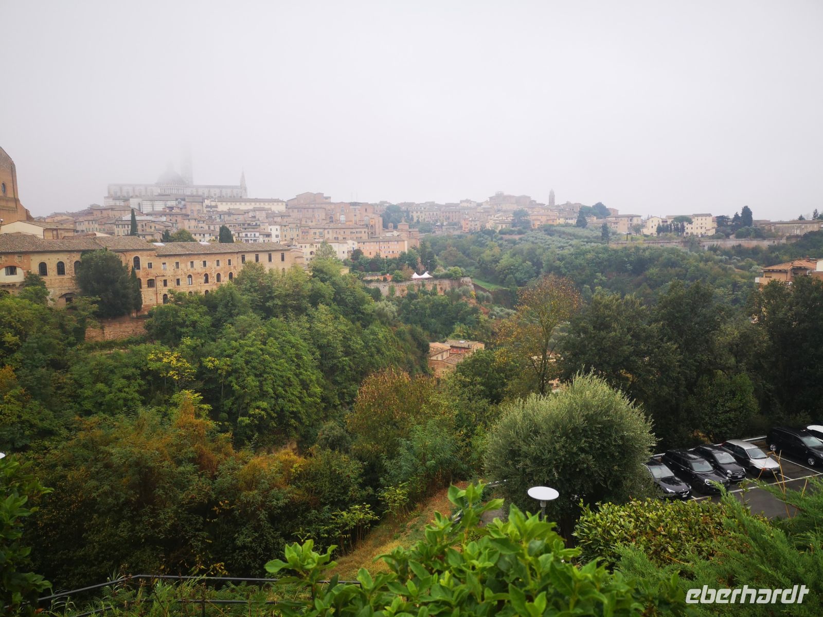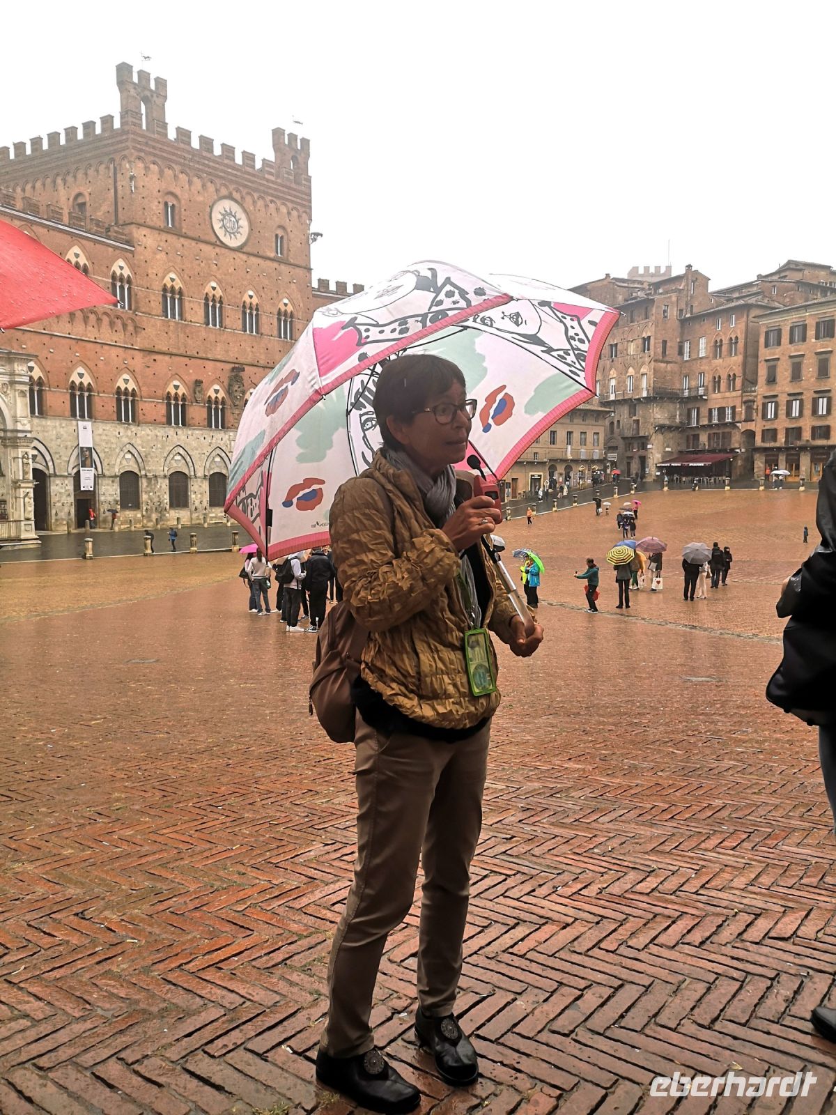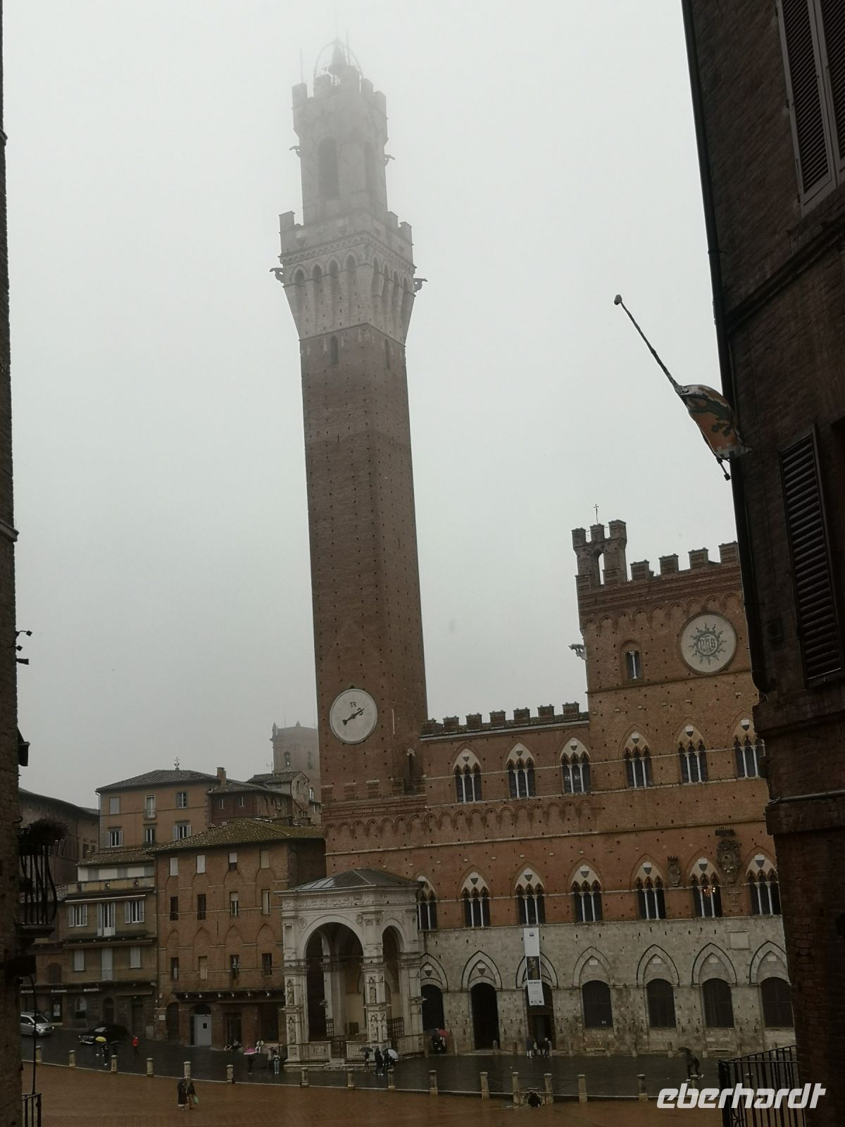 Für den Nachmittag wollen wir die schöne Stadt Siena besuchen. Auch hier regnet es kontinuierlich, aber das hält uns nicht ab den zielstrebig auf den Plazza del Campo zu gehen. Hier kann man sich gut Vorstellen wie die jährliche Palio di Siena, das härteste Pferderennen der Welt, hier ausgetragen wird. Kurz gesagt, ist der Palio ein Wettkampf zwischen den einzelnen Stadtbezirken, der in Siena mit Pferden ausgetragen wird. Die beste Sicht auf dieses Treiben hat man wohl vom naheliegenden Rathausturm, nur heute liegt der in den Wolken.