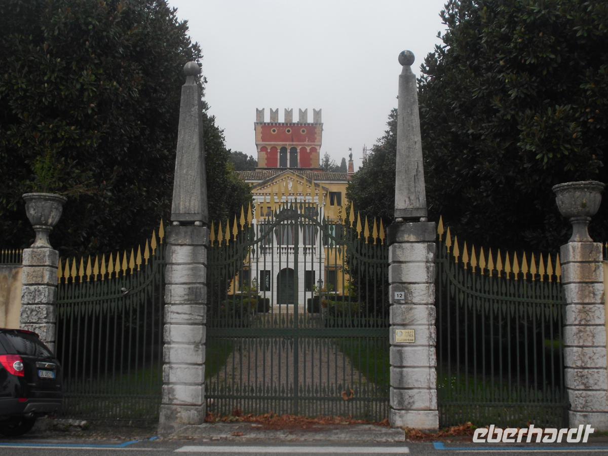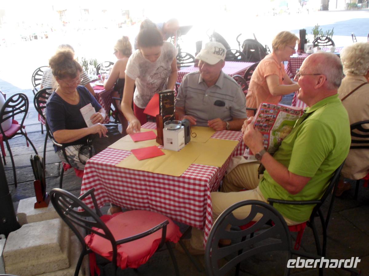 Das Frühstück war sehr gut und so begeben wir uns trotz des Regens weiter nach Süden. Weil wir etwas Zeit haben, biegen wir bei Rovereto rechts ab und fahren das Ostufer des Gardasees hinab. Hier erblicken wir erstmals mediterranes Flair. Stabzypressen, Pinien und Olivenbäume, die nördlichsten Italiens, gedeihen hier wegen des milden Klimas prächtig. Nach einer Toiletten- und Kaffeepause vor Malcesine genehmigen wir uns eine Stunde Aufenthalt in Garda. Das reicht bei dem Wetter, um die kleine, aber feine Altstadt mit ihren engen und verwinkelten Gassen zu erkunden. Überall ist den Schaufenstern der Limoncello, ein Zitronenlikör zu erblicken. Denn auch Zitronen wurden und werden noch am Gardasee angebaut. Am Nachmittag begeben wir uns wieder auf die Autobahn nach Süden und biegen vor Bologna in den oberen Appenin ab. Nun wird es nach der Durchquerung der flachen Poebene wieder bergig und kurvig. Doch schon bald erblicken wir die Ebene des Arno, des größten Flusses der Toskana weit im Tal und wie durch ein Wunder hört genau an der Grenze von der Emilia Romagna zur Toskana der Regen auf und die Sonne kommt durch. Nun sind es nur noch wenige Kilometer bis zu unserem Ziel: Dem berühmtesten und mondänsten Kurbad Italiens. Montecatini Therme. Hier beziehen wir unser Hotel direkt am Kurpark, nachdem wir zunächst die obligatorische Einfahrtsgebühr für die Stadt bezahlt haben. Nun freuen wir uns auf unser Abendmenü und sehen die Tische für uns mit den blauen Eberhardt-Schildern schon gedeckt.