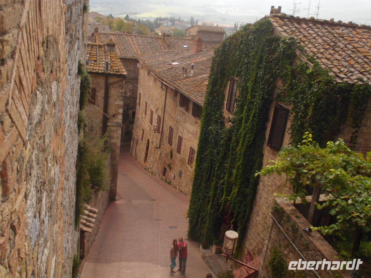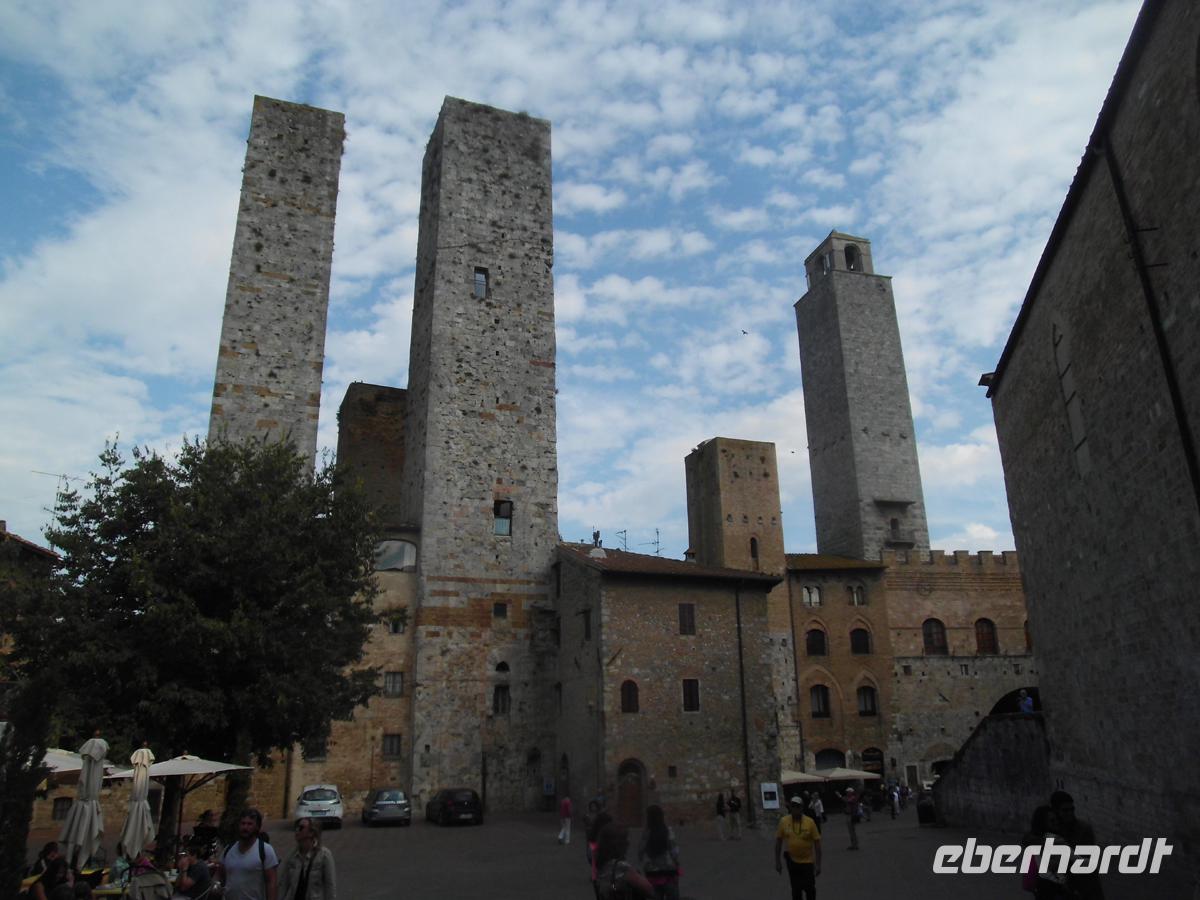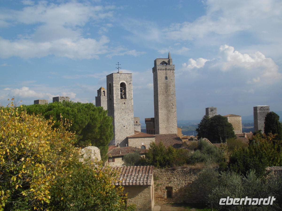 Wir verlassen unser freundliches Hotel am heutigen Tag und begeben uns zunächst nach Süden in die Industriestadt Empoli. Zusammen mit Montelupo ist sie neben Venedig eines der Glaszentren Italiens. Am Bahnhof erwartet uns Herr Cartecchini, Eigner eines Oliven- und Weinbauernhofes. Mit ihm fahren wir z. T. über Feldwege mitten in die toskanische Pampa hinein zu seinem Hof, wo uns 5 Sorten Wein, Olivenöl, Grappa und ein Desertwein zum Probieren angeboten werden. Dazu werden Salami, geröstetes und weisses Bort, toskanischer Schinken und Olivenöl gereicht. Allein das Weißbrot in das Öl zu stippen und es zu essen ist ein Genuss. Zum Rotwein kommt dann noch Pecchorino, der feine toskanische Käse auf den Tisch. Die Stimmung wird immer fröhlicher und wir genießen die schöne Aussicht auf die toskanischen Hügel mit den Weinhängen und Olivenbaumplantagen. Dazwischen immer wieder Zypressen und Pinien, sowie stattliche Anwesen und kleine Dörfer. Schon von weitem sehen wir San Gimignano auf der Bergkuppe mit den vielen Geschlechtertürmen. Es wird wegen diesen auch das mittelalterliche Manhattan genannt. Knapp 50 gab es in der Stadt um 1300 (nicht 72 wie in vielen Reiseführern steht). Doch auch das war schon viel und heute sind noch 15 erhalten. Auch die Stadtmauer ist noch komplett. Das 14. Jh. ist in San Gimignano stehen geblieben. Warum? Zum einen wurde der Küstenstreifen der Maremma ab dem frühen 16. Jh. trocken gelegt und die alte Handels- und Pilgerstraße Francigena, der Frankenweg nach Rom nahm nicht mehr den Weg über die Berge, sondern die ebene Strecke. Zum anderen verfügte der Großherzog der Toskana Cosimo I Medici nachdem die Stadt schon lange in florentiner Besitz war, dass keine finanziellen Mittel mehr in sie fließen durften. Damit verarmte eine Stadt, die selbst vor Generationen Gesetzte gegen überbordend zur Schau gestellten Reichtum erließ. Das Mittelalter ist in San Gimignano stehen geblieben. Spätrenaissance und Barock haben im Grunde keine Spuren hinterlassen. In unserer individuellen Freizeit gehen wir z. B. in die Kollegiatskirche, welche über und über mit wertvollen Fresken bemalt ist (Photos strengsten verboten und unmöglich, weil überall zweibeinige Wachhunde stehen). Oder man genießt ein Eis beim Weltmeister der Eiskunst oder seinem Konkurrenten schräg gegenüber. Das muss man einfach probieren. Köstlich! Lohnenswert ist auch ein kostenloser Besuch in einem kleinen Museum mit einem Modell von San Gimignano um 1300. Zwei Archäologen haben es in Eigeninitiative aus Terrakotta hergestellt. Hier kann man die Geschlechtertürme zählen und schauen, wo man entlang gegangen ist. Sehr schön.