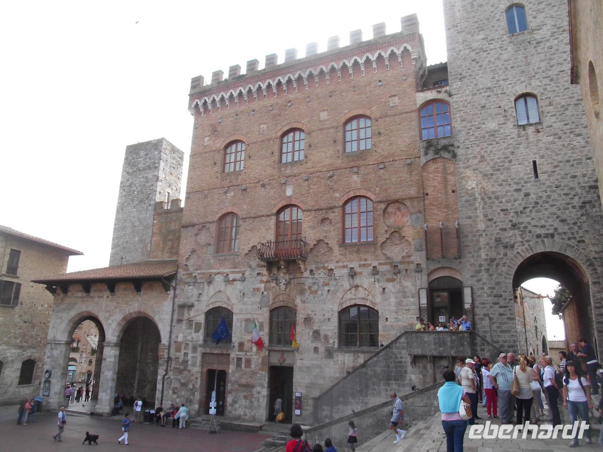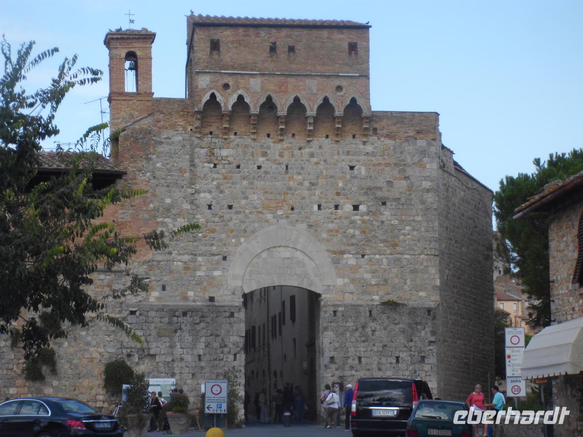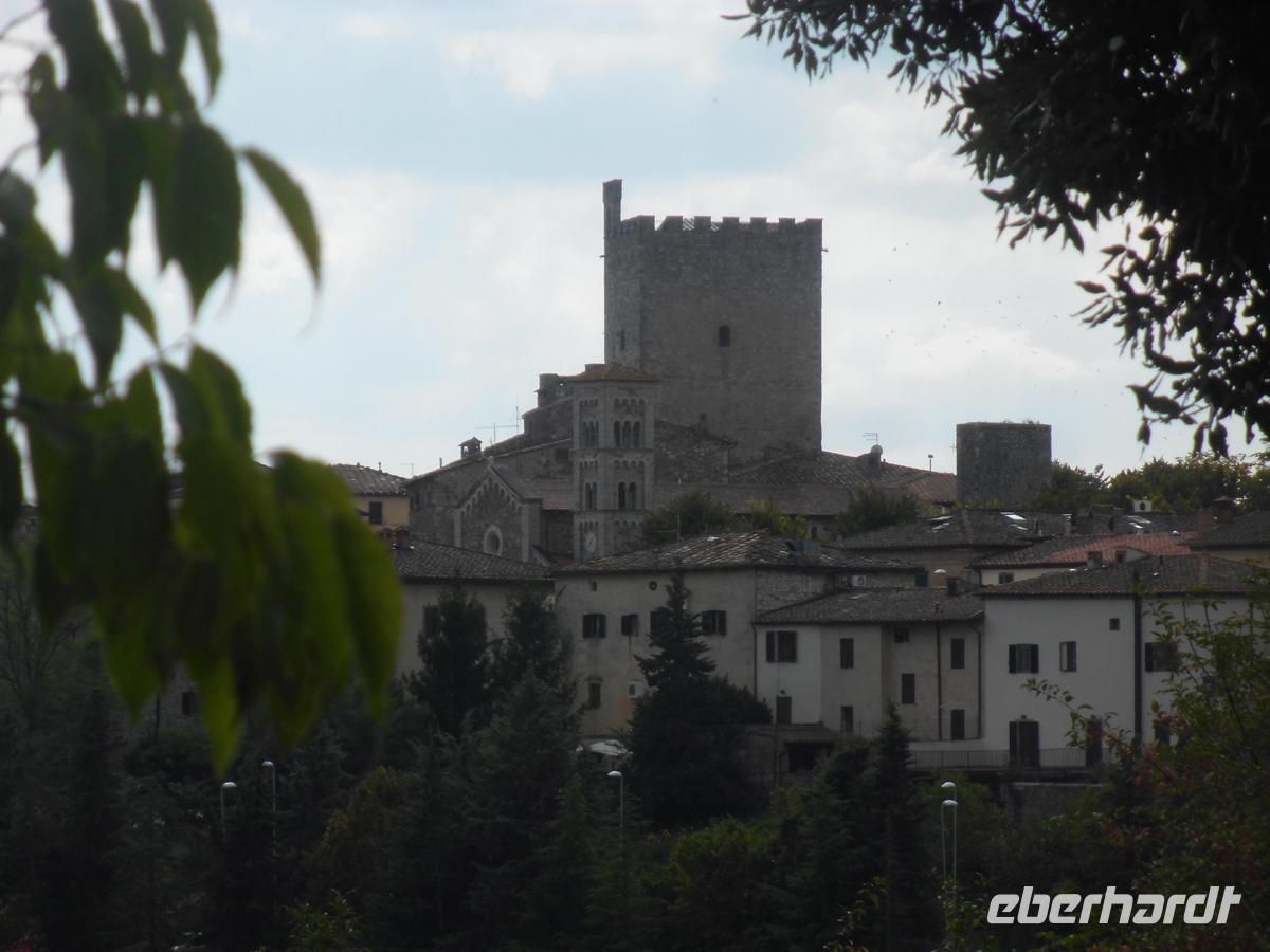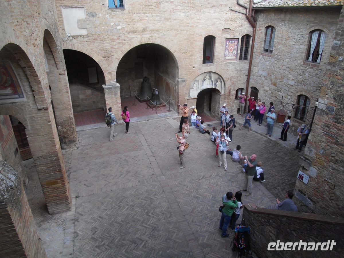 Wir verlassen unser freundliches Hotel am heutigen Tag und begeben uns zunächst nach Süden in die Industriestadt Empoli. Zusammen mit Montelupo ist sie neben Venedig eines der Glaszentren Italiens. Am Bahnhof erwartet uns Herr Cartecchini, Eigner eines Oliven- und Weinbauernhofes. Mit ihm fahren wir z. T. über Feldwege mitten in die toskanische Pampa hinein zu seinem Hof, wo uns 5 Sorten Wein, Olivenöl, Grappa und ein Desertwein zum Probieren angeboten werden. Dazu werden Salami, geröstetes und weisses Bort, toskanischer Schinken und Olivenöl gereicht. Allein das Weißbrot in das Öl zu stippen und es zu essen ist ein Genuss. Zum Rotwein kommt dann noch Pecchorino, der feine toskanische Käse auf den Tisch. Die Stimmung wird immer fröhlicher und wir genießen die schöne Aussicht auf die toskanischen Hügel mit den Weinhängen und Olivenbaumplantagen. Dazwischen immer wieder Zypressen und Pinien, sowie stattliche Anwesen und kleine Dörfer. Schon von weitem sehen wir San Gimignano auf der Bergkuppe mit den vielen Geschlechtertürmen. Es wird wegen diesen auch das mittelalterliche Manhattan genannt. Knapp 50 gab es in der Stadt um 1300 (nicht 72 wie in vielen Reiseführern steht). Doch auch das war schon viel und heute sind noch 15 erhalten. Auch die Stadtmauer ist noch komplett. Das 14. Jh. ist in San Gimignano stehen geblieben. Warum? Zum einen wurde der Küstenstreifen der Maremma ab dem frühen 16. Jh. trocken gelegt und die alte Handels- und Pilgerstraße Francigena, der Frankenweg nach Rom nahm nicht mehr den Weg über die Berge, sondern die ebene Strecke. Zum anderen verfügte der Großherzog der Toskana Cosimo I Medici nachdem die Stadt schon lange in florentiner Besitz war, dass keine finanziellen Mittel mehr in sie fließen durften. Damit verarmte eine Stadt, die selbst vor Generationen Gesetzte gegen überbordend zur Schau gestellten Reichtum erließ. Das Mittelalter ist in San Gimignano stehen geblieben. Spätrenaissance und Barock haben im Grunde keine Spuren hinterlassen. In unserer individuellen Freizeit gehen wir z. B. in die Kollegiatskirche, welche über und über mit wertvollen Fresken bemalt ist (Photos strengsten verboten und unmöglich, weil überall zweibeinige Wachhunde stehen). Oder man genießt ein Eis beim Weltmeister der Eiskunst oder seinem Konkurrenten schräg gegenüber. Das muss man einfach probieren. Köstlich! Lohnenswert ist auch ein kostenloser Besuch in einem kleinen Museum mit einem Modell von San Gimignano um 1300. Zwei Archäologen haben es in Eigeninitiative aus Terrakotta hergestellt. Hier kann man die Geschlechtertürme zählen und schauen, wo man entlang gegangen ist. Sehr schön.