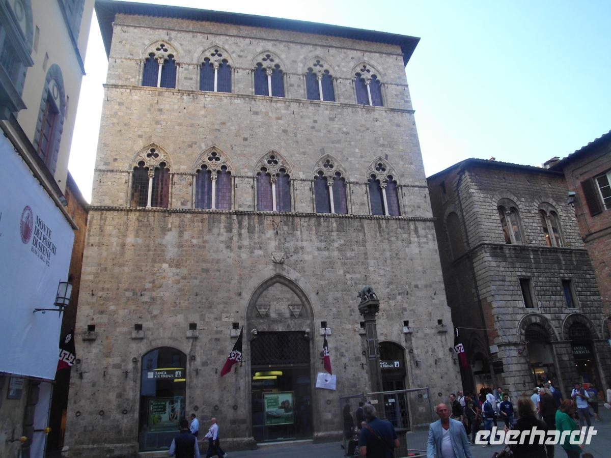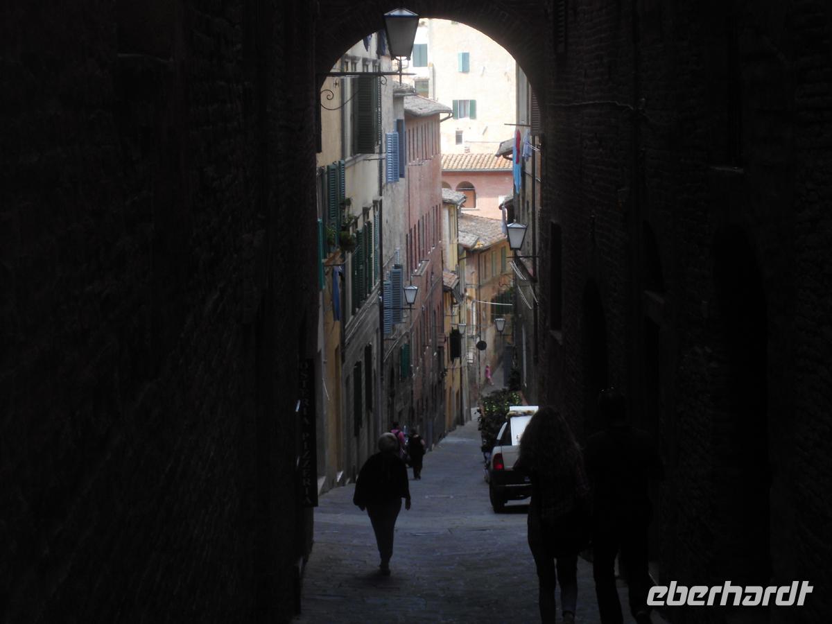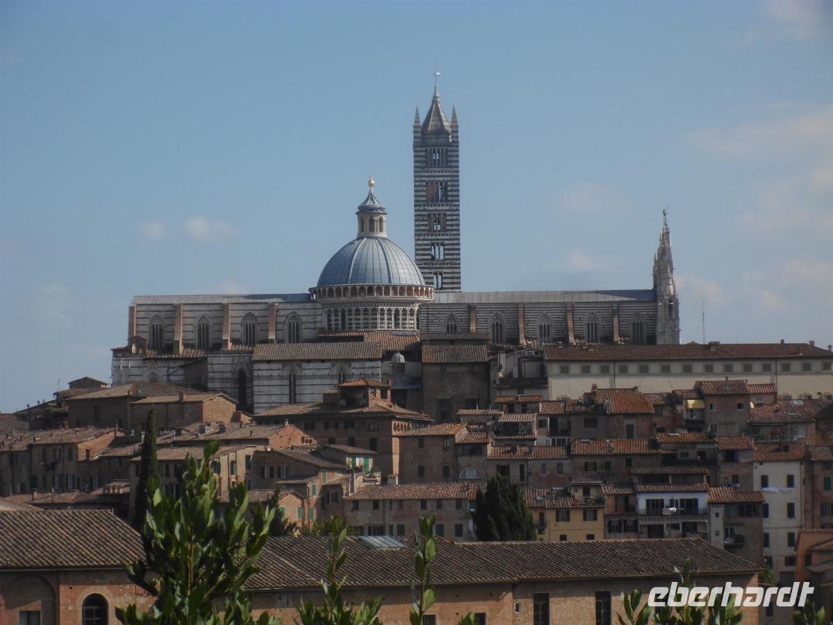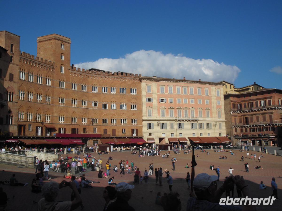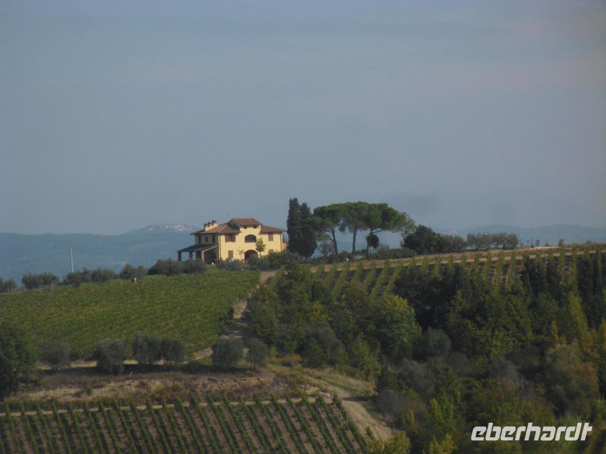 Heute reisen wir durch das Chiantigebiet. Toskana pur umfängt uns. Stabzypressen und Pinien umstehen stattliche alte Villen auf den tausenden von Hügeln. Olivenhaine und Weinberge wechseln einander ab. Wir reisen die Weinstraße des Chianti auf der strada stadale 222 nach Süden. Kern des Gebietes sind die Colli di Chianti, aber die Abgrenzung des Gebiets rührt eher von einem mittelalterlichen Militärbündnis, der Lega Chianti her, in welcher sich etliche Städte um diese Berge zu einem Schutzbündnis zusammen schlossen. Letztlich war es immer Spielball zwischen den zwei mächtigen Stadtrepubliken Siena und Florenz. Die vielen Kämpfe verursachten die starken Befestigungen der kleinen Städte und Dörfer in diesem Gebiet. Doch spätestens 1555 hatte Florentz endgültig die Oberhand gewonnen und so war es ein Florentiner, Cosimo III. Medici, der 1713 das Weinbaugebiet des Chianti classico erstmals genau abgrenzte und Richtlinien für dessen Qualität vorschrieb. Auch Greve ist solch ein alter Ort, der sich durch einen einzigartigen, triagonalen Marktplatz auszeichnet. Dieser ist völlig von Laubengängen umgeben, und auch eine der traditionsreichsten Metzgereien der Toskana ist hier ansässig. Die verkaufen edlen Schinken und Salami, sowie Käse u. v. m. Diese genießen wir mit einem guten Chianti Classico (nur der mit dem schwarzen Hahn, dem Gallo Negro) vor dem befestigten Dorf Castellina. Die Rocca, die Stadtburg steht stolz und immer noch verteidigungsbereit über dem Dorf. Die Zeit drängt und wir befinden uns schon in Siena. Susanne, unsere Gästeführerin empfängt uns an der Fortezza, der Stadtfestung. Siena war der große Konkurrent von Florenz und hat eine ebenso riesige Altstadt, jedoch mit weitaus mehr Mittelalter. In Florenz hat die Renaissance die Oberhand. Zuerst werfen wir einen Blick in die Kirche San Domenico, wo wir ein noch wohl zu Lebzeiten der hl. Katharina angefertigtes Fresco von ihr sehen. Durch enge Gassen geht es zur höchsten Stelle der Stadt, wo der Dom steht. Dieser gotische Bau sollte nur das Querhaus eines weit größeren werden, denn Siena wollte das größte Bauwerk Italiens erreichten. 1348 wurde das Projekt aufgegeben und so steht man heute im Grund einer riesigen mittelalterlichen Baustelle, die erahnen lässt, welche Ausmaße das Bauwerk einmal annehmen sollte. Letzlich landen wir auf der Piazza del Campo, dem Marktplatz. Die Vorbereitungen für das Palio, das weltberühmte Pferderennen auf dem Platz sind schon im vollen Gang. Seit 1310 existiert das Fest, in dem 17 Stadtteile gegeneinander antreten. Nach soviel Historie wird wieder Zeit für Kulinarisches. Eine Weinverkostung mit mächtig aufgetischten Produkten aus der Region erwartet und in dem Consorzio Agrario di Siena. Das ist Spitze und begeistert noch lange. 12000 Landwirte haben sich mittlerweile überregional in diesen Consortien zusammen geschlossen und haben nur Anfahrtswege bis zu 8 km vom Erzeuger zum Verbraucher. Übers Internet werden die Produkte gleichwohl auch vertrieben. Der Vertrieb in Siena versteht sich als Unterstützer dieser Marktstrategie, die den Bauern, und nicht internationalen Nahrungsmittelspekulanten helfen soll. Und billig ist es zudem auch. So wird fleißig eingekauft, was man vorher als gut schmeckend erachtete. Doch irgendwann müssen auch wir mal wieder ins Hotel zurück und haben nach soviel toskanischen Leckereien heute gar nicht mehr so recht Appetit auf das Abendmenü. Aber Tiramisu geht immer noch rein!