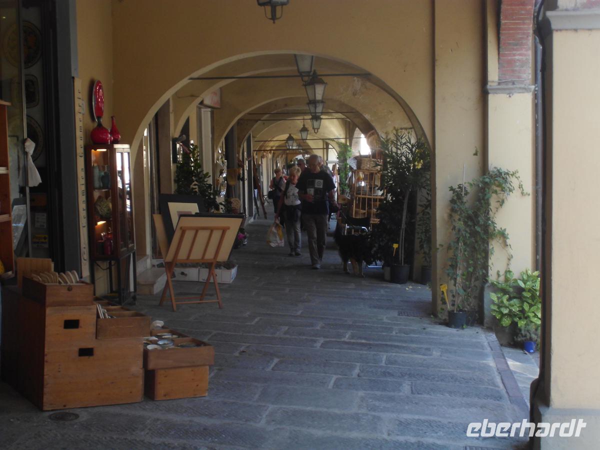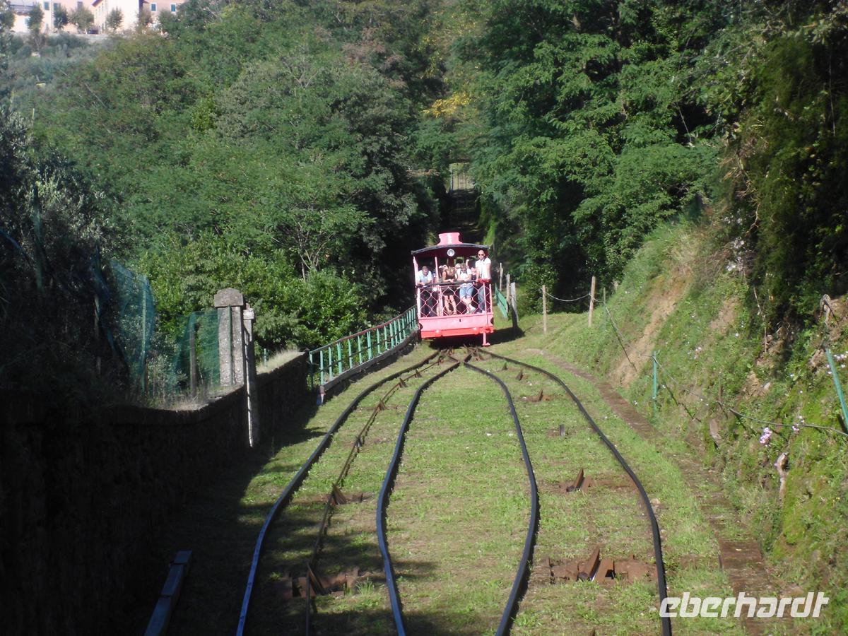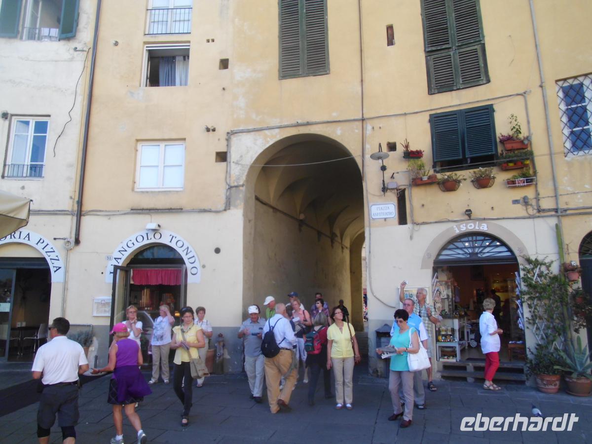 Umgeben von einer riesigen Stadtmauer von 12 m Höhe und 30 m Fundamentbreite, betreten wir ein Labyrinth von Gassen, dass im Kern jedoch noch die Struktur der römischen Stadt aufweist. Trotzdem verläuft man sich ohne Stadtplan heillos. Wir spazieren mit Plänen zunächst an der Kirche San Paolino, der einzigen völlig renaissancezeitlichen Kirche der Stadt vorbei zum Geburtshaus von Giacomo Puccini. Mondän sich gebend, lässig Zigarette rauchend, sitzt er auf der Piazza als Denkmal auf dem Sockel. Wenige Schritte weiter San Michele in Foro, die alte Stadtkirche aus dem 12. Jh, deren Fundamente z. t. noch auf dem römischen Apollotempel stehen. Denn hier lag das Forum der römischen Stadt. Einige Gäste setzen sich nun ab um schon die zahllosen Restaurants und Cafes aufzusuchen, doch mit den meisten gehen wir weiter zur Piazza Anfitheatro. Hier stehen die Hauser auf den Grundmauern des römischen Amphitheaters und nutzen die Zuschauereingänge des 2. Jh. heute noch als Hauseingänge. Hier lässt es sich gut sitzen und ein schöner warmer Luftzug kühlt jeden, der bei Eis, Kaffee oder warmen Speisen an zu schwitzen fängt. Mit einigen Gästen gehe ich noch zum Dom San Martino. Der Bau aus dem 13. -15.Jh. steht auf Resten von Vorgängerbauten aus dem 6. Und 8. Jh. Den reichen Schmuck der Fassade allein zu schildern würde hier zu weit führen. Wir müssen zum Bus zurück, denn punkt 17 Uhr besteigen wir die die älteste Standseilbahn (1893) Italiens hinauf von Montecatini Therme zu dem alten Bergorf Montecatini Alto. Oben umfängt uns Wind und ein Dorf, als sei die Zeit stehen geblieben. Das Dorf bildete sich um eine Burg herum, von der noch der Uhrturm als einziges Relikt erhalten ist (11. Jh.). Nur der Markt mit einem Kriegerdenkmal aus dem 1. Weltkrieg quillt über von Restaurants. Ansonsten hat jeder, der Stille sucht, hier ein Refugium.