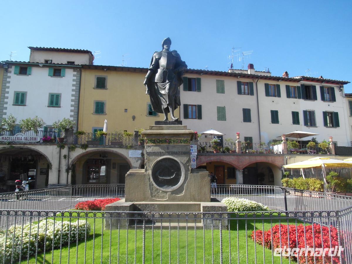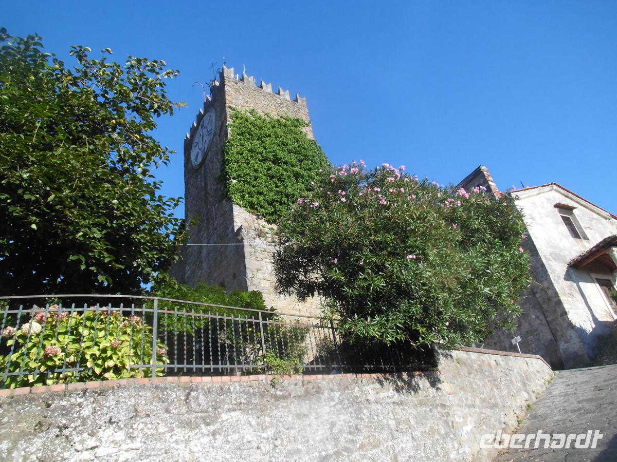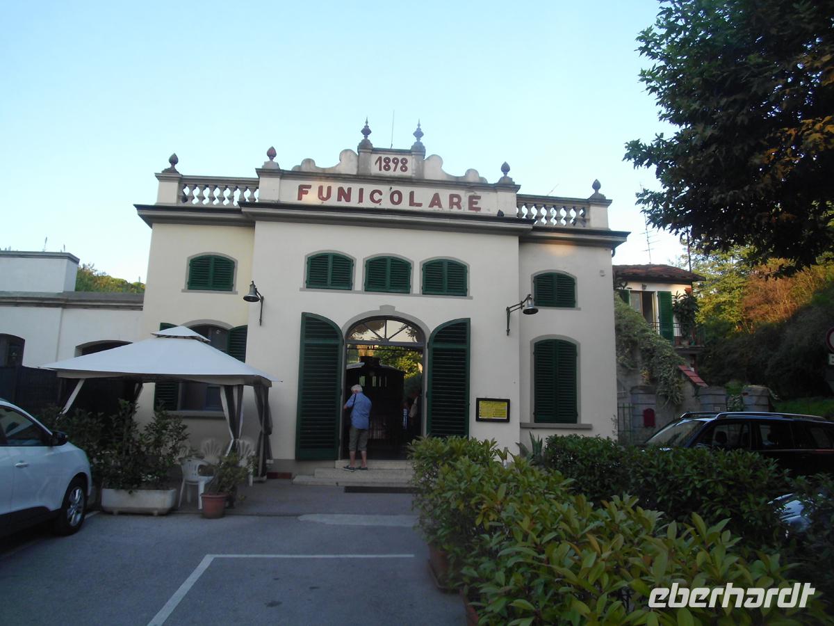 Umgeben von einer riesigen Stadtmauer von 12 m Höhe und 30 m Fundamentbreite, betreten wir ein Labyrinth von Gassen, dass im Kern jedoch noch die Struktur der römischen Stadt aufweist. Trotzdem verläuft man sich ohne Stadtplan heillos. Wir spazieren mit Plänen zunächst an der Kirche San Paolino, der einzigen völlig renaissancezeitlichen Kirche der Stadt vorbei zum Geburtshaus von Giacomo Puccini. Mondän sich gebend, lässig Zigarette rauchend, sitzt er auf der Piazza als Denkmal auf dem Sockel. Wenige Schritte weiter San Michele in Foro, die alte Stadtkirche aus dem 12. Jh, deren Fundamente z. t. noch auf dem römischen Apollotempel stehen. Denn hier lag das Forum der römischen Stadt. Einige Gäste setzen sich nun ab um schon die zahllosen Restaurants und Cafes aufzusuchen, doch mit den meisten gehen wir weiter zur Piazza Anfitheatro. Hier stehen die Hauser auf den Grundmauern des römischen Amphitheaters und nutzen die Zuschauereingänge des 2. Jh. heute noch als Hauseingänge. Hier lässt es sich gut sitzen und ein schöner warmer Luftzug kühlt jeden, der bei Eis, Kaffee oder warmen Speisen an zu schwitzen fängt. Mit einigen Gästen gehe ich noch zum Dom San Martino. Der Bau aus dem 13. -15.Jh. steht auf Resten von Vorgängerbauten aus dem 6. Und 8. Jh. Den reichen Schmuck der Fassade allein zu schildern würde hier zu weit führen. Wir müssen zum Bus zurück, denn punkt 17 Uhr besteigen wir die die älteste Standseilbahn (1893) Italiens hinauf von Montecatini Therme zu dem alten Bergorf Montecatini Alto. Oben umfängt uns Wind und ein Dorf, als sei die Zeit stehen geblieben. Das Dorf bildete sich um eine Burg herum, von der noch der Uhrturm als einziges Relikt erhalten ist (11. Jh.). Nur der Markt mit einem Kriegerdenkmal aus dem 1. Weltkrieg quillt über von Restaurants. Ansonsten hat jeder, der Stille sucht, hier ein Refugium.