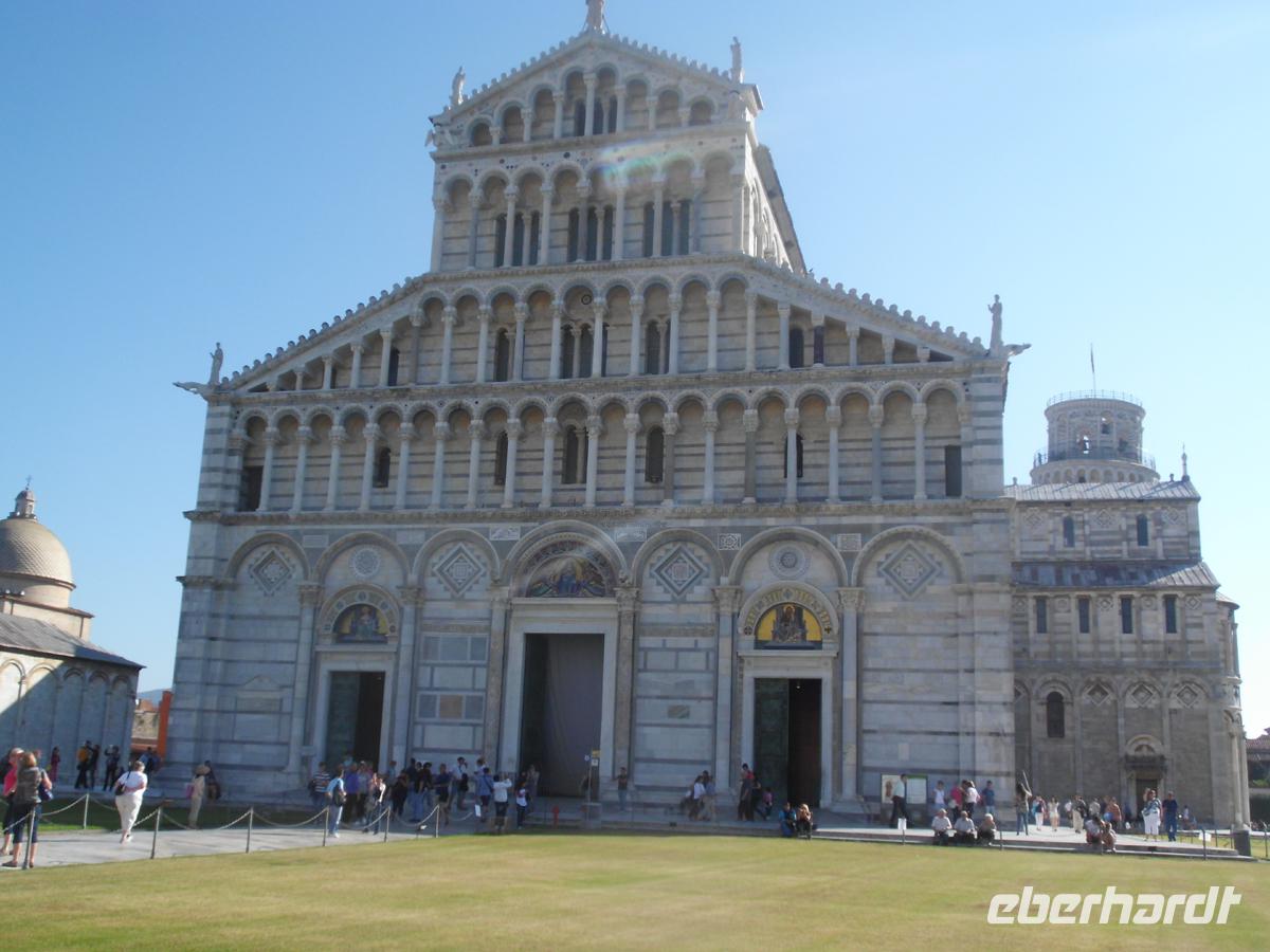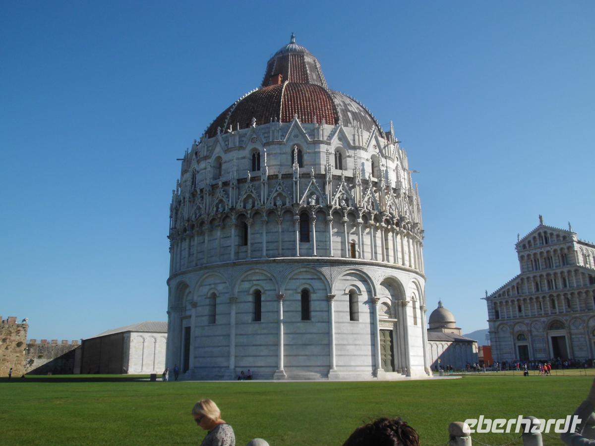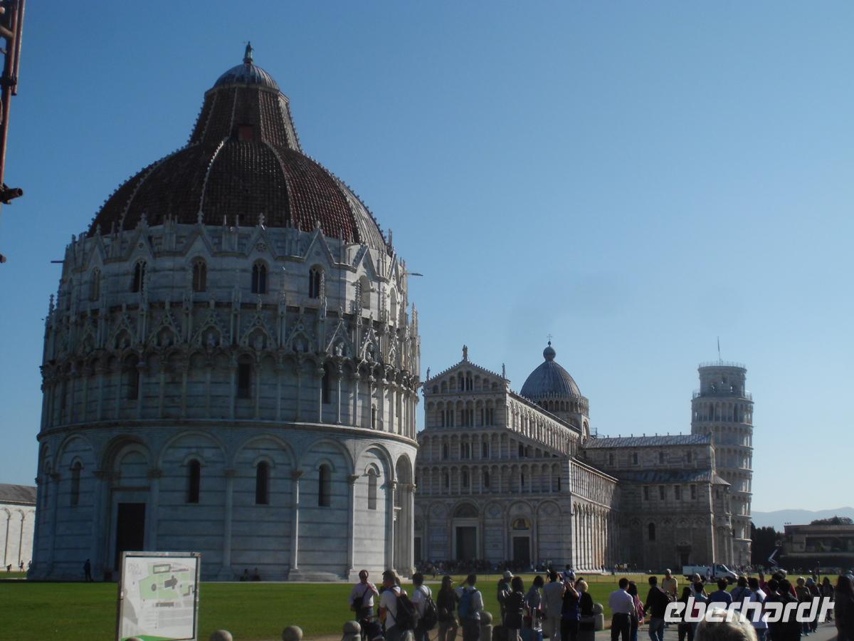 Wir reisen in Richtung Meer und die Pisaner Berge zeigen sich uns von vorne. Der Monte Serra ist mit seinen vielen Sendemasten auf 917 m Höhe schon weitem zu erkennen. Links um das Gebirge herum, und schon dürfen wir, wie für Italienische Städte üblich, erst einmal eine gesalzene Einfahrtsgebühr für unseren Bus in die Stadt bezahlen. Doch dann empfängt uns eine herzliche Aurelia als örtl. Guide. Wir müssen ein Stück laufen und sind dann auf der Piazza dei Miracoli, dem Platz der Wunder. Das Weltkulturerbe aus Dom, Baptisterium und dem schiefen Turm tut sich vor uns auf. Tausende von Menschen drängen sich, um das Wunder zusehen. 1063 wurde der Dom begonnen, in unnachahmlicher Gotik vollendet. In der Apsis der segnende Christus im riesigen Goldmosaik, und natürlich die Marmorkanzel, ein Spätwerk von Giovanni Pisano, an der er von 1302 bis 1312 gearbeitet hat. Aurelia hats drauf und erzählt und erzählt. Nur ein kurzer Blick noch in die Gassen der schönen mittelalterlichen Stadt und dann haben wir den vorbestellten Termin für die Besteigung des Turms. Wer nicht mit hinauf möchte, besichtigt das Baptisterium, oder geht in der Altstadt etwas zu sich nehmen. Gelegenheiten dazu gibt es genug. Wir sind auserwählt und können den schiefen Turm besteigen, denn nur 30 Gäste können wegen der Statik noch gleichzeitig hinauf. Schon beim Betreten der schiefen Bodenplatte wird einem irgendwie schwummrig. Etwas stimmt mit dem Gleichgewichtsgefühl nicht mehr. Gleiches beim Treppenaufgang, der mehr als 260 Stufen hat. Gäste haben mitgezählt. Permanent werde ich gegen die Außenmauer gedrückt, weil alles so schief ist. Aber von oben hat man einen tollen Blick auf Pisa und die Landschaft. Jedoch bin ich ganz schnell wieder unten. Ich traue dem Frieden nicht, aber der Turm steht noch, gottlob. Schon bei der Erbauung ab 1173 begann er sich zu senken. Nachdem er 1990 geschlossen und wieder etwas aufgerichtet wurde, soll er nun noch einmal 300 Jahre halten. Ich hoffe es für alle, die ihn noch besteigen wollen, bei 3,60 m Neigung aus dem Lot. Diese Eberhardt Gruppe war oben!