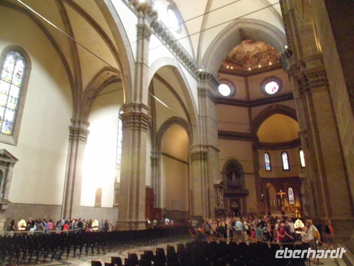 Heute erleben wir die Hauptstadt der Toskana: Florenz. 6 Stunden Führung haben wir uns für die große Stadt vorgenommen, und die sind wegen der vielen Sehenswürdigkeiten auch notwendig. Vorbei an der Nationalbibliothek führt uns der Weg zu Santa Croce. Hier war um das ehemalige Gerberviertel der Stadt das Franziskanerkloster. Heute ist die Kirche jedoch zu, weil Namenstag des hl. Franziskus ist. Durchs Danteviertel kommen wir durch enge Gassen zum Wohnhaus des Politikers und Dichters, welcher auch der Goethe Italiens genannt wird, oder auch der Luther, denn wie jener schuf er mit dem Werk: Die göttliche Komödie" eine einheitliche Schriftsprache Italiens. Dann sind wir durch das Gassengewirr an der Piazza del Doumo angelangt und bestaunen die gewaltige Kirche. Ohne uns in der elend lange Schlange anstellen zu müssen gelangen wir ohne Wartezeit hinein. Die Kuppel verdient besonderes Augenmerk, denn sie ist doppelt gemauert und innen mit schönen Fresken ausgestaltet. Überall sind Plastiken mit Hinweisen darauf angebracht, dass es das Handwerk und der Handel waren, die Florenz hoch gebracht haben. Es ist eine Bürgerkirche.