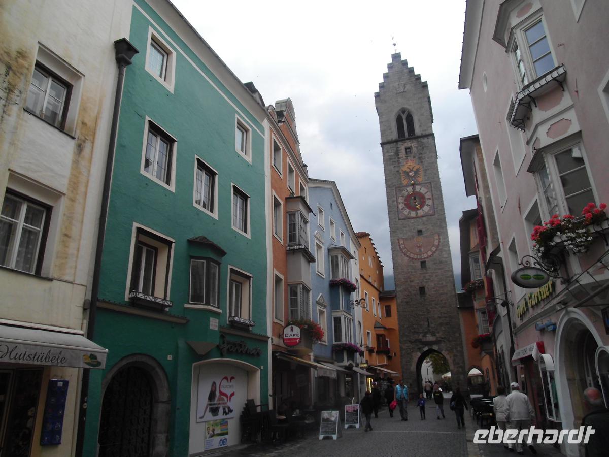 Wir nehmen Abschied vom Meer und begeben uns durch die Maremma, den Küstenstreifen der Toskana nach Norden über den Appenin. Hier ändert sich das Wetter. Heftiger Regen und Nebel in den Bergen bis zu 1300 m. Auch in der nördlich daran anschließenden Poebene ist dichter Nebel. Erst zum Mittag bei unserer Pause nahe Modena lichtet sich die Witterung. Doch schon ab Rovereto ziehen wieder Wolken auf. So lassen wir unseren Plan fallen, noch einmal am Gardasee entlang zu fahren, wo wir schon auf dem Hinweg nur Regenwetter hatten. Bei Mori bietet sich noch eine Einkaufsmöglichkeit für Produkte aus dem Veneto, Trentino und Südtirol. Dann setzen wir Plan B um und reisen nach Sterzing. Das hat eine sehr schöne Altstadt, die 1280 Stadtrechte erhielt. Die Hauptstraße wird von mächtigen Bürgerhäusern mit Zinnen und Giebeln gesäumt. Sie ist Fußgängerzone und lädt mit vielen Geschäften und Gallerien zum Bummeln und shoppen ein. Eine gute Stunde Zeit sind dort schon angebracht um einmal hin und zurück zu schlendern. Dann ist es nicht mehr weit bis zu unserem Hotel in Stadtnähe, wo wir mit einem typischen Tiroler Menü den Abend beschließen.