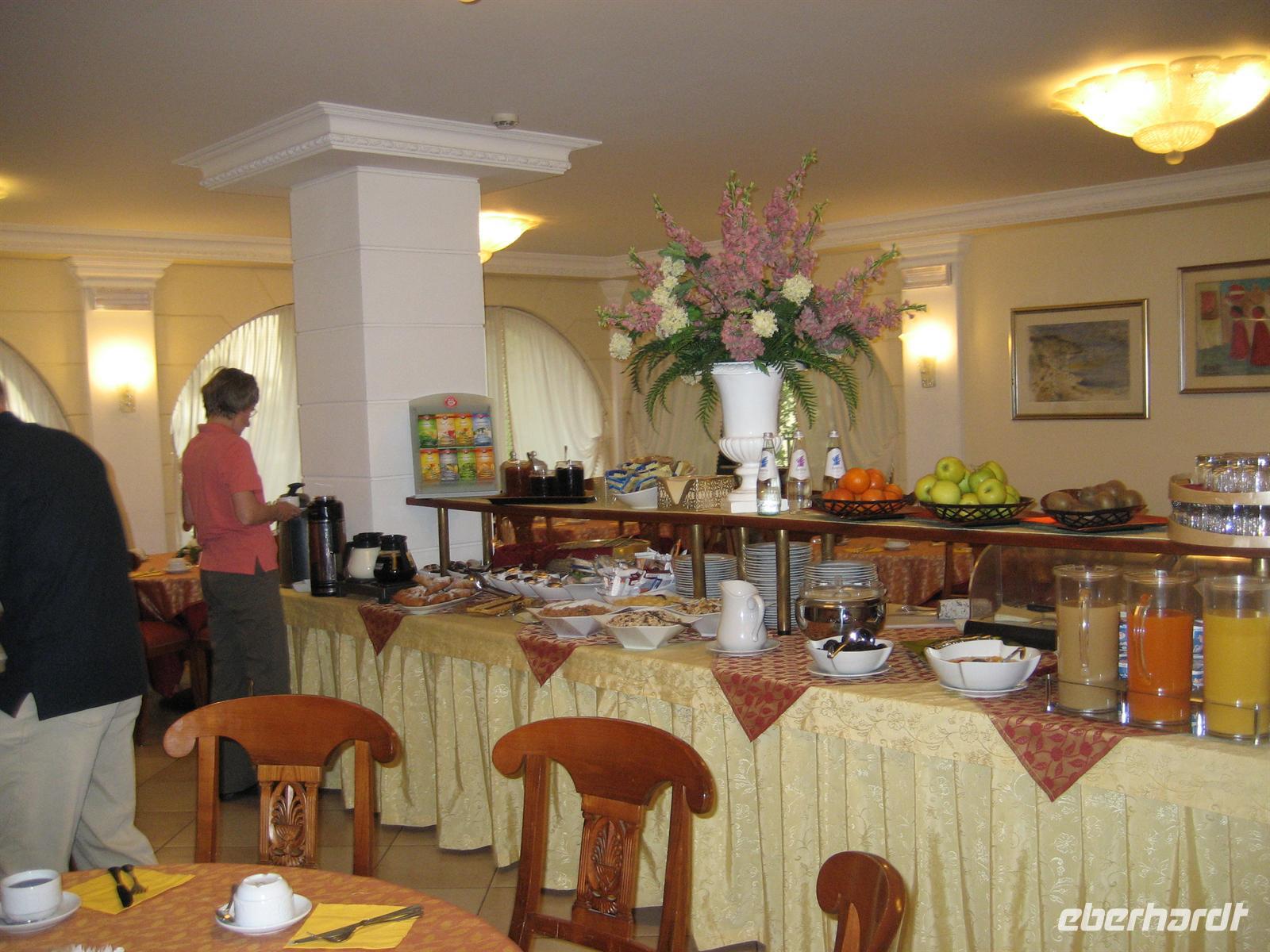 Ausgeruht und voller Tatendrang treffen wir uns zum Frühstück. Ein super Buffet erwartet uns. Wir haben genügend Zeit um uns zu stärken, aber dann kribbelt es doch dem Ein oder Anderen in den Beinen und so soll es losgehen. 9:00 Uhr begrüßt uns Daniel, unser örtlicher Radreiseleiter. Bei allen Radtouren werden wir zu zweit die Gruppe begleiten. Ein großer Vorteil, vor allem in punkto Sicherheit. Daniel ist hier zu Hause, kennt die besten Wege und ich werde am Schluss der Gruppe fahren, damit keiner verloren geht bzw. bei einer Panne immer jemand da ist. Gemeinsam fahren wir zunächst mit dem Bus an Bozen vorbei zum Karepass. Bei diesem Anblick müssen die Augen einfach strahlen. Wir sind auf ca. 1.745 m, die Gipfel sind verschneit, blauer Himmel, Sonnenschein und Laurins Rosengarten in den Dolomiten begrüßt uns in seinem ganzen Glanz. Das wohl schönste Fotomotiv für den heutigen Tag. Wir laden geschwind die Fahrräder aus, ziehen unsere Fahrradhandschuhe an, setzen den Helm auf und ab geht die Tour. Immer der Blick zu den Bergen der Dolomiten, geht die Fahrt hinunter zu grünen Wiesen und blühenden Bäumen, denn im Tal ist Frühling. Die Sonne meint es so gut mit uns, dass wir alle warmen Sachen in unsere Packtaschen verstauen können. Trinkpause, Fotostopp, ein erstes Gruppenbild - dies bestimmt die ersten Kilometer. In Cavalese an einem Rastplatz steht unser Bus, Ingo hat bereits Kaffee gekocht und Würstchen heiß gemacht. Das kleine nette Lokal hat leider heute geschlossen. Aus den Packtaschen kommen noch allerlei feine süße Sachen. Uns geht es gut! Nach einer schönen Pause im Sonnenschein ist es bis Molina nicht mehr weit, noch ca. 1 Std. Dort endet für heute der 1. Radtag. (Für Ilona ist die Tour leider schon jetzt zu Ende, 2x Plattfuß, da werden wir am Abend noch einmal gründlich nachsehen. Ilona und ich lassen uns etwas später mit dem Bus abholen). Wir verstauen die Räder im Radanhänger und rollen glücklich und zufrieden mit dem Bus Richtung Rovereto, aber noch nicht zum Hotel. Eine kleine Weinverkostung bei dem berühmten Radfahrer Francesco Moser rundet den Tag so richtig ab. Leicht beschwingt durch den Wein sind wir gegen 19:30 im Hotel. Uns bleibt noch etwas Zeit bis zum Abendessen.