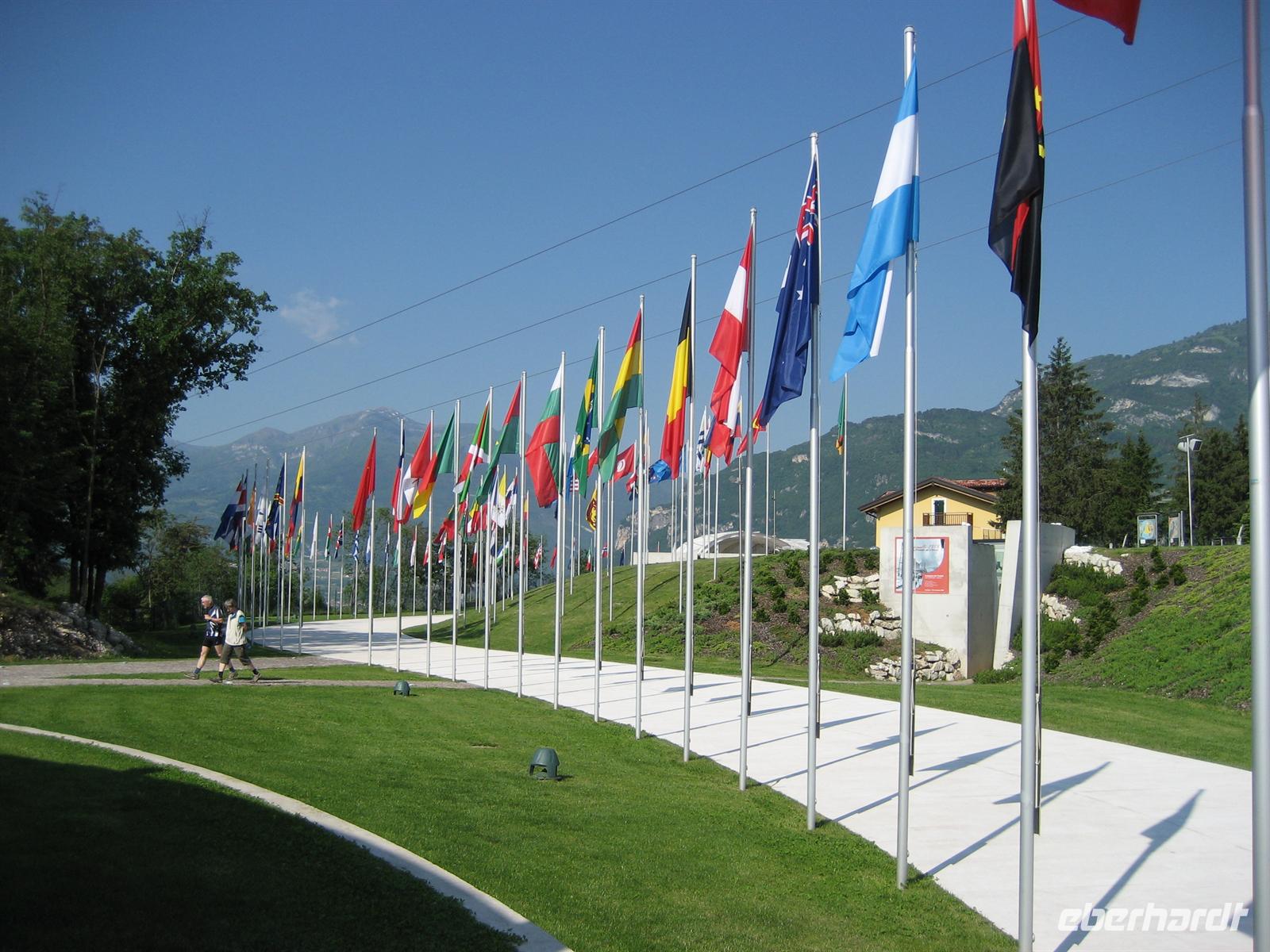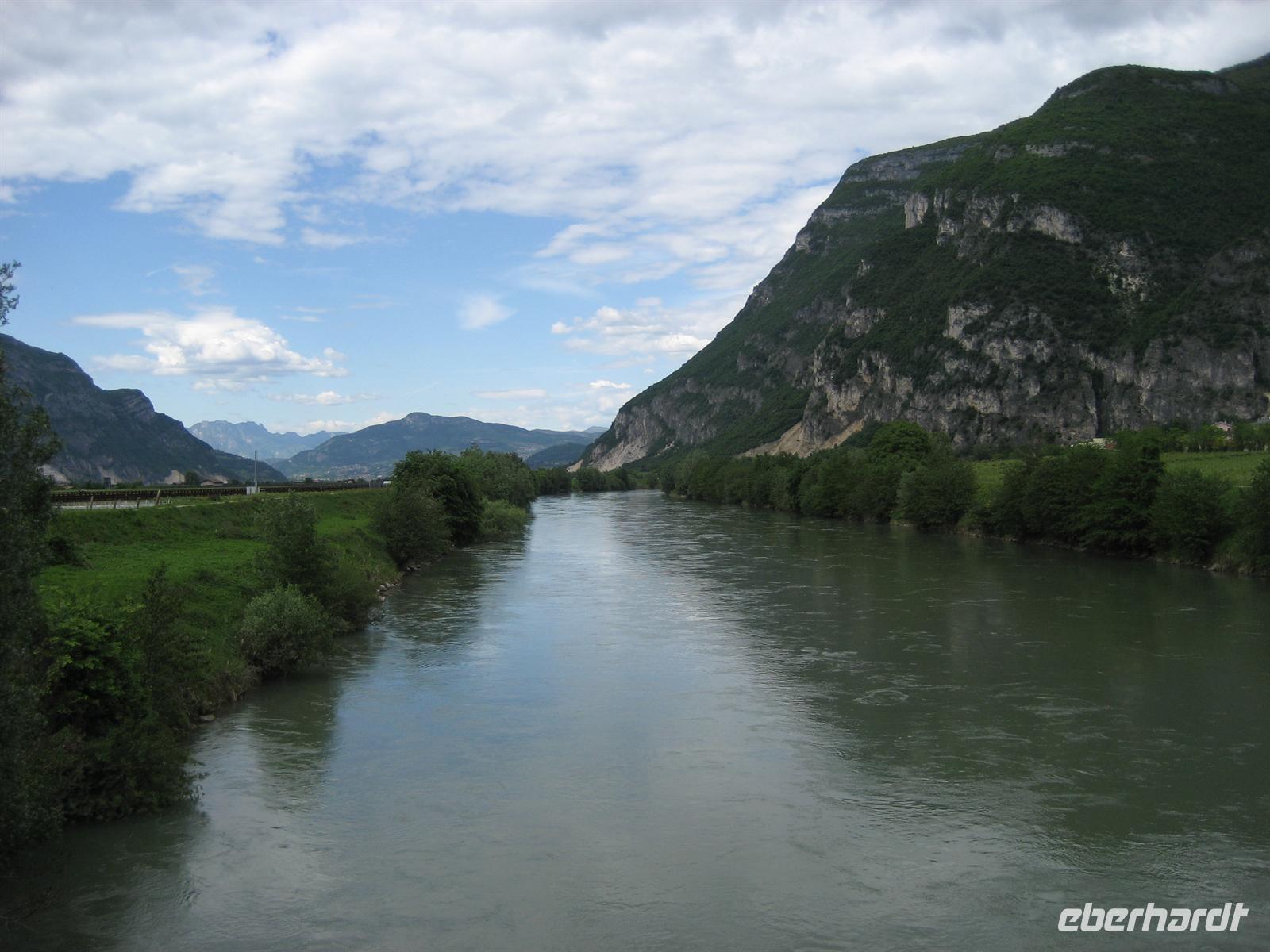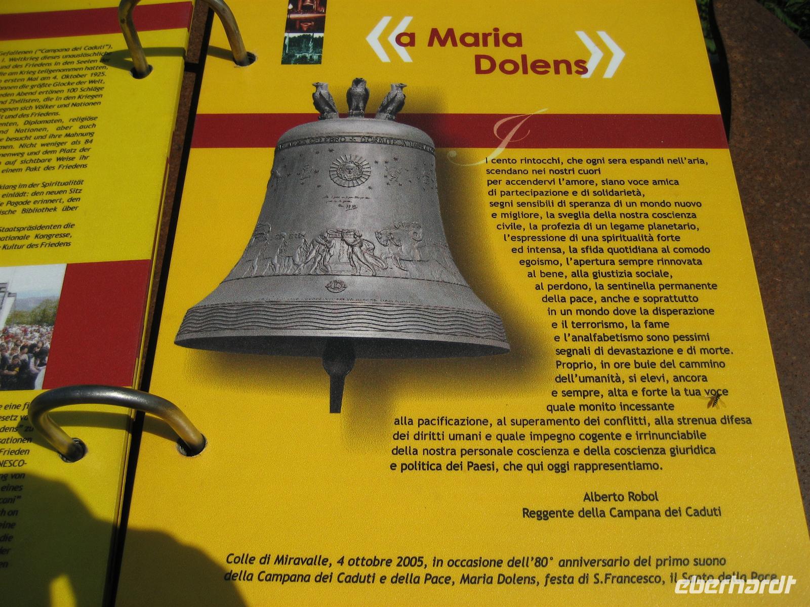 Da unsere Räder noch vom Vortag im Radanhänger verstaut sind, entschließen wir uns, die Friedensglocke in Rovereto zu besuchen. Jeden Abend konnten wir sie hören, nun wollen wir sie aus nächster Nähe sehen. 10 Min. fahren wir mit dem Bus auf den Berg hinauf. Ein Museum zur Geschichte dieser Glocke hat bereits geöffnet. Wir nehmen uns 1 Std. Zeit um dann unsere letzte Radtour zu beginnen. Ein langsames Abschiednehmen. Von der Friedensglocke aus kann man auf die Stadt sehen, die Burg Noarna liegt gegenüber, der Fluss schlängelt sich durch das Tal.