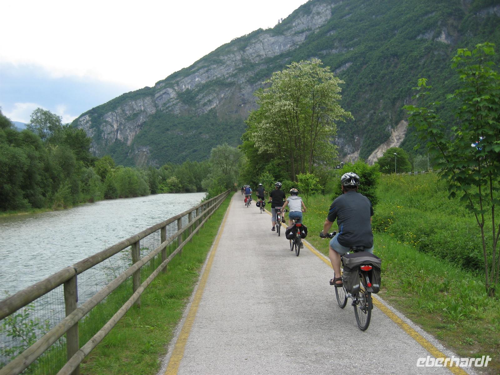 Nun geht es endlich auf die Räder, am Nocefluss entlang, ein sehr lebhafter Fluss. Der Radweg ist eben, Natur pur, Sonnenschein! So etwas erfreut die Radlerherzen. Manch einer radelt für sich, genießt einfach, andere tauschen sich aus und haben viel zu erzählen. Die Jüngeren wie auch die schon etwas Älteren ergänzen sich wunderbar, auch unsere alleinreisenden Radler sind nicht allein. Daniel unser "Anführer" hat immer wieder kleine Geschichten parat und ich kann das Ganze von hinten beobachten, gebe kleine Tipps zum richtigen schalten am Berg. So vergeht die Zeit und so mancher Kilometer wird zurückgelegt. Ein Vergleichen beim Einladen der Räder sagt uns ca. 40 km - es war wieder schön. Am Hotel angekommen verbringt jeder die freie Zeit anders, bummeln in der Stadt, Karten kaufen, ausruhen. Zum Abendessen gehen wir dann wieder gemeinsam. Ein guter Wein, ein gutes Essen, schon sind alle wieder neugierig auf den nächsten Tag.