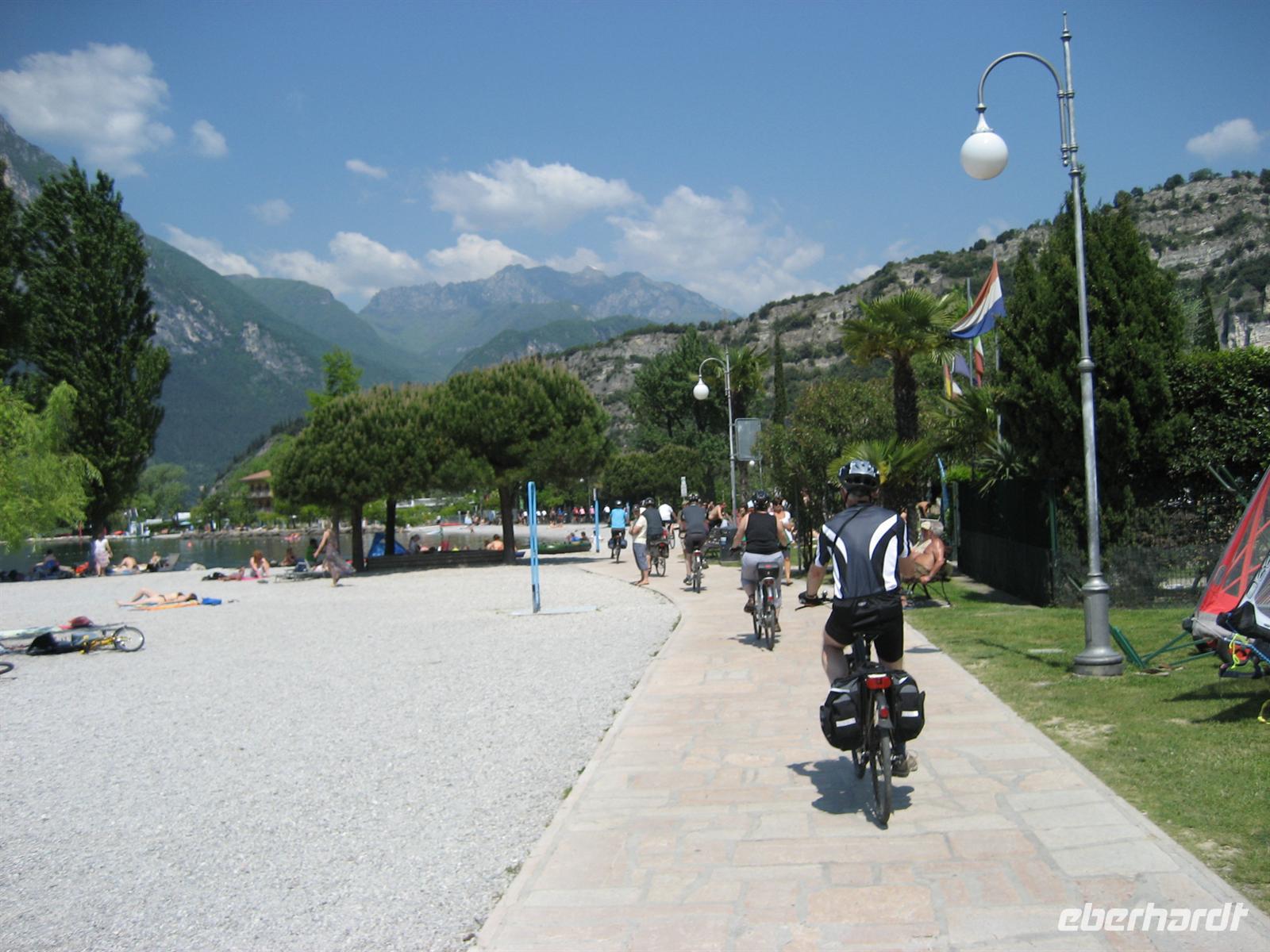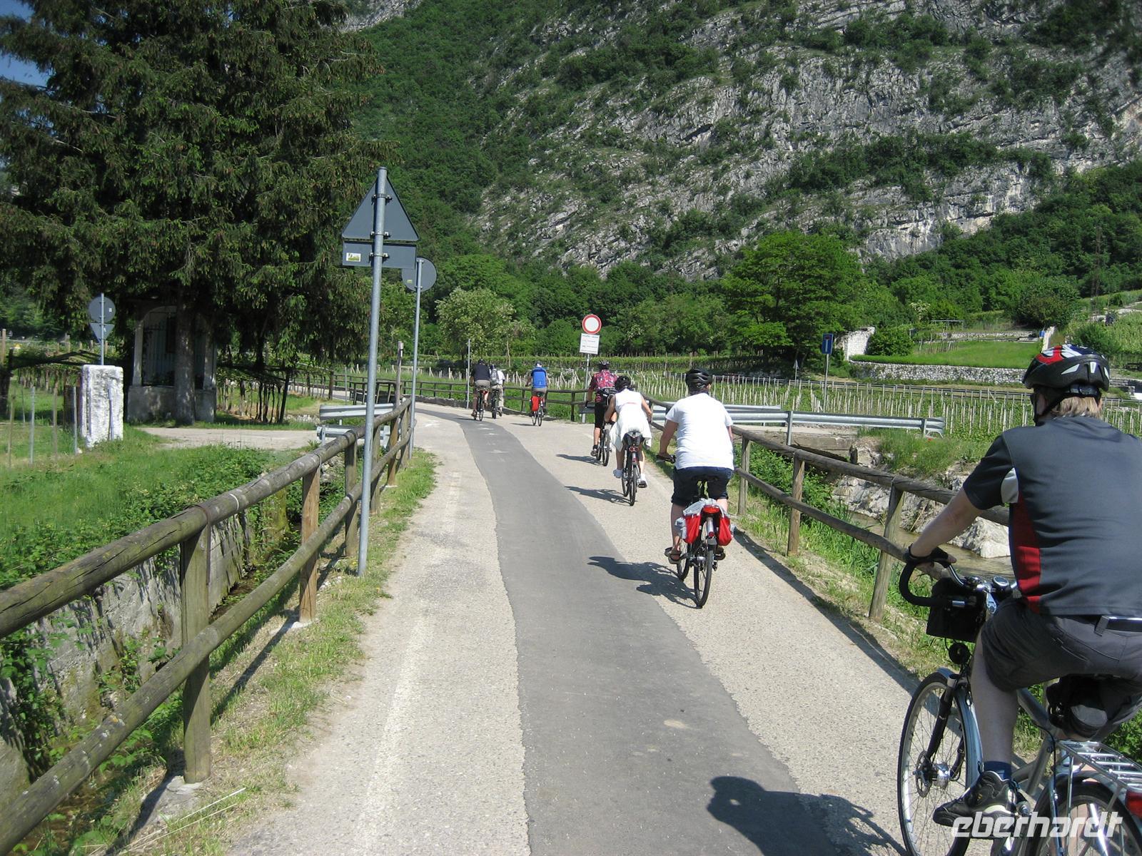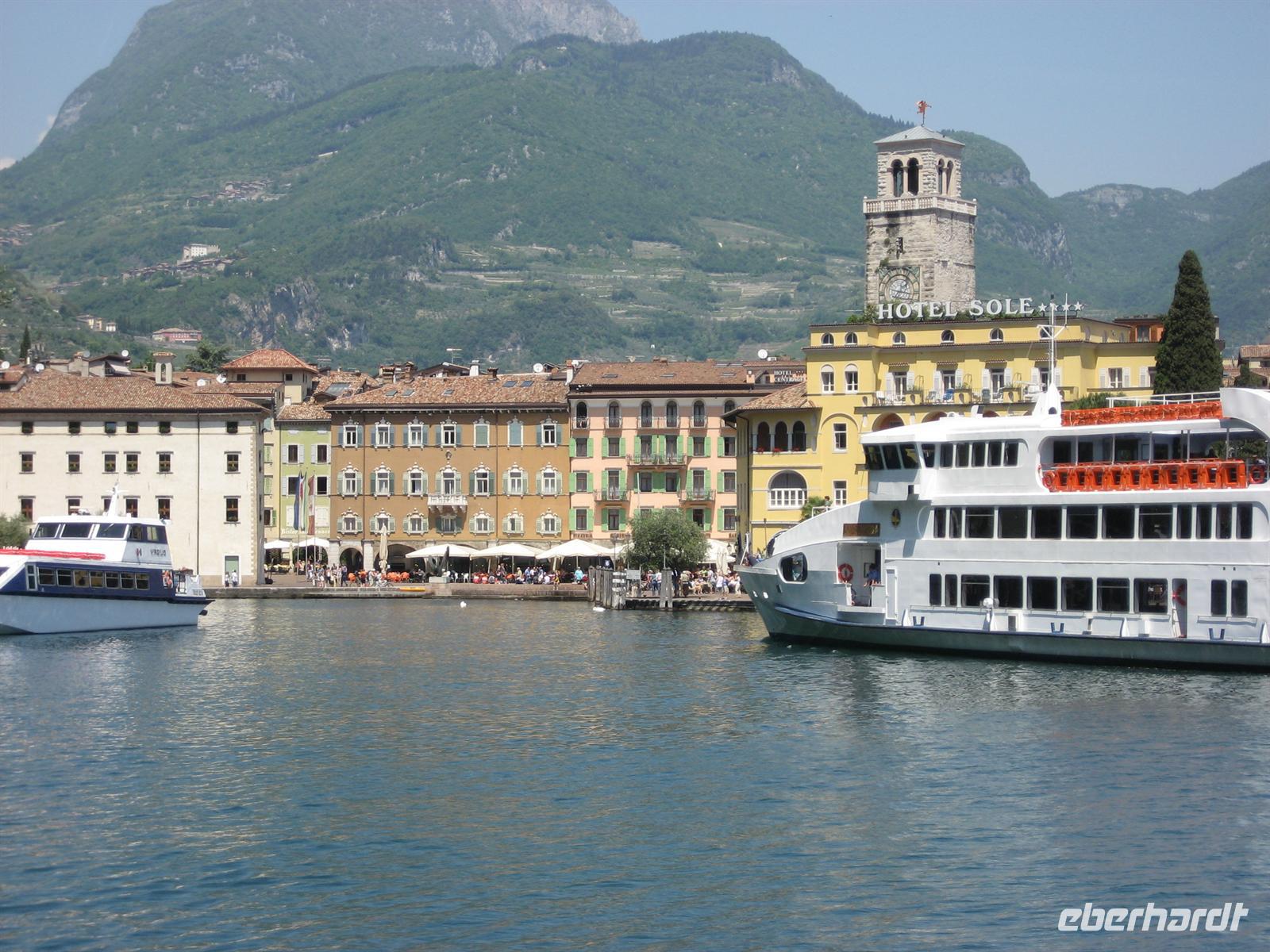 Unsere letze Radtour führt uns heute ca. 15 km zunächst am Ufer der Etsch entlang, dann durchfahren wir ein riesiges Weinanbaugebiet bevor wir uns dem Fluss abwenden und unsere Muskelkraft in den Oberschenkel gefragt ist. Jeder kennt den Spruch "wer sein Rad liebt, ...". Als wir aber in Torbole ankommen ist diese einzige Schiebestrecke (ca. 5 Min.) ganz schnell vergessen. Der Blick zum Gardasee hinunter ist einfach herrlich und belohnt uns für die Anstrengungen. Solche Abschnitte der Strecke kann man nur so erleben, wenn man per Rad oder auch zu Fuß unterwegs ist. Den Berg hinunter fahren alle ganz langsam, diesen Anblick will jeder so lang wie möglich erleben. In Riva del Garda endet heute schon unsere Fahrradtour. Eine Schifffahrt auf dem Gardasee erwartet uns, das Ziel wird Malcesine sein.