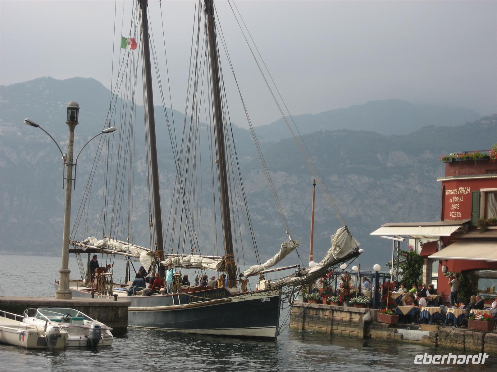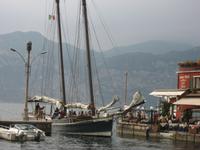 Langsam müssen wir Abschied nehmen von den traumhaften Tälern des Trentino. An unserem letzen Radtag fahren wir gen Süden an dien größten italienischen See - den Gardasee. Zu Beginn radeln wir ca. 15 km zunächst am Ufer der Etsch entlang, durchqueren anschließend ein riesiges Weinanbaugebiet bevor wir uns dem Fluss abwenden und unsere Muskelkraft in den Oberschenkel gefragt ist. Jeder kennt den Spruch "Wer sein Rad liebt, ...". Als wir aber in Torbole ankommen ist diese einzige Schiebestrecke (ca. 5 Min.) ganz schnell vergessen. Der Blick zum Gardasee belohnt für die Anstrengungen. Solche Eindrücke eröffnen sich nur denjenigen, die abseits der Touristenrouten per Rad oder gar zu Fuß unterwegs sind. Bergab radeln alle ganz langsam, um diesen Anblick so lang wie möglich genießen zu können. In Riva del Garda endet heute schon unsere letzte Fahrradtour. Eine Schifffahrt auf dem Gardasee erwatet uns, das Ziel wird Malcesine sein.