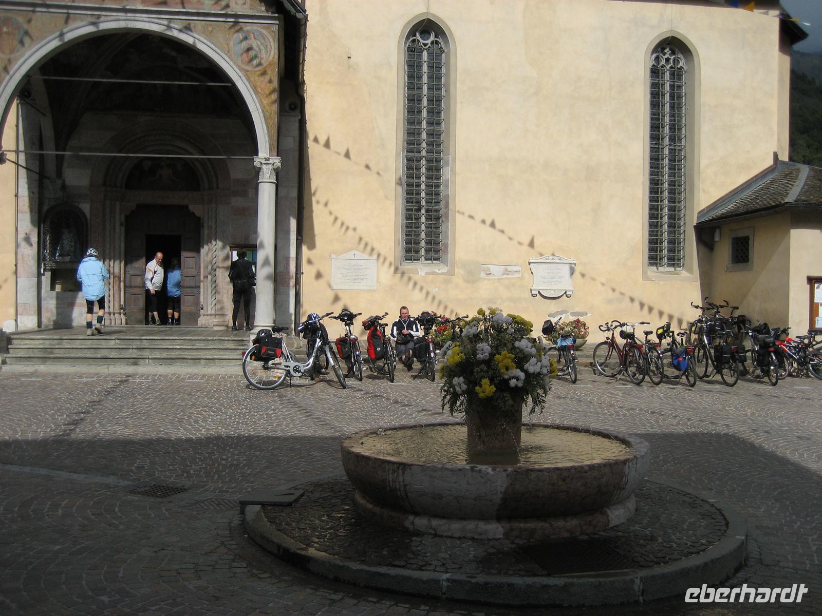 Das Frühstück war wie immer sehr reichlich und gut, doch leider meint es das Wetter heute nicht gut mit uns. Vom Himmel kommt jede Menge Wasser, so entscheiden wir uns für eine Fahrt mit dem Bus nach Trient. Im Regenmantel oder mit einem Schirm bewaffnet, beginnen wir unsere Stadtführung mit Daniel. Gegen Mittag schaut die Sonne zaghaft hinter den Wolken hervor. Nach ausreichend Freizeit in Trient treffen wir uns alle auf dem Domplatz am Brunnen. Ein verregnetes Gruppenbild entsteht, ehe wir es wagen auf die Räder zu steigen. Der Himmel meint es langsam gut mit uns, sodass wir zurück nach Rovereto radeln. Die Fahrradklingel gibt das Zeichen zum Abfahren, wir wollen heute pünktlich im Hotel sein. Am Abend wird es auf der Burg Noarna ein kleines Fest geben. Kerzenschein, Kaminfeuer, ein schmackhaftes Abendessen wie im Mittelalter. Musik und Tanz lassen den Tag ein Erlebnis sein. Bei so viel Romantik hat es unser Busfahrer schwer, alle in den Bus zu locken.