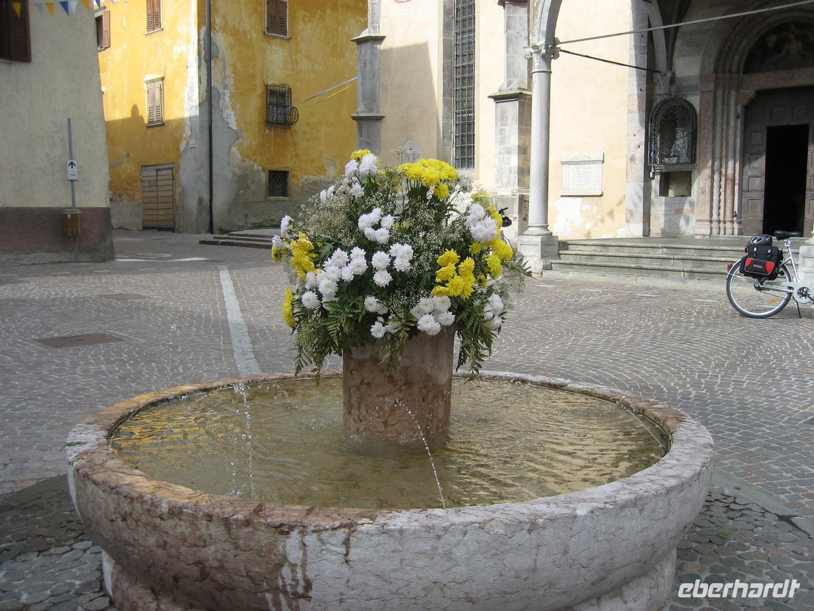 Die Sonne strahlt heute wieder und unsere Laune steigt augenscheinlich. Die heutige Radtour beginnen wir gleich am Hotel. Sie führt uns durch das Weinanbaugebiet des berühmten "Marzemino". Ein letztes Mal folgen wir der Etsch (Adige). Die historische Mozartstadt "Ala" verbreitet sehr viel Charme aus vergangenen Zeiten als die Herstellung von Seide und Samt dominierten. Alte Palazzi präsentieren sich liebevoll restauriert, die Gärten in den Hinterhöfen sind mit wunderschönen Rosenstöcken verziehrt. Wir wandeln gedanklich in schönen Kleidern, in Wirklichkeit haben wir Radlerhosen an und sind bestimmt nicht ganz so schick anzusehen. Es macht Spaß. 1 Stunde noch dann ist diese Radtour vorbei. In Borghetto erwartet uns in einem Landestypischen Weinlokal ein kleiner Mittagsimbiss. Ich vernehme anregendes Stimmengewirr aus dessen Gesprächen man allerlei heraushören kann. Eine gelungene Radreise! Die Sonne lacht immer noch, das Essen war gut, alle möchten mit den Rädern zurück nach Rovereto. Mit Rückenwind sind wir in 2 Stunden schon wieder am Ziel. Es bleibt noch genügend Zeit, sich bis zum Abendessen auszuruhen oder auch durch die Stadt zu spazieren.