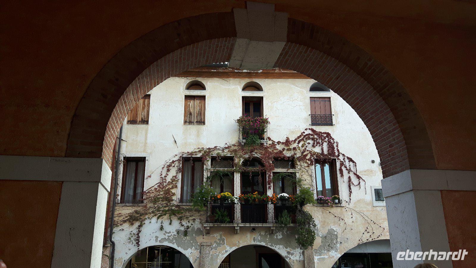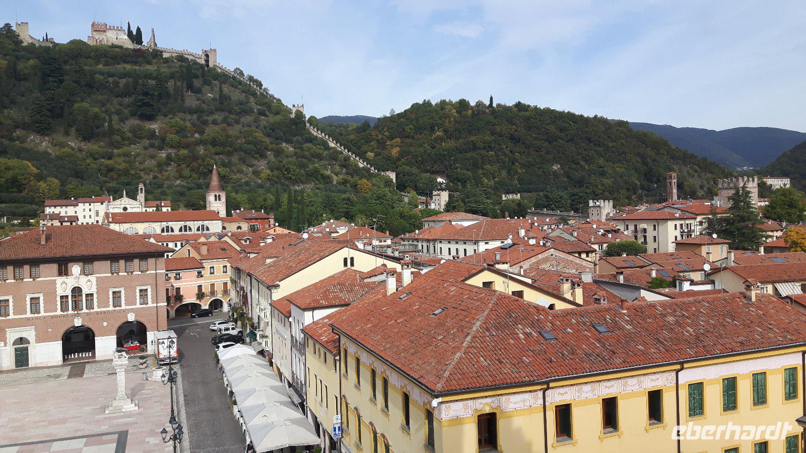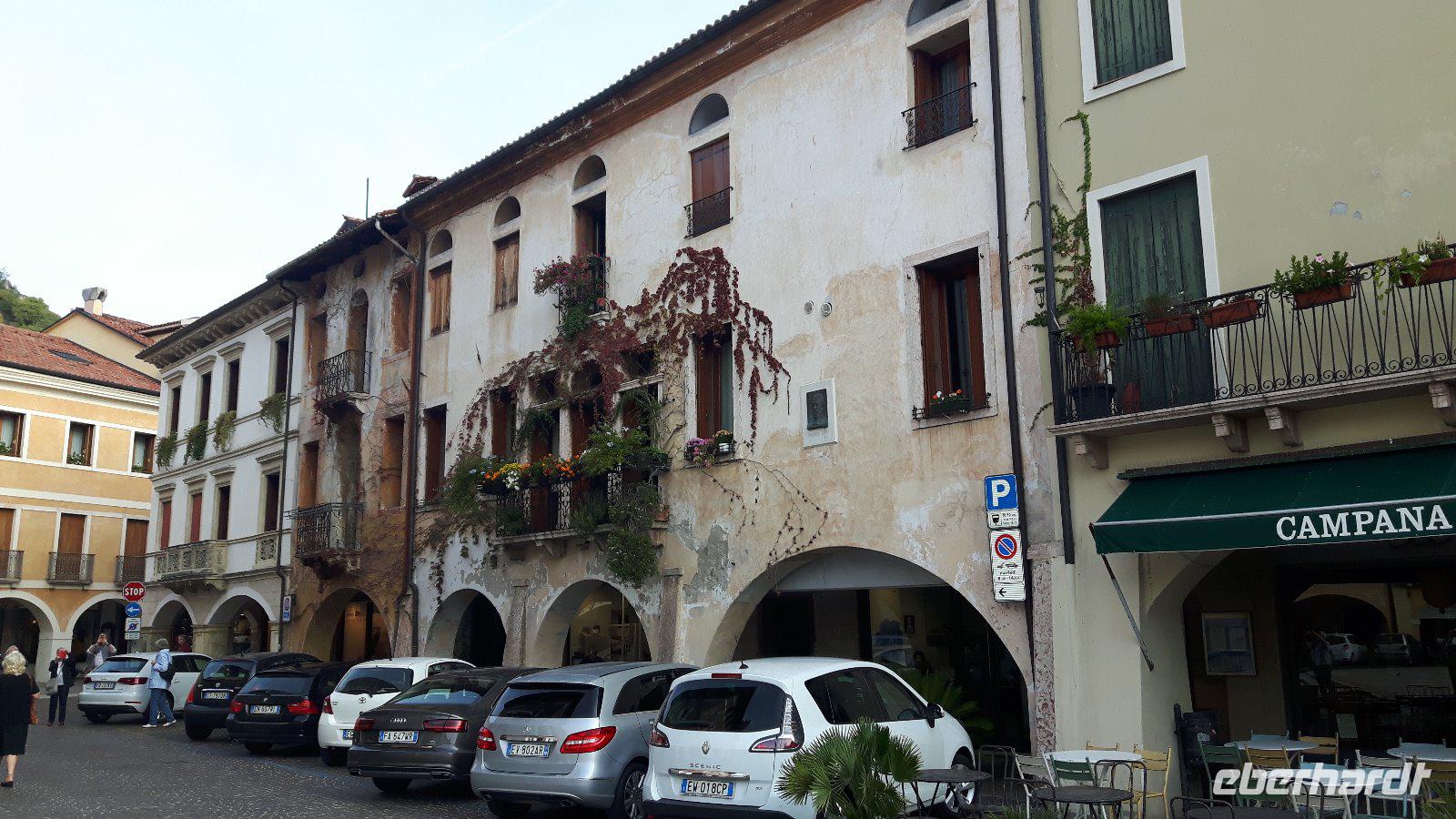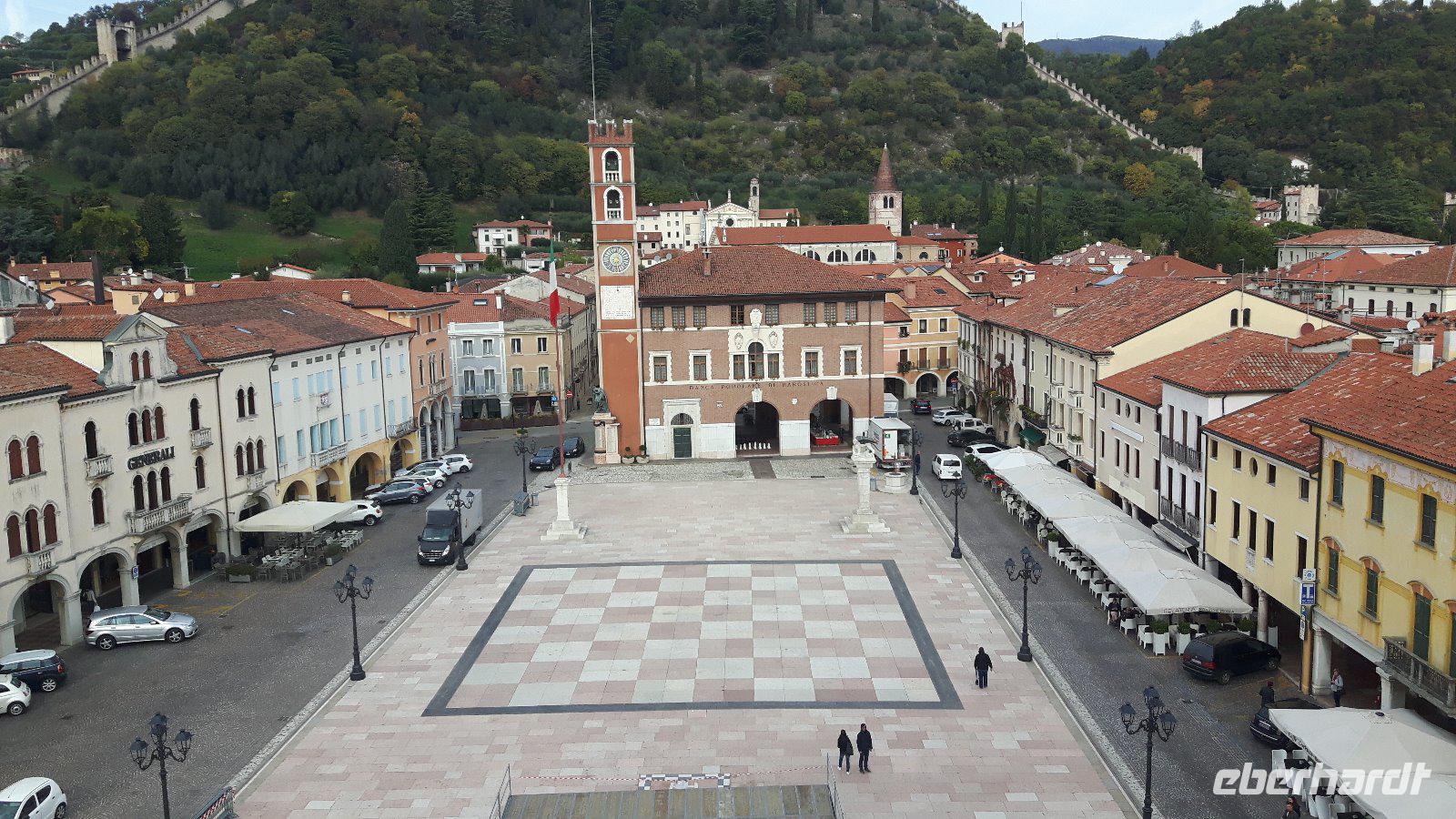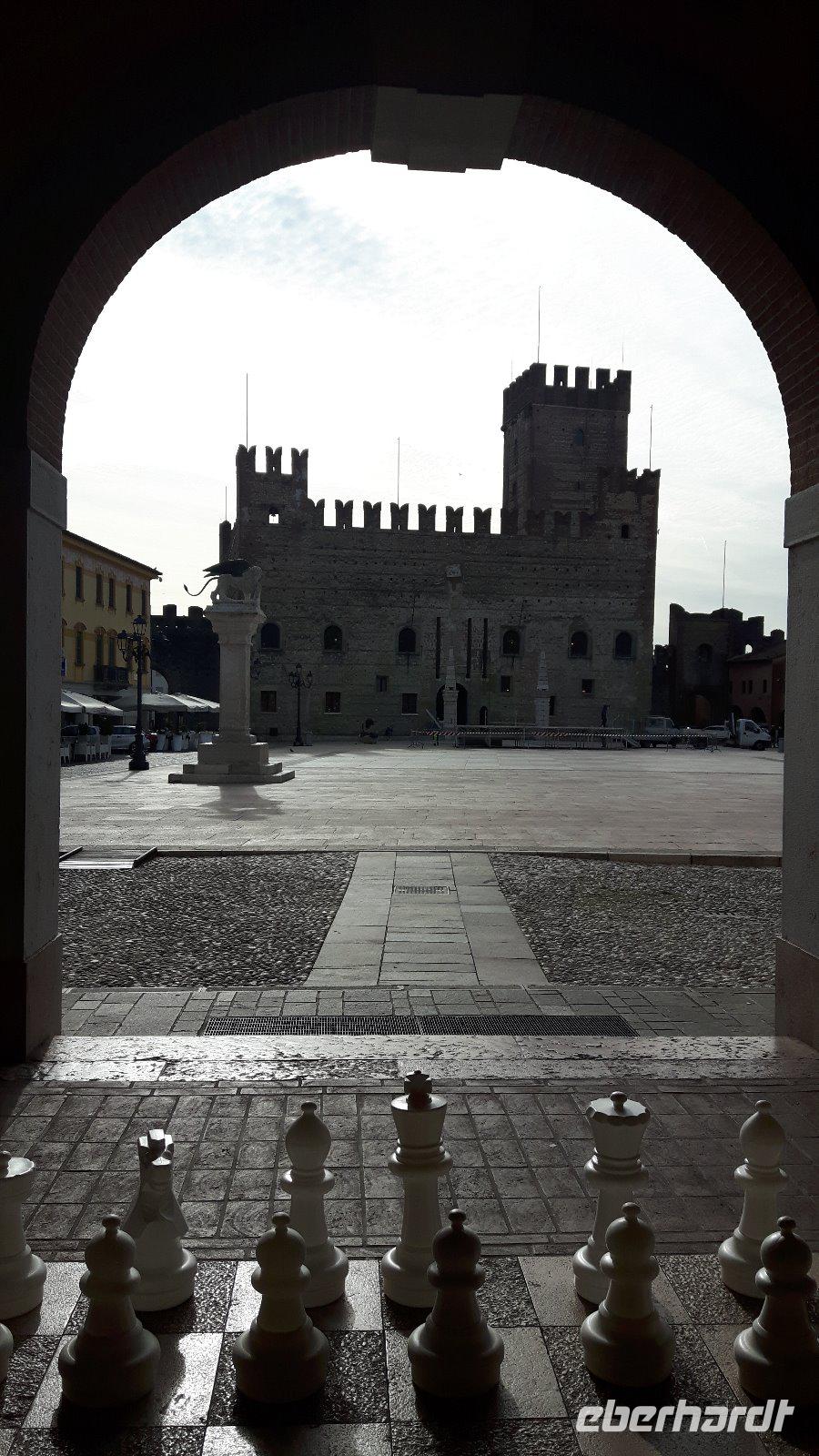 Gegen 9 Uhr brachen wir gemeinsam mit unserer einheimischen Reiseleiterin Anna in die Nachbarregion Venetien auf. Wir erhielten bereits auf der Fahrt viele wissenswerte Informationen zur Gegend und ließen die Landschaft des Valsugana ganz einfach nur auf uns wirken. Zunächst legten wir einen längeren Aufenthalt im mittelalterlich geprägten Ort Marostica ein, wo wir einen Spaziergang über den Hauptplatz mit seinem "Schachbrett" unternahmen. Hier gibt es immerhin so einiges, was mit einem Schachspiel zu tun hat, zum Beispiel das Fest mit menschlichen Spielfiguren auf diesem riesigen marmorverkleideten Schachbrett-Platz. Das menschliche Schachspiel von Marostica hat antike Wurzeln und wird mit einer lokalen Legende in Verbindung gebracht. Diese Veranstaltung muss ein absolutes Spektakel sein...! Live erleben konnten wir es zwar heute nicht, aber zumindest konnte sich der ein oder andere im Schachspiel ausprobieren!