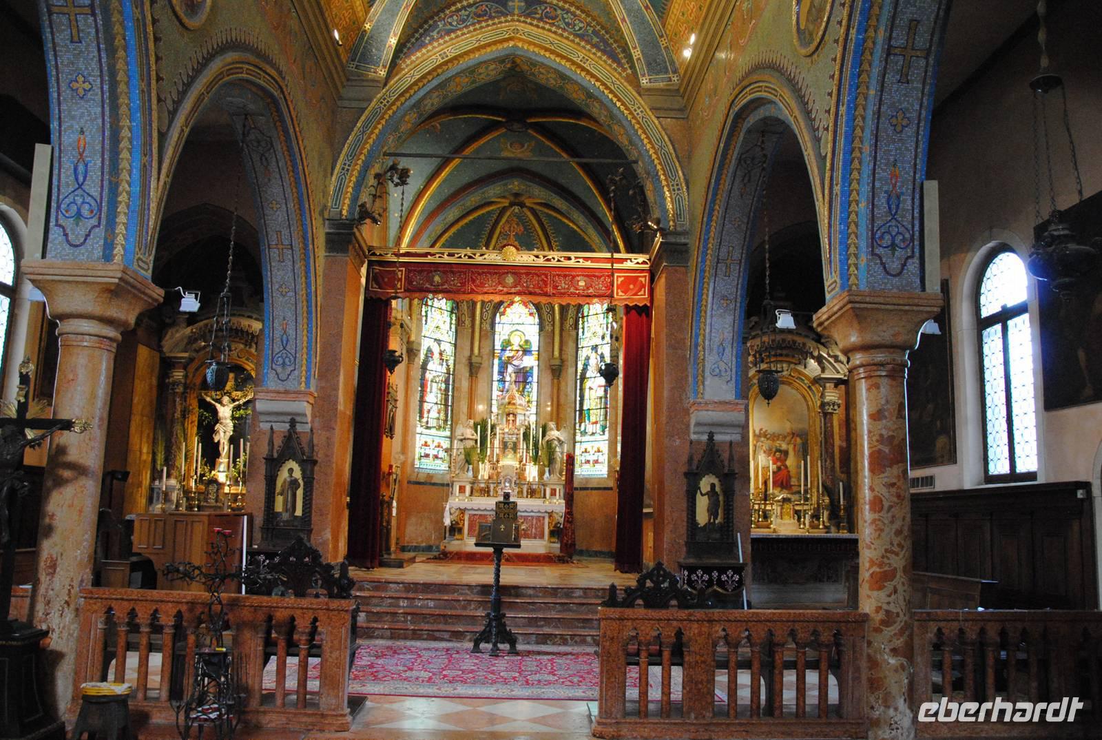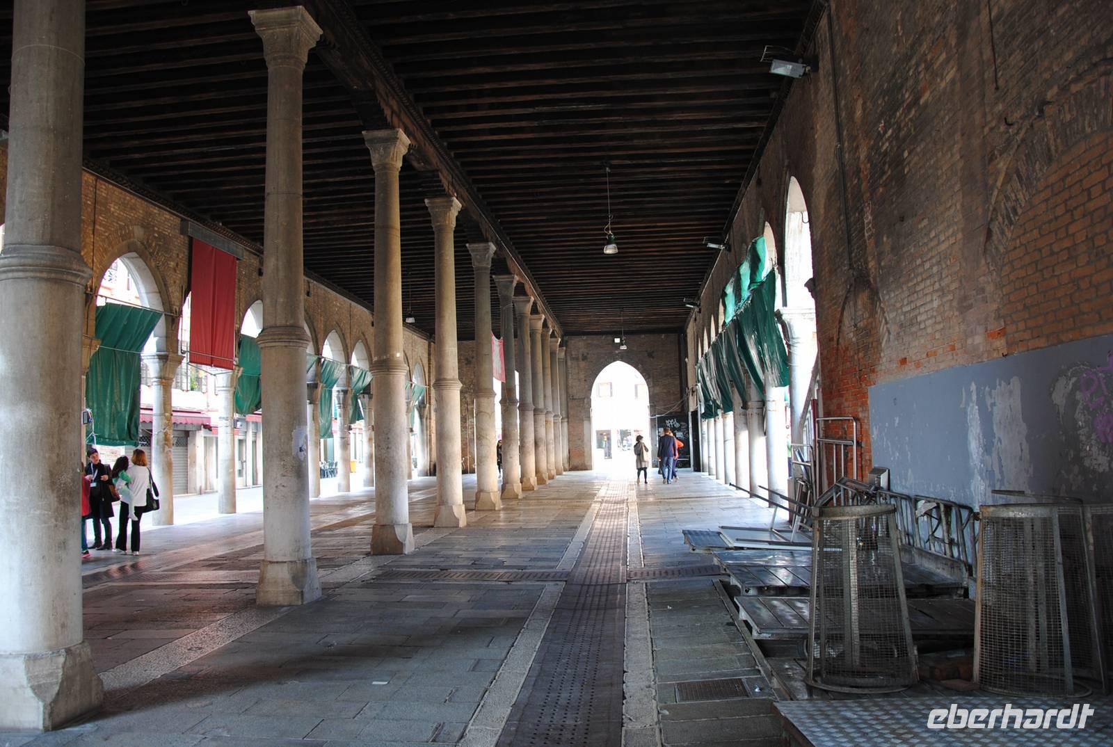 Durch verwinkelte Gassen marschierten wir in Richtung Rialtobrücke und ohne darauf vorbereitet zu sein öffnete sich plötzlich der Blick auf den Canal Grande. An der Rialtobrücke angekommen überquerten wir diese. Gleich daneben ist der Rialtomarkt mit seiner Fischhalle und den unzähligen Obstständen. Zu so manchem Gebäude wurden die Kuriositäten zum Besten gegeben. Die Deutsch/Venezianischen Handelsbeziehungen konnte man durch das imposante Gebäude Fondaco del Tedeschi nur erahnen. Ein Höhepunkt des heutigen Rundgangs stellt die prunkvollen Fassaden des Ca'd'Oro (Goldenes Haus) dar. Aber auch diese Villa ist in die Zeit gekommen und das Gold muss man schon fast mit der Lupe suchen. Aber die Architektur wirkt dennoch ansprechend. Am Ende der Besichtigung durch den Stadtteil San Pauolo besichtigten wir die Frari-Kirche. Vorbei am Wohnhaus von Goldoni erreichten wir diese. Von Außen eher unscheinbar, wirkt sie im Inneren umso mächtiger. Ob es die Gemälde von Tizian oder die verschiedenen Monumente waren, es machte jedem bewusst, wie klein doch der Mensch in seinem irdischen Leben ist. Eine Besonderheit ist das Chorgestühl der Kirche, da es diverse Stadtansichten zeigt. Jeder Sitzplatz ein wahres Kunstwerk. Ein erlebnisreicher Vormittag geht dem Ende zu. Kurz vorher streiften wir noch die Scuola Rocco, die mit zahlreichen Gemälden von Tintoretto aufwarten konnte.