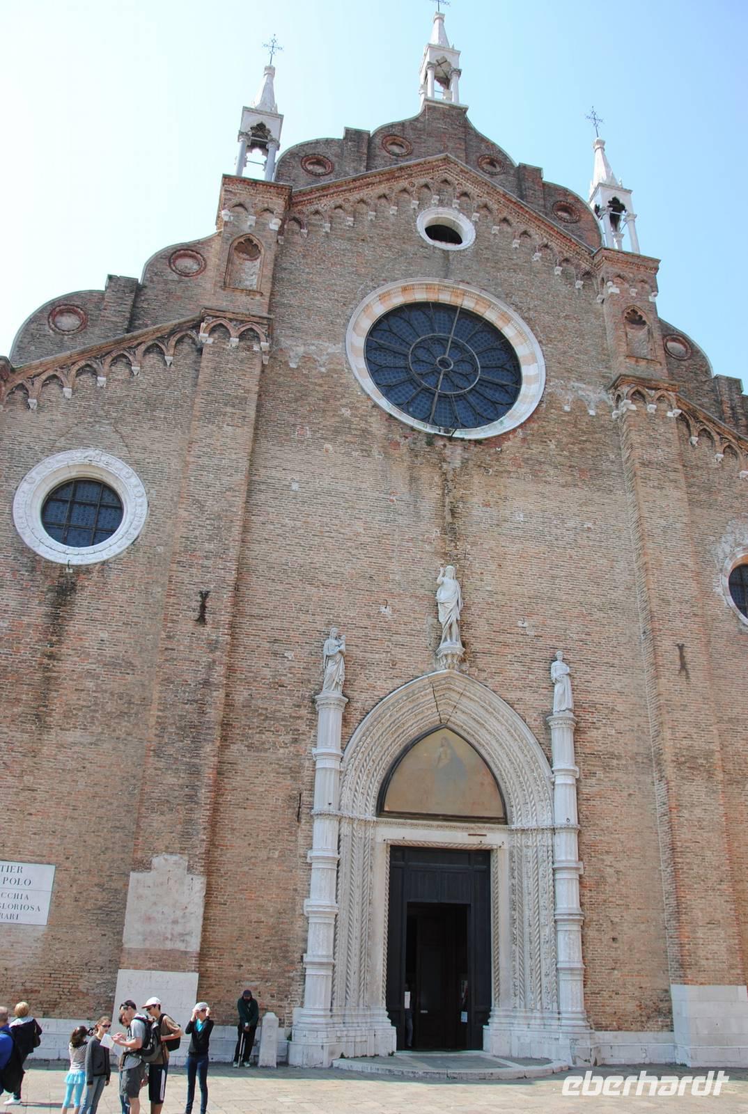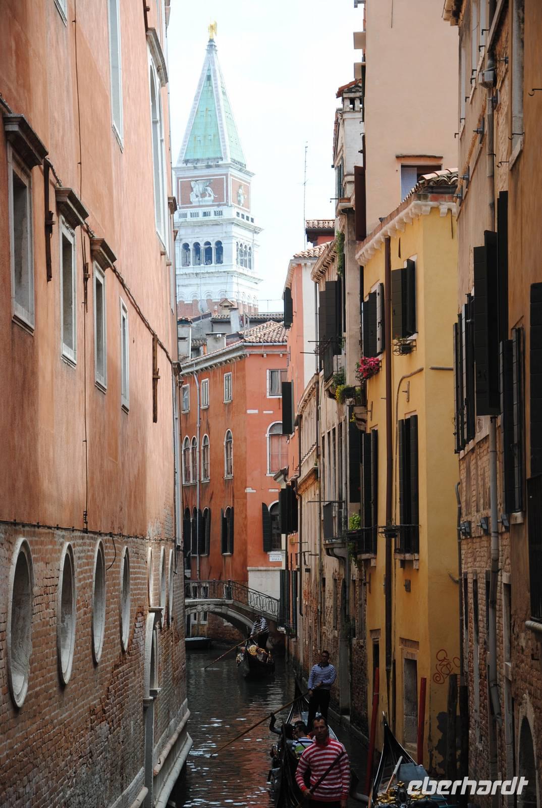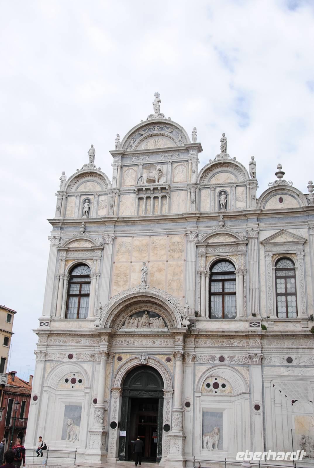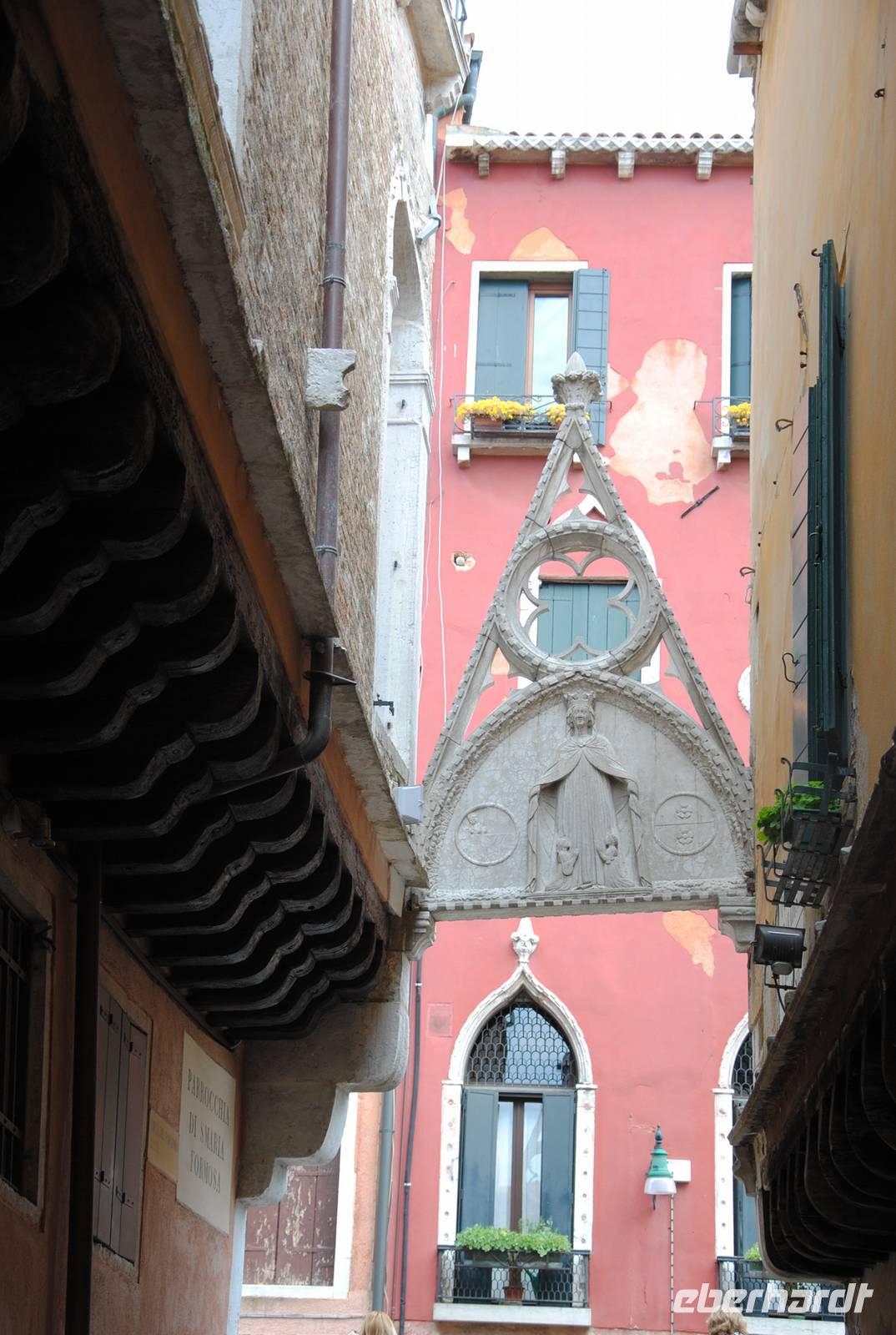 Noch einen Blick auf Uhrenturm und Campinelle und dann verließen wir die Piazza über die Ala Napolitanica. Vorbei am größten Gondelhafen ging es durch viele kleine Gassen in Richtung Kirche Santi Giovanni e Pauolo, eine Prachtkirche der Dominikaner. Gleich neben an ist die Scuola Grande di San Marco mit seiner herrlichen Fassade. Heute beherbergt dieses Gebäude ein Krankenhaus. Nur wenige Schritte weiter und wir sind an der Kirche San Maria die Miracoli. Keine Werbung für Spaghetti, sondern ein Wunderwerk der Frührenaissance. Anlass für den Bau war das Geschenk eines wundertätigen Marienbildes. Und noch heute geht noch so manche Venezianerin mit der Bitte um Nachwuchs dort hin. Entlang des Weges kamen wir auch am Haus von Canaletto, der auch in Dresden wirkte vorbei.