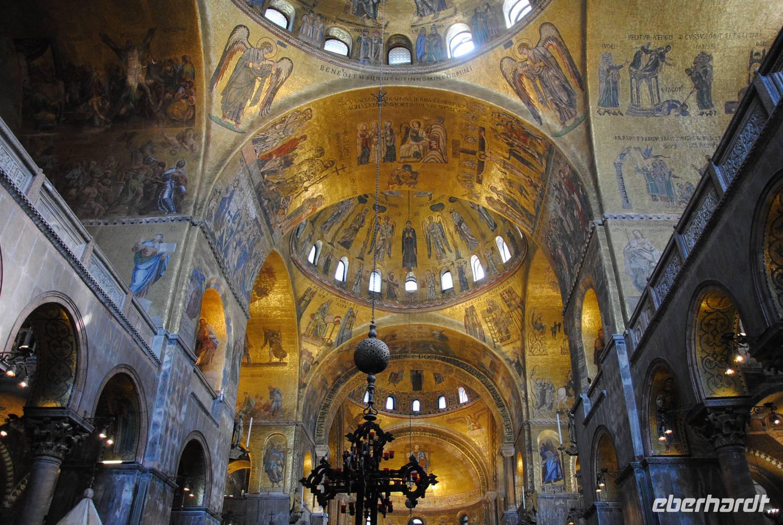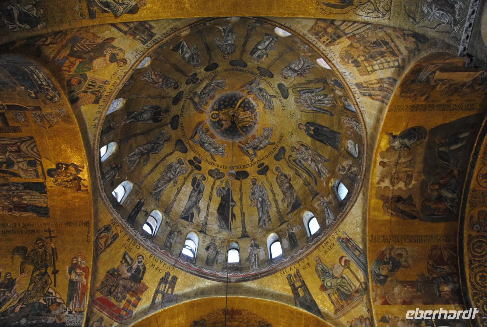 Nur wenige Schritte von der Kirche und wir waren an der Spitze des Stadtteils Dorsoduro. Hier kann man bestens den Blick über den Canal Grande schweifen lassen Nicht über die Ponte Accademica sondern mit einer Gondel dem so genannten Traghetto setzten wir ans andere Ufer über und gingen durch die Gassen in Richtung Markusplatz. Dort waren wir heute mit Alessia zum Rundgang durch San Marco verabredet. Unsere Führung begann an der Piazetta vor den mächtigen Säulen, die einst die Zufahrt zur Stadt darstellten. Als Hinrichtungsstätte diente der Platz zwischen den Säulen und deshalb meiden es die Einheimischen zwischen den Säulen hindurch zu gehen. Der Dogenpalast, lange Zeit das Machtzentrum der Stadt, besticht durch die beeindruckende Architektur im Stil der byzantinischen Gotik. Natürlich durfte ein Besuch der Basilika San Marco mit seinen wunderschönen Mosaiken und dem besonderen Marmorboden (geometrische fast 3D-wirkende Formen) nicht fehlen.