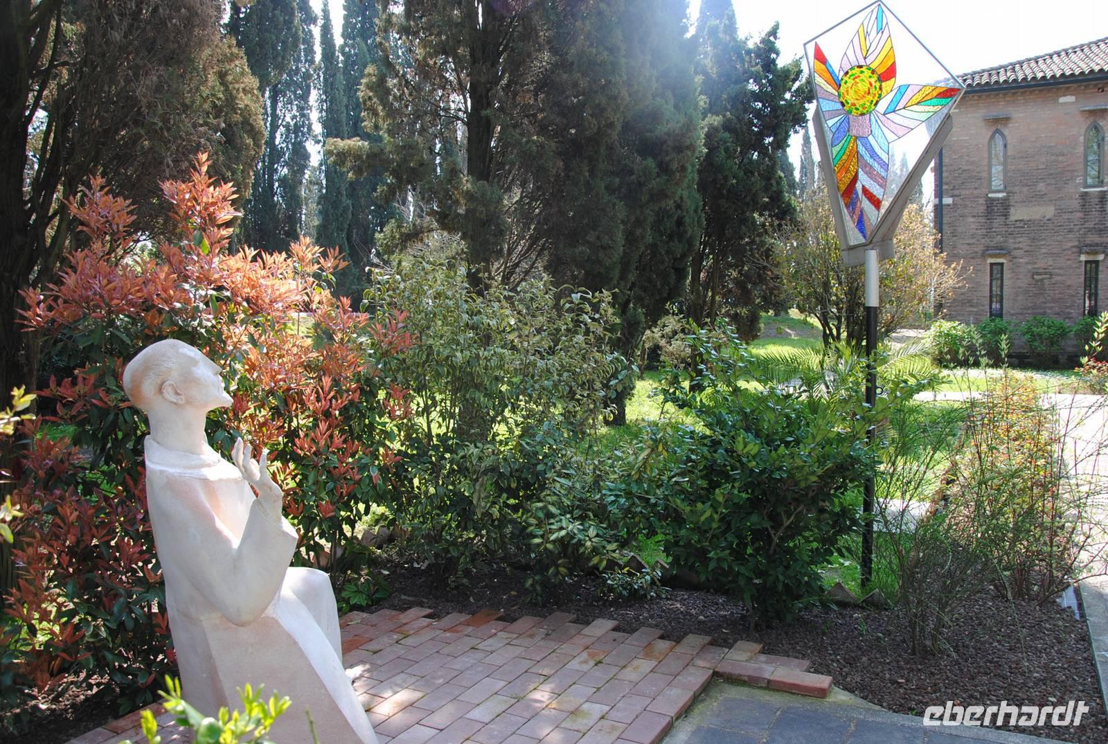 Nach dem Frühstück machte sich die Gruppe heute etwas zeitiger auf den Weg in Richtung Anlegestelle Zattere. Dort wartete schon unser Boot, das uns heute auf interessante Inseln der Lagune brachte. Zunächst ging es an den bekannten Orten Venedigs vorbei. Unser erster Stopp war die Insel San Francesco del Deserto. Hier sind zwar keine Kostbarkeiten zu besichtigen aber der herzliche Empfang des Franziskaners mit seinen interessanten Erzählungen rund um den Hl. Franz von Assisi entschädigte uns voll und ganz. Der Legende nach erholte sich hier der Hl. Franziskus von einer strapaziösen Reise aus Palästina und wir konnten hier nachempfinden warum. Es war eine Wohltat, gerade nach der Hektik auf dem Markusplatz vom Vortag.