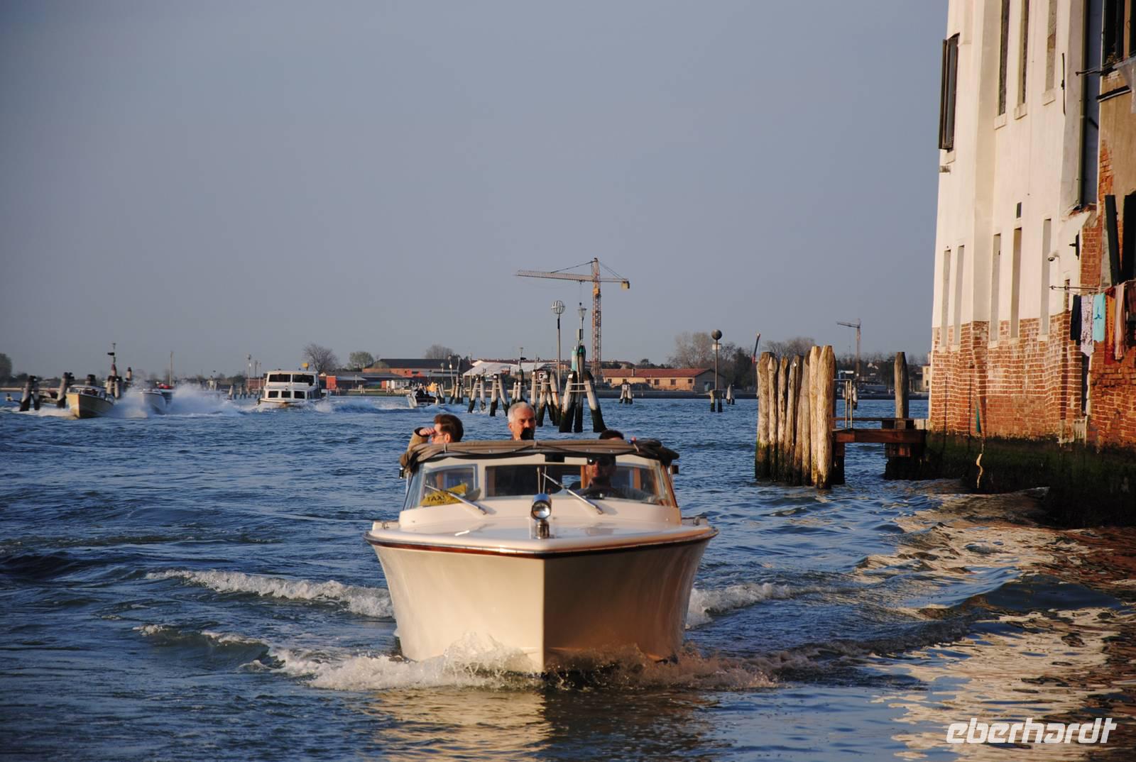 Nach und nach trafen sich alle mit Ihren Koffern im Hotelgarten und gegen Mittag machte man sich auf dem Weg in Richtung Campo San Vio. Im Schatten der Gebäude warteten wir dann auf die bestellten Boottaxis, die auch pünktlich kamen. Die letzte Fahrt durch die Kanäle der Lagunenstadt und dann in Richtung Flughafen warfen wir einen letzen Blick auf die Silhouette der schönen Stadt Venedig.