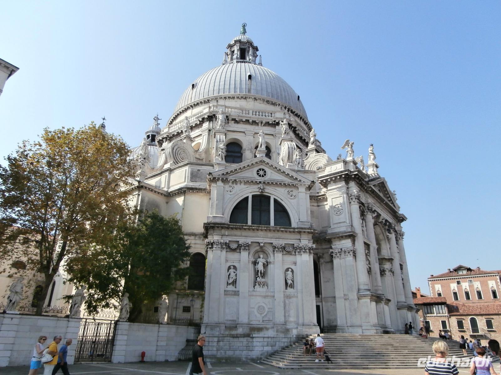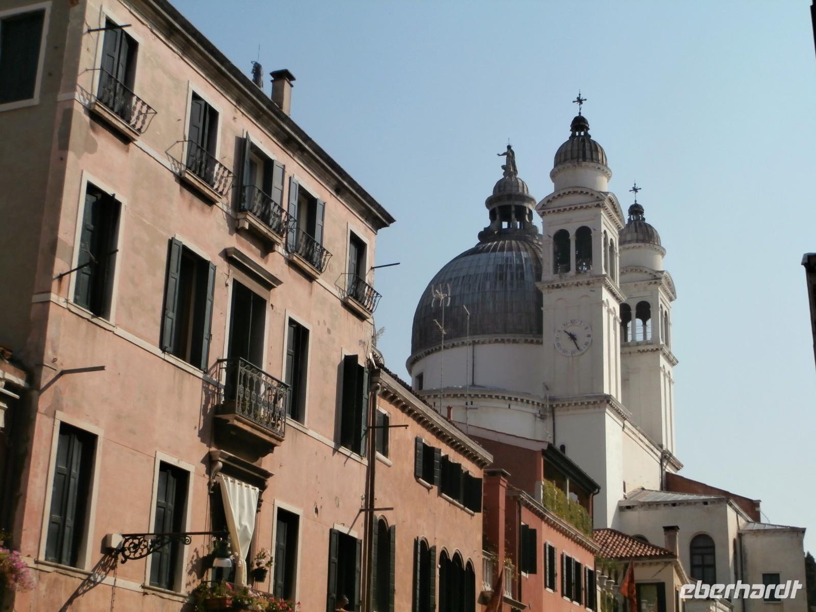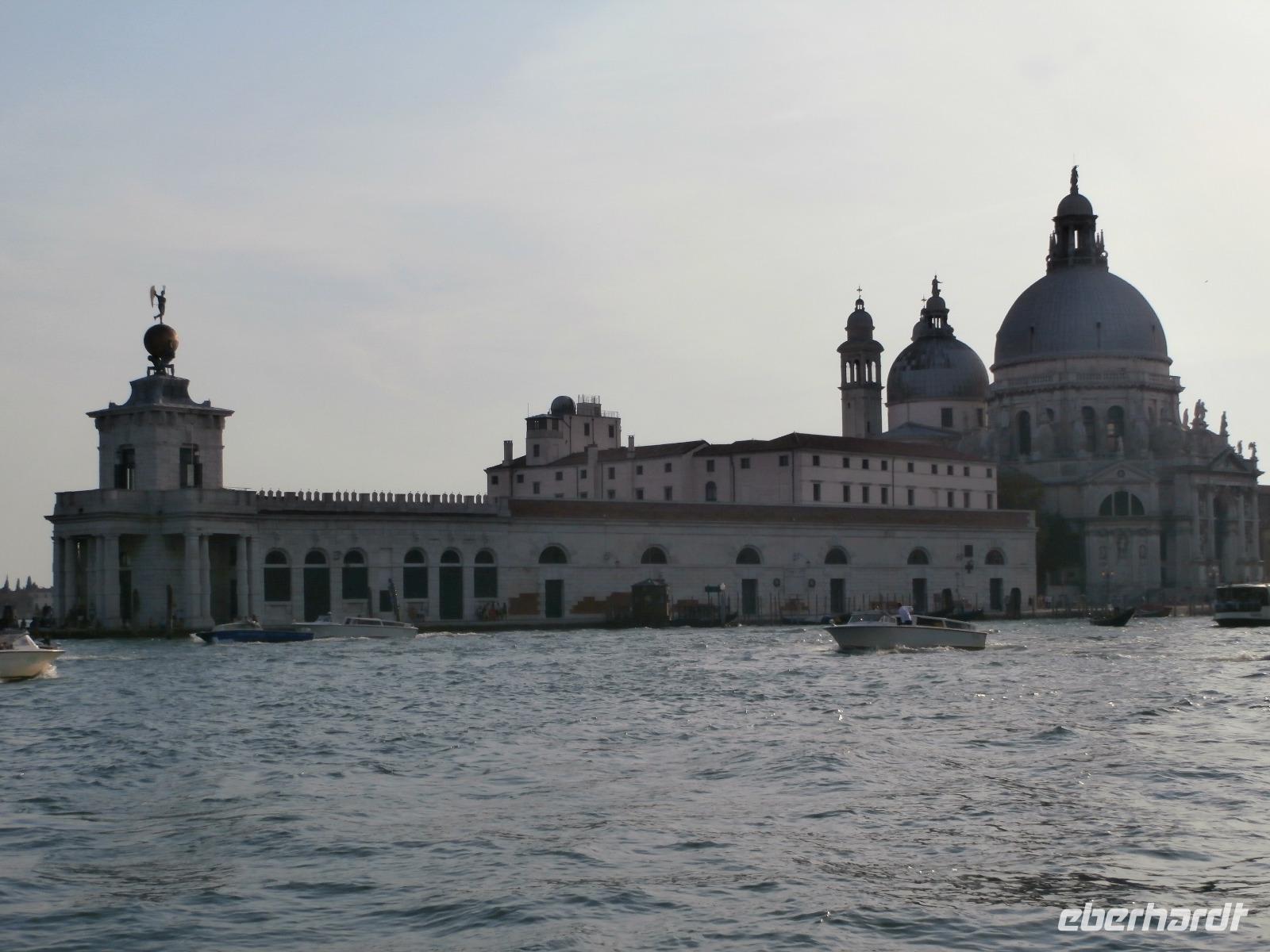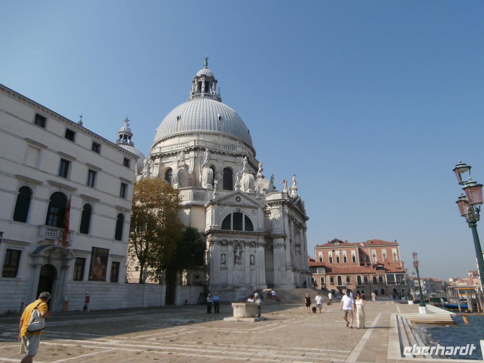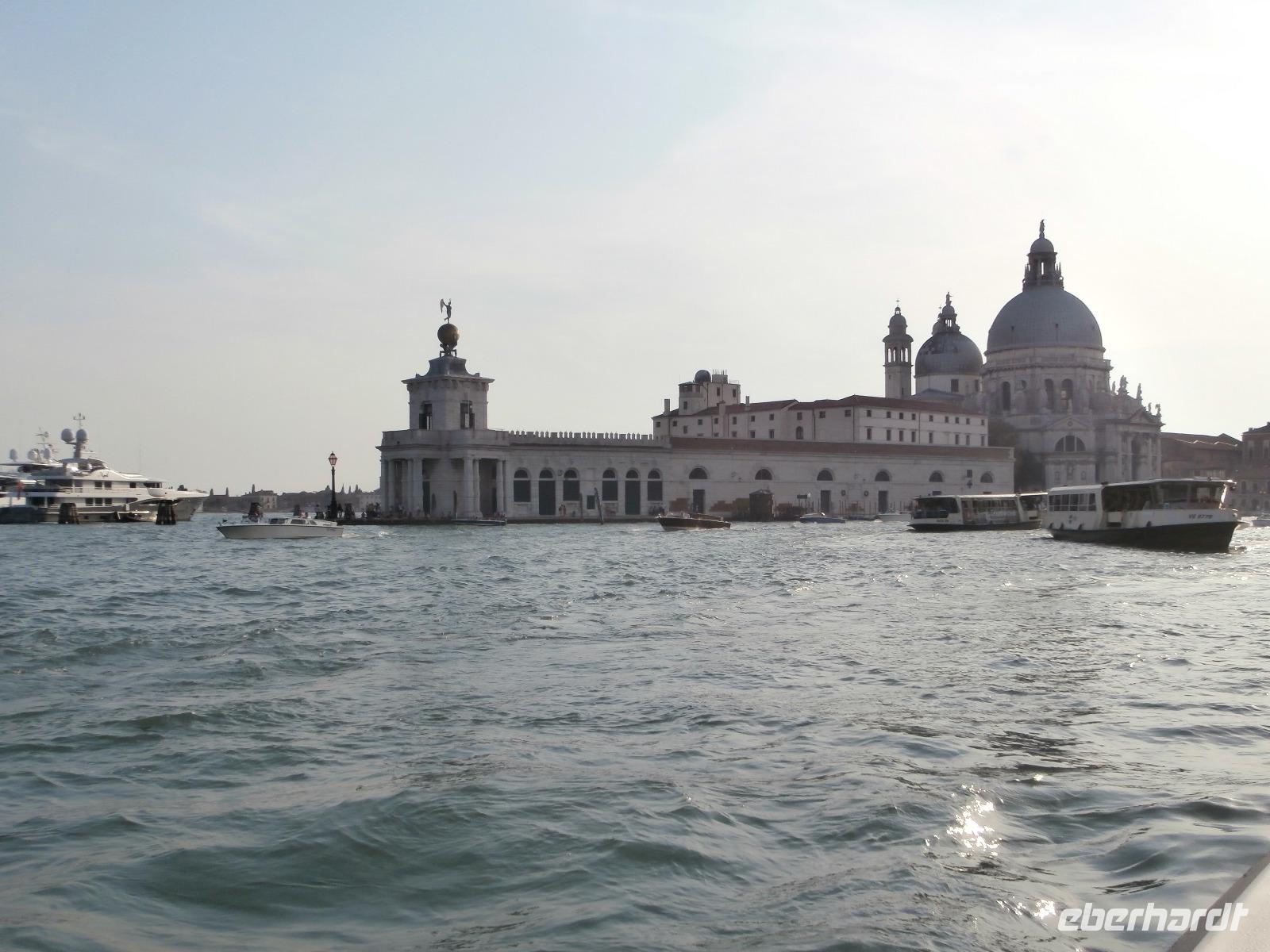 Alessia holt uns zur Führung im Hotel ab, am Ufer vom Canale della Giudecca laufen wir bis zur Gondelwerft Squero San Trovaso, wir erfahren von Alessia, dass man schon vor 1000 Jahren das Wort Gondola als Bezeichnung für die flachen, kiellosen Boote verwendete. Sie wurden für Fahrten auf seichten Flüssen gebaut und bestehen aus verschiedenen Hölzern und sind asymmetrisch gebaut, um das Gewicht des Gondoliere auszugleichen. Schwarz sind die Gondeln erst seit 1562, vorher waren die der Reichen bunt und aufwendig verziert, das erregte jedoch bei den Armen Unzufriedenheit. Die Spitze vorn mit den 6 Querhölzern symbolisiert die 6 Stadtteile von Venedig unter dem Dogen Hut. Heute gibt es noch 300 Gondeln, sie sind alle im privaten Besitz, aus Nussbaum Holz und in schwarzer Farbe. Im 16. Jahrhundert waren es über 10.000 Gondeln und damals das ganz normale Verkehrsmittel in der Wasserstadt Venedig. Gleich hinter der Landspitze von Dorsoduro steht die schöne Barockkirche mit mächtiger Kuppel, Santa Maria della Salute, gebaut im 17. JH und errichtet zum Gedenken an das Ende der Pest-Epidemie von 1630. Sie besichtigen wir gemeinsam mit Alessia, die Hauptfassade weist zum Canal Grande hin und bietet ein tolles Fotomotiv.
