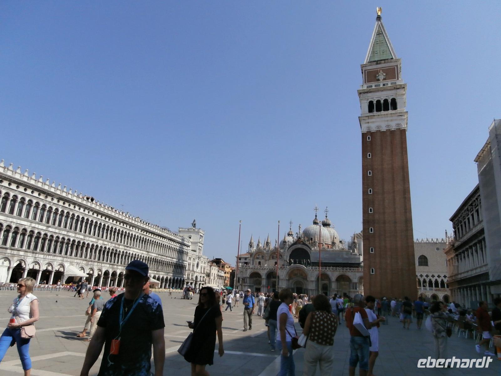 Nach dem Frühstück treffen wir im Hotel Alessia, unsere örtliche Reiseleitung in Venedig. Sie stimmt uns herzlich ein auf diese einzigartige Stadt mitten in der Lagune, in der Wasser das alles beherrschende Element ist. Bei noch angenehmen Hitzegraden gehen wir zuerst über die schöne Holzbrücke bei der Accademia, sie war als Übergangslösung gedacht und wird noch heute intensiv genutzt. Vorbei an vielen Plätzen und durch schmale Gassen hinüber über viele Brücken führt uns Alessia und auch eine Pause für Espresso und WC wird eingelegt. Wir bewundern am Campo Manin die Scala del Bovolo, sie ist ein seltenes Exemplar einer Wendeltreppe mit Schneckengang außen. Am Markusplatz angelangt sehen wir uns die Basilica San Marco auch von innen an, Alessia führt uns durch diese Kirche mit den fünf Kuppeln. Sie wirkt innen wie außen wie eine Schatztruhe, die Mosaike stammen überwiegend aus dem 12. und 13. JH und stellen vor allem Bibelszenen dar. Der Campanile am Piazza San Marco ist der höchste Glockenturm der Stadt. Er ragt 98,6 m empor, gefertigt aus rotem Backstein und schon sehr alt, 12. JH. Am Torre dell' Orologio (Uhrenturm) sind Sonne, Mond und Sterne kunstvoll in der Turmuhr vereint. Vorbei am Dogenpalast gelangen wir zur Seufzerbrücke, hier sind immer viele Touristen anzutreffen. Bei hitzigen Temperaturen verlassen wir die Piazzetta, sie ist ja der bekannte offene Platz zum Wasser hin. Durch die zwei monolithischen Säulen gehen wir weiter am Wasser entlang um zur letzten Station der heutigen Führung zu kommen. Wir stehen nun vorm Opernhaus La Fenice, es ist berühmt auch wegen der Einrichtung mit Goldschmuck und Lüsterglanz. Einfach märchenhaft dieser erste Tag in der Stadt der Löwen, Legenden und Leidenschaften. Die vorherrschende Hitze zwingt uns nun eine längere Pause ab. Die Freizeit nutzen unsere Gäste ganz individuell und zum Abendessen sehen wir uns wieder.