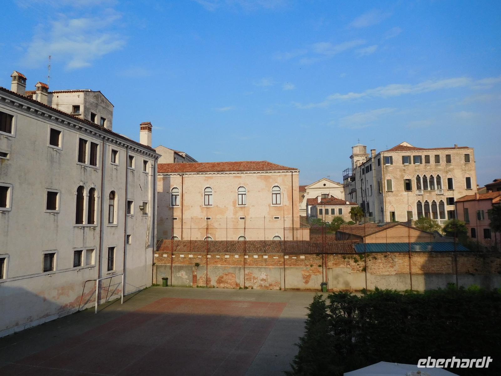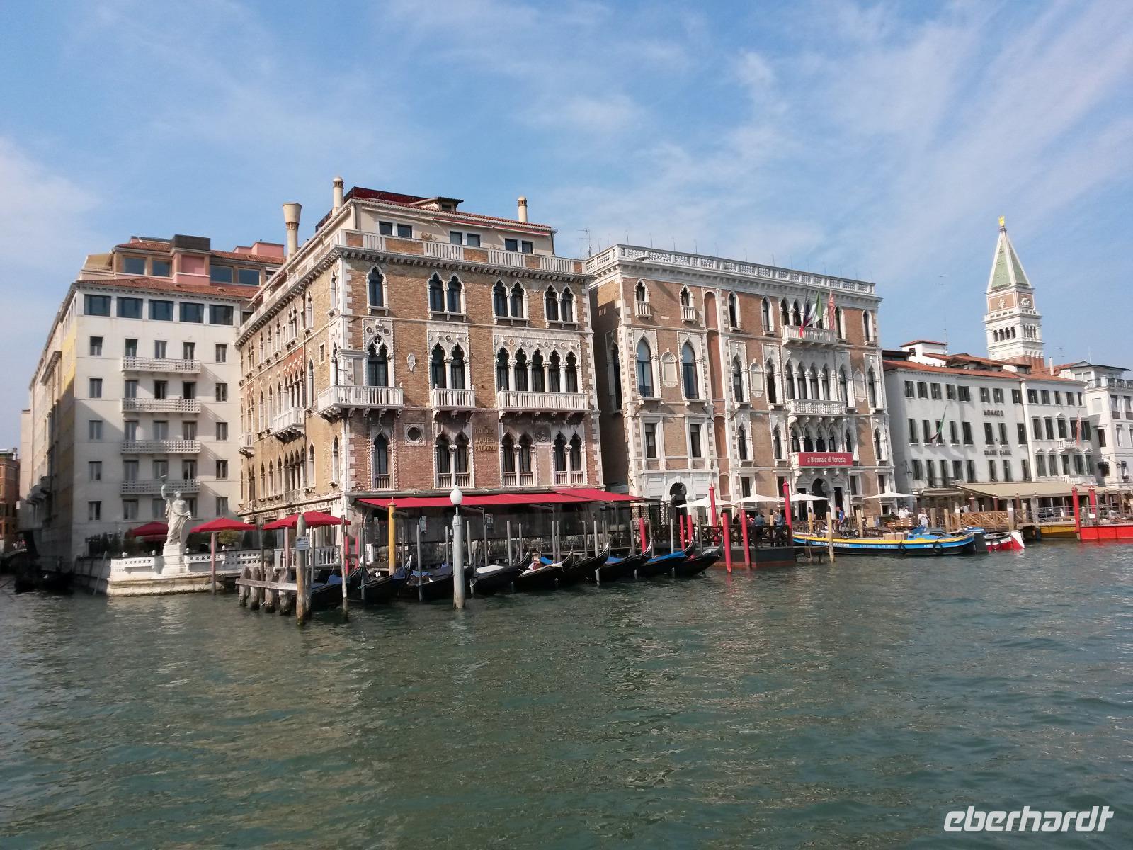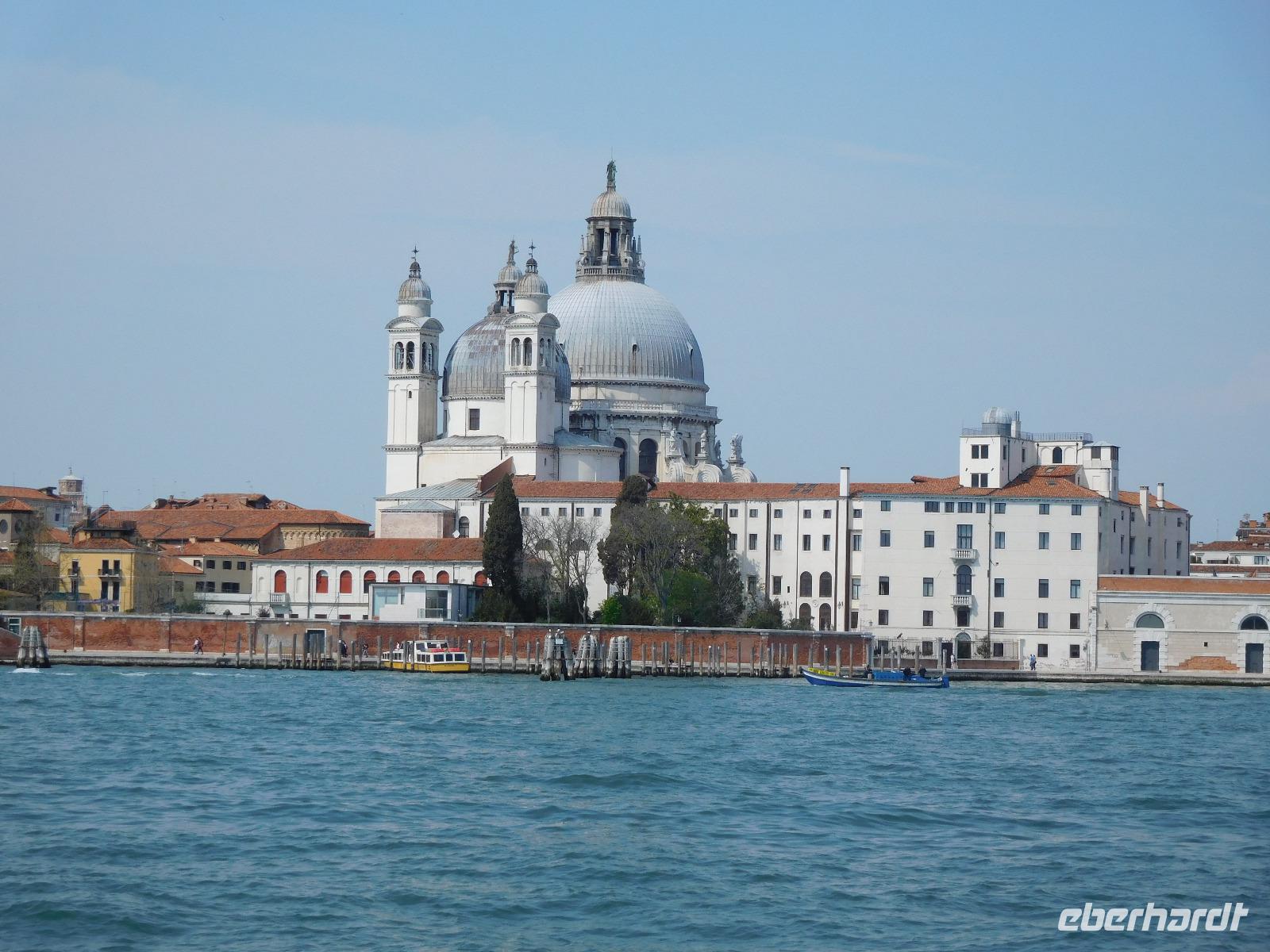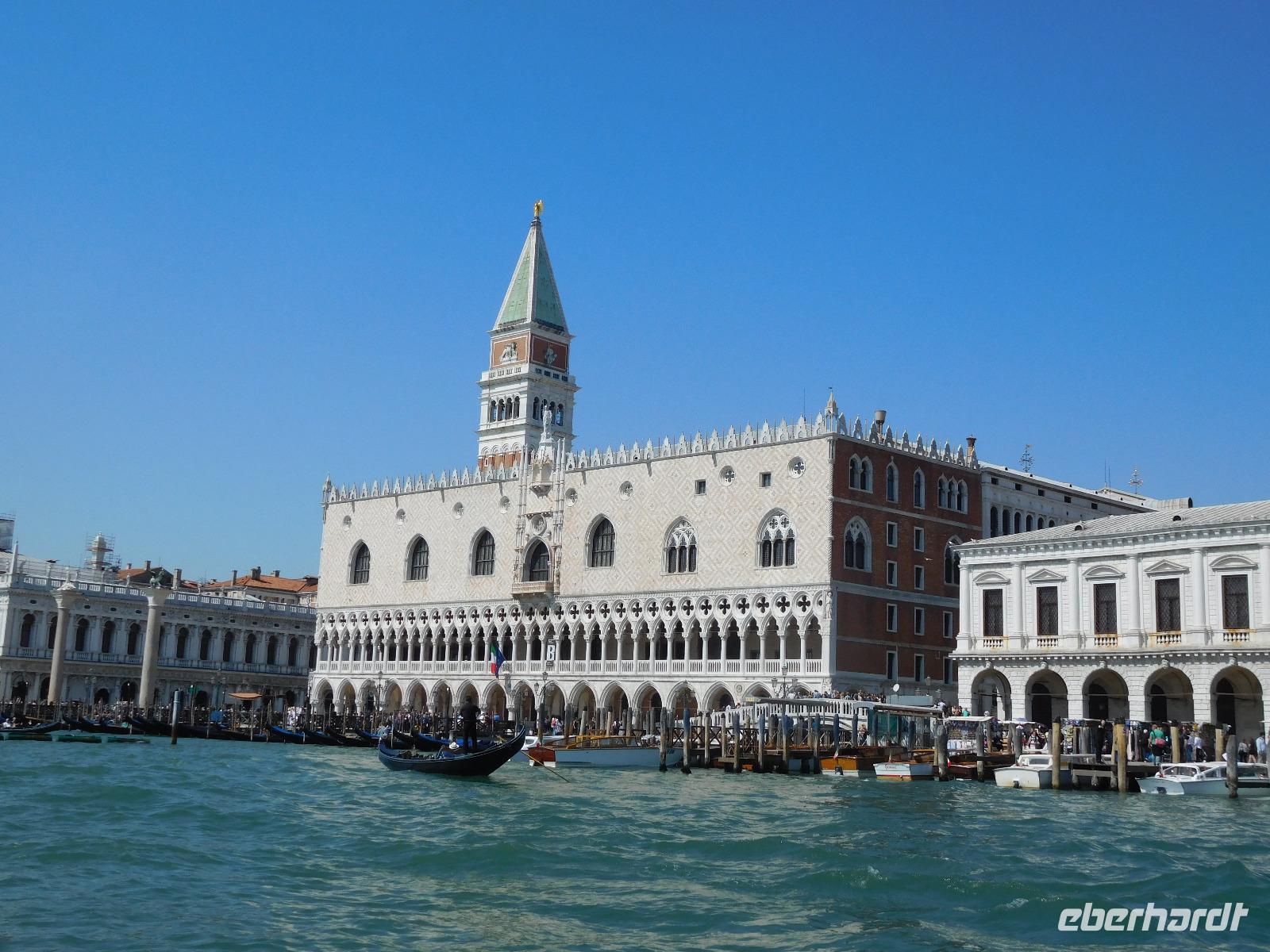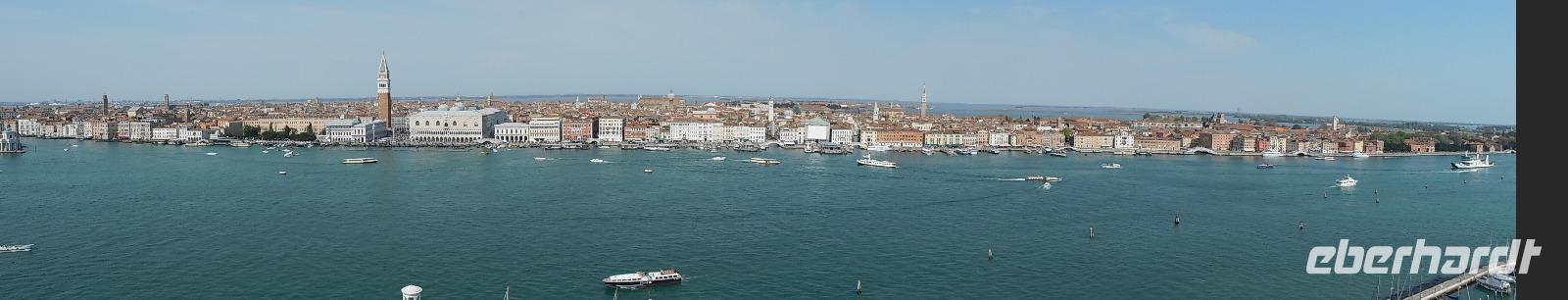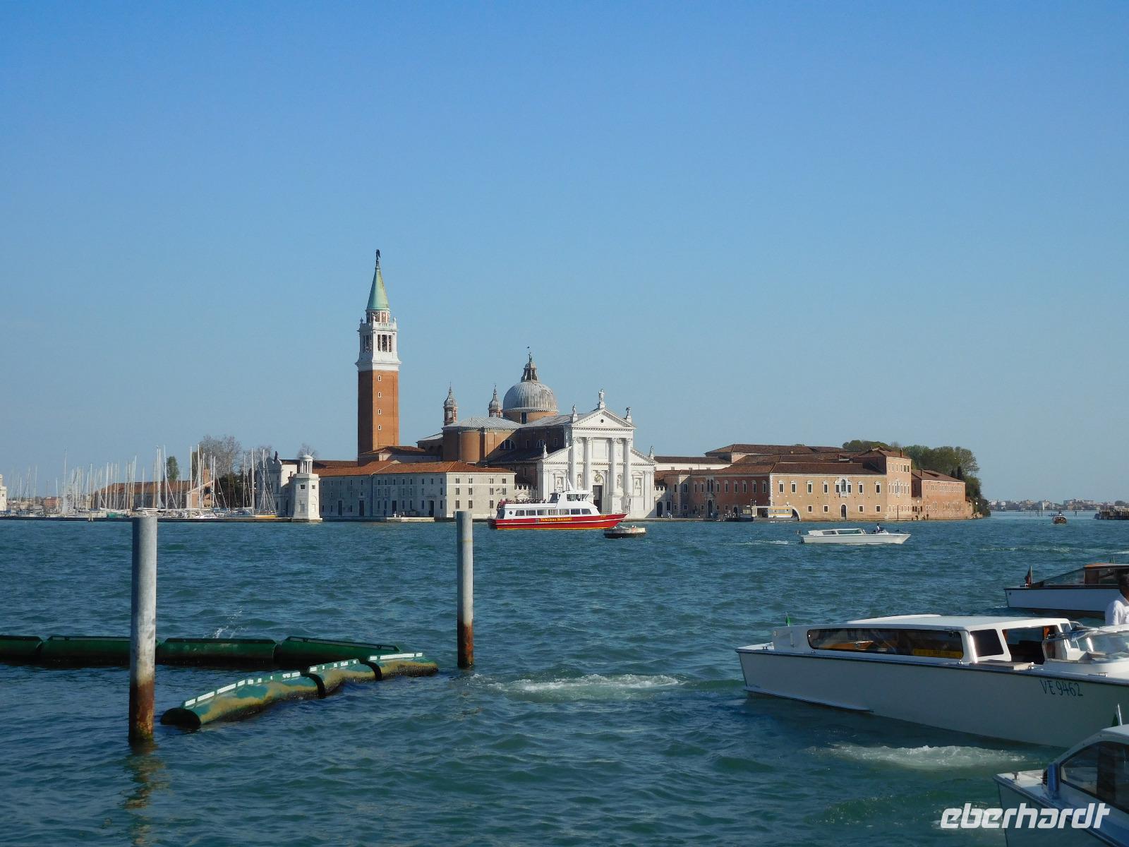 Um halbzehn holte uns Alessia vom Hotel ab und führte uns über die Akademiebrücke zum Stefansplatz, wo wir die Stefanskirche ansahen, durch deren Chorbereich ein befahrbarer Kanal verläuft. Weiter ging es zum berühmten Musiktheater La Fenice und durch verwinkelte Gassen, die man nur mit kleinen Gruppen begehen kann, zur Scala Contarini. Die außen an der gleichnamigen Villa angebrachte Wendeltreppe verbindet in malerischer Weise alle fünf Stockwerke. Weiter nach San Marco, wo wir Ausführliches über die Geschichte Venedigs und der wichtigsten Dogen erfuhren, der Vormachtsstellung seit dem vierten Kreuzzug, in dem die Venezianer 1203 die Kreuzfahrer dahingehend manipulierten, statt Jerusalems das reiche christliche Byzanz zu erobern, dessen Dominanz im östlichen Mittelmeer damit an Venedig überging. Beispiel dafür die vier Bronzepferde auf der Markuskirche, die bei dieser Gelegenheit dort geraubt wurden. Alessia hatte den Zeitplan so gestrickt, dass wir ohne Eintrittsgeld in die Markusbasilika hineingehen konnten, die auch nur um diese Zeit sehr schön beleuchtet ist. So hatten alle einen Eindruck von der Pracht der Mosaiken, von denen viele aus der Hagia Sophia in Konstantinopel geraubt worden waren. Vorbei am Dogenpalast, dessen Marmorverkleidung in der Mittagssonne glänzte, gingen wir noch zur Seufzerbrücke, die für viele Verurteilte der letzte Weg vor Gefängnis und Hinrichtung war. Die anschließende Freizeit bot jedem Gast Gelegenheit, seinen Interessen nachzugehen. Einige Gäste kauften mit dem Reiseleiter eine Tageskarte für die Vaporetti, wie die Linienboote genannt werden, und fuhren zunächst auf die San Marco gegenüber liegende Insel San Giorgio. Hier besichtigte man die gleichnamige Kirche mit drei bedeutenden Gemälden von Tintoretto, bevor es auf den Turm ging, von dem man einen grandiosen Blick auf San Marco und die anderen umliegenden Inseln hatte. Dann setzte man über auf die Insel Giudecca, wo die Kirche Il Redentore, wie San Giorgio vom Renaissancearchitekten Andrea Palladio, das Hauptziel war. Den Abschluß bildete eine Fahrt durch den Canale Grande mit seinen unzähligen meist gotischen Palästen. Vorbei am Bahnhof und am Hafen fuhr das Boot zurüch zum Zattere auf Dorsoduoro und abends trafen sich alle zum wirklich erlesenen Abendessen.