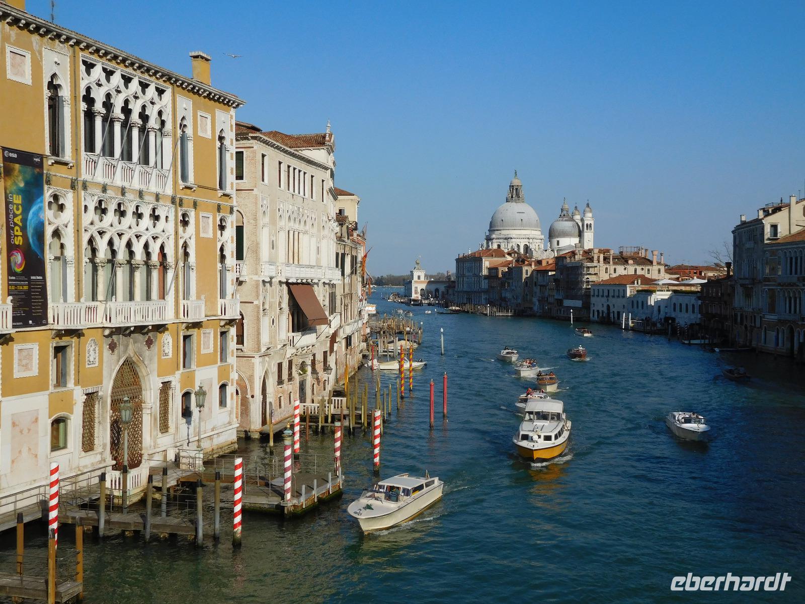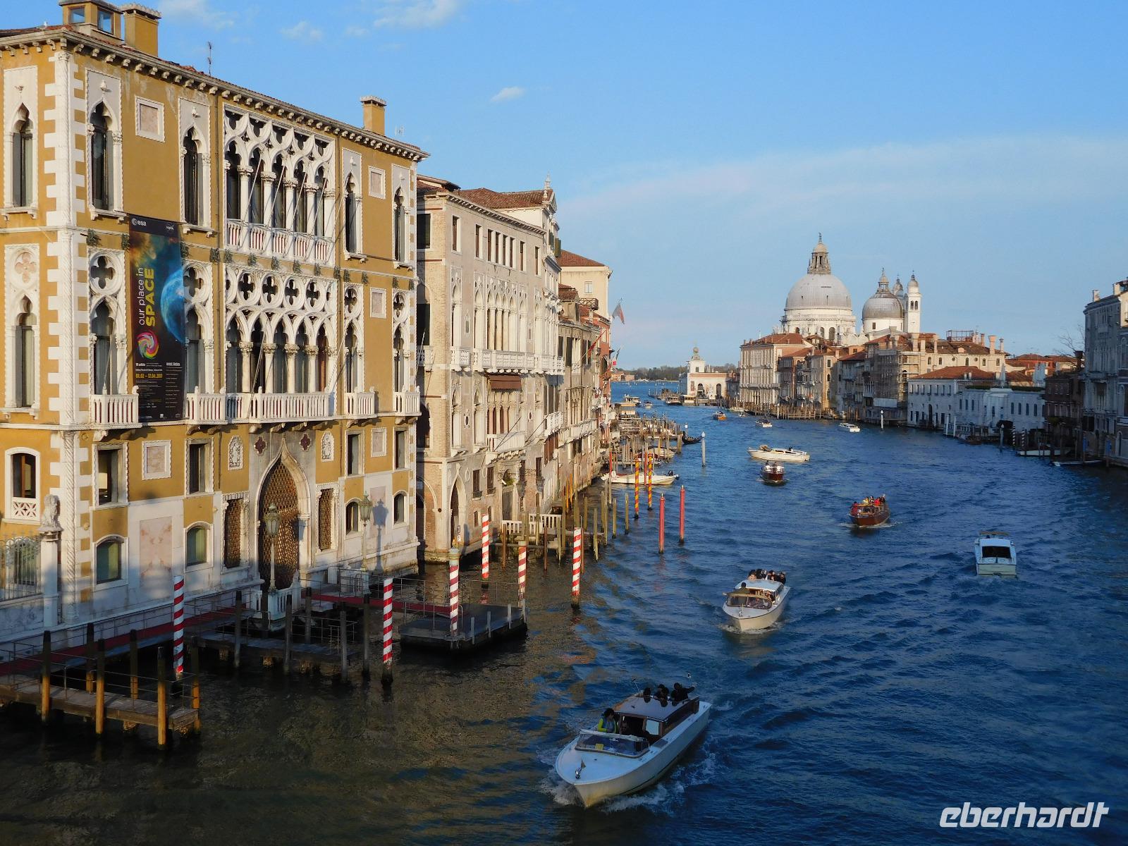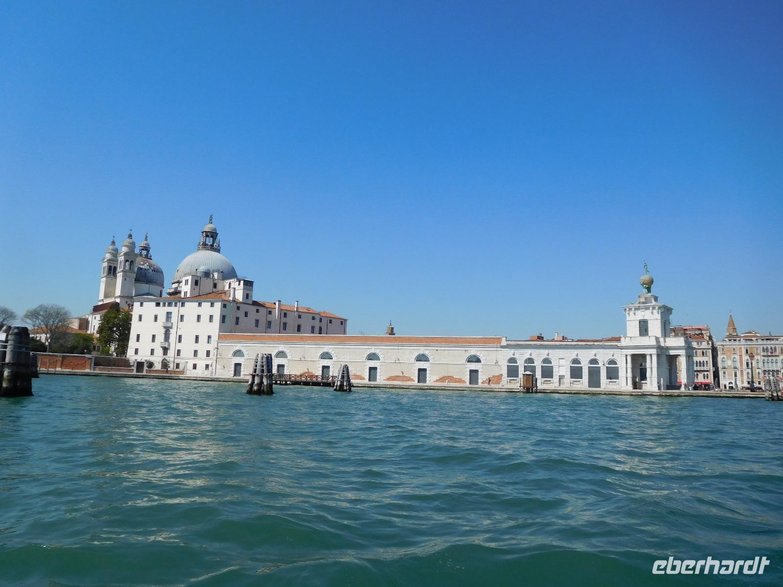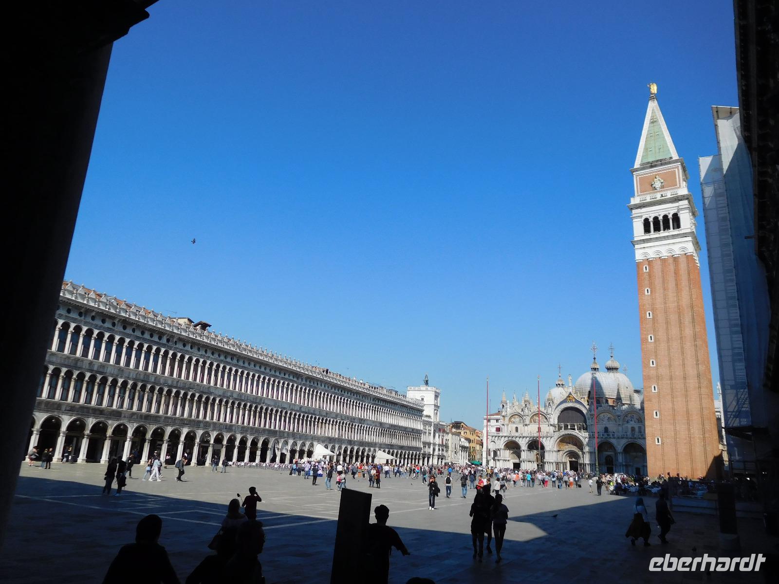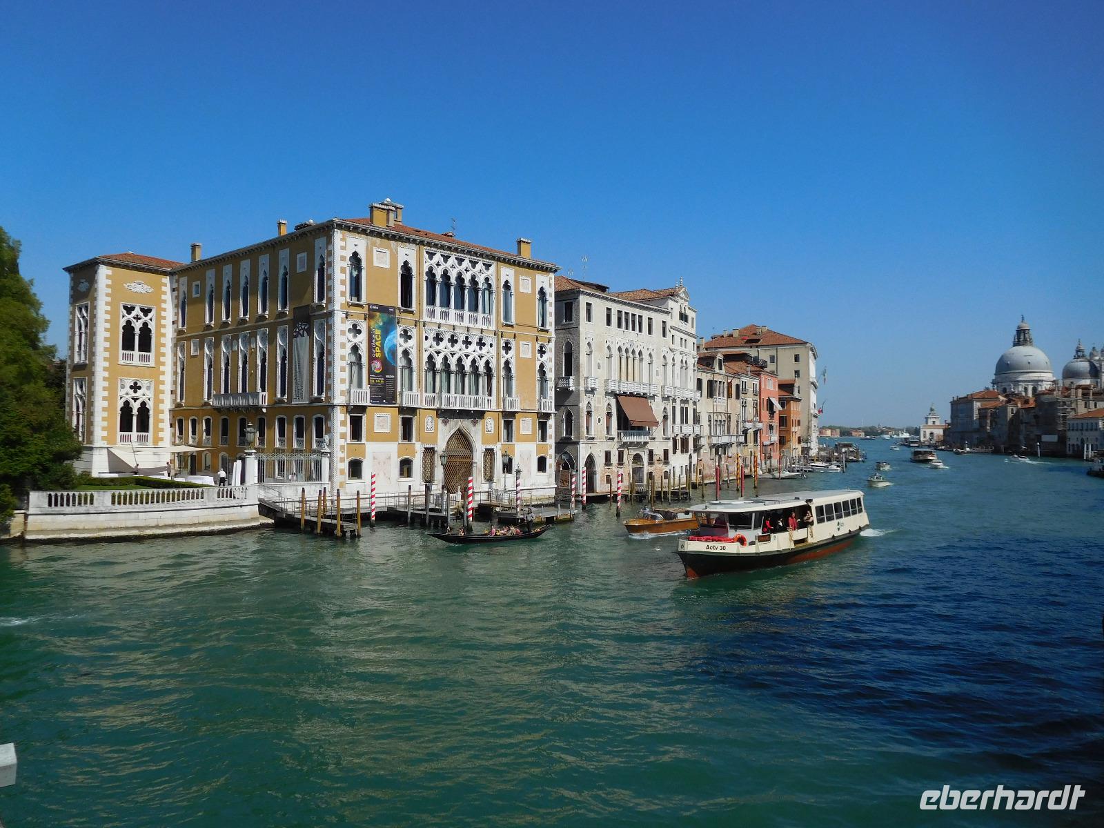Um halbzehn holte uns Alessia vom Hotel ab und führte uns über die Akademiebrücke zum Stefansplatz, wo wir die Stefanskirche ansahen, durch deren Chorbereich ein befahrbarer Kanal verläuft. Weiter ging es zum berühmten Musiktheater La Fenice und durch verwinkelte Gassen, die man nur mit kleinen Gruppen begehen kann, zur Scala Contarini. Die außen an der gleichnamigen Villa angebrachte Wendeltreppe verbindet in malerischer Weise alle fünf Stockwerke. Weiter nach San Marco, wo wir Ausführliches über die Geschichte Venedigs und der wichtigsten Dogen erfuhren, der Vormachtsstellung seit dem vierten Kreuzzug, in dem die Venezianer 1203 die Kreuzfahrer dahingehend manipulierten, statt Jerusalems das reiche christliche Byzanz zu erobern, dessen Dominanz im östlichen Mittelmeer damit an Venedig überging. Beispiel dafür die vier Bronzepferde auf der Markuskirche, die bei dieser Gelegenheit dort geraubt wurden. Alessia hatte den Zeitplan so gestrickt, dass wir ohne Eintrittsgeld in die Markusbasilika hineingehen konnten, die auch nur um diese Zeit sehr schön beleuchtet ist. So hatten alle einen Eindruck von der Pracht der Mosaiken, von denen viele aus der Hagia Sophia in Konstantinopel geraubt worden waren. Vorbei am Dogenpalast, dessen Marmorverkleidung in der Mittagssonne glänzte, gingen wir noch zur Seufzerbrücke, die für viele Verurteilte der letzte Weg vor Gefängnis und Hinrichtung war. Die anschließende Freizeit bot jedem Gast Gelegenheit, seinen Interessen nachzugehen. Einige Gäste kauften mit dem Reiseleiter eine Tageskarte für die Vaporetti, wie die Linienboote genannt werden, und fuhren zunächst auf die San Marco gegenüber liegende Insel San Giorgio. Hier besichtigte man die gleichnamige Kirche mit drei bedeutenden Gemälden von Tintoretto, bevor es auf den Turm ging, von dem man einen grandiosen Blick auf San Marco und die anderen umliegenden Inseln hatte. Dann setzte man über auf die Insel Giudecca, wo die Kirche Il Redentore, wie San Giorgio vom Renaissancearchitekten Andrea Palladio, das Hauptziel war. Den Abschluß bildete eine Fahrt durch den Canale Grande mit seinen unzähligen meist gotischen Palästen. Vorbei am Bahnhof und am Hafen fuhr das Boot zurüch zum Zattere auf Dorsoduoro und abends trafen sich alle zum wirklich erlesenen Abendessen.