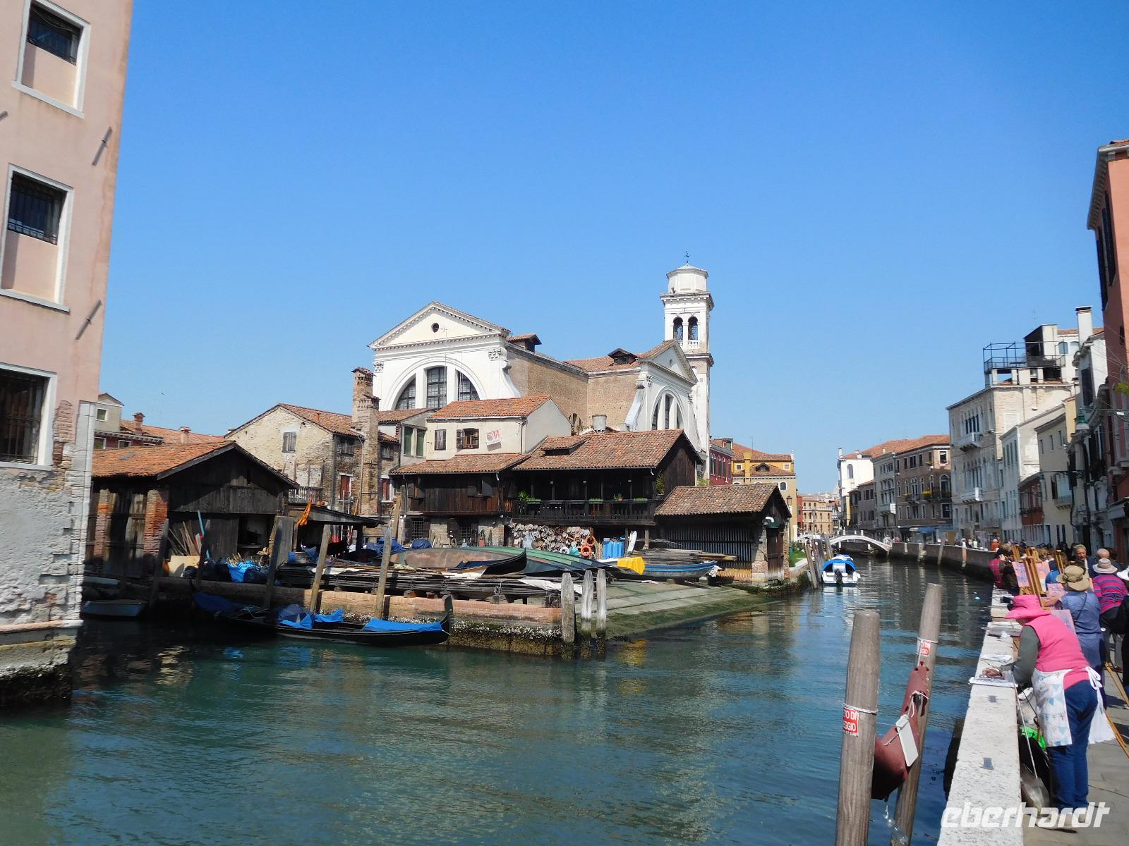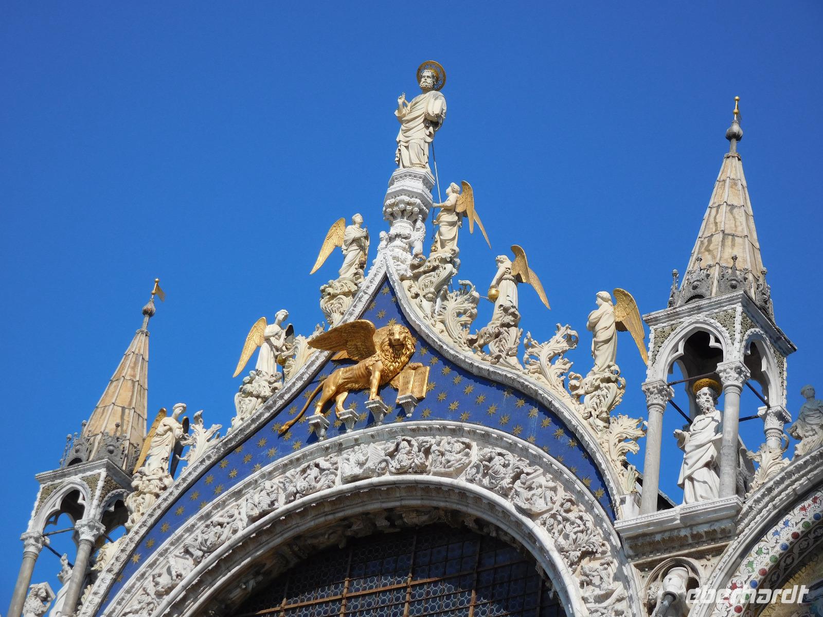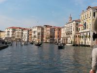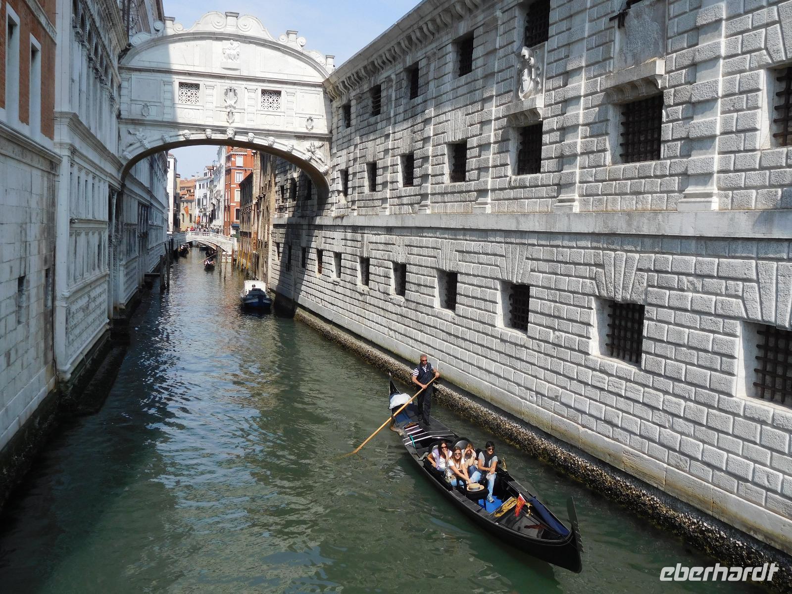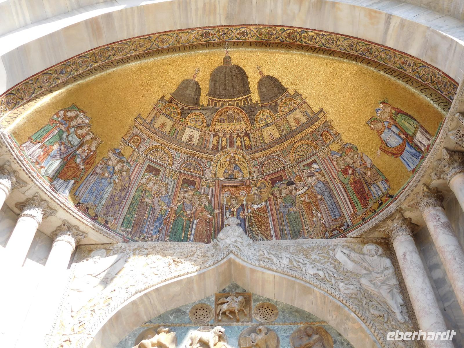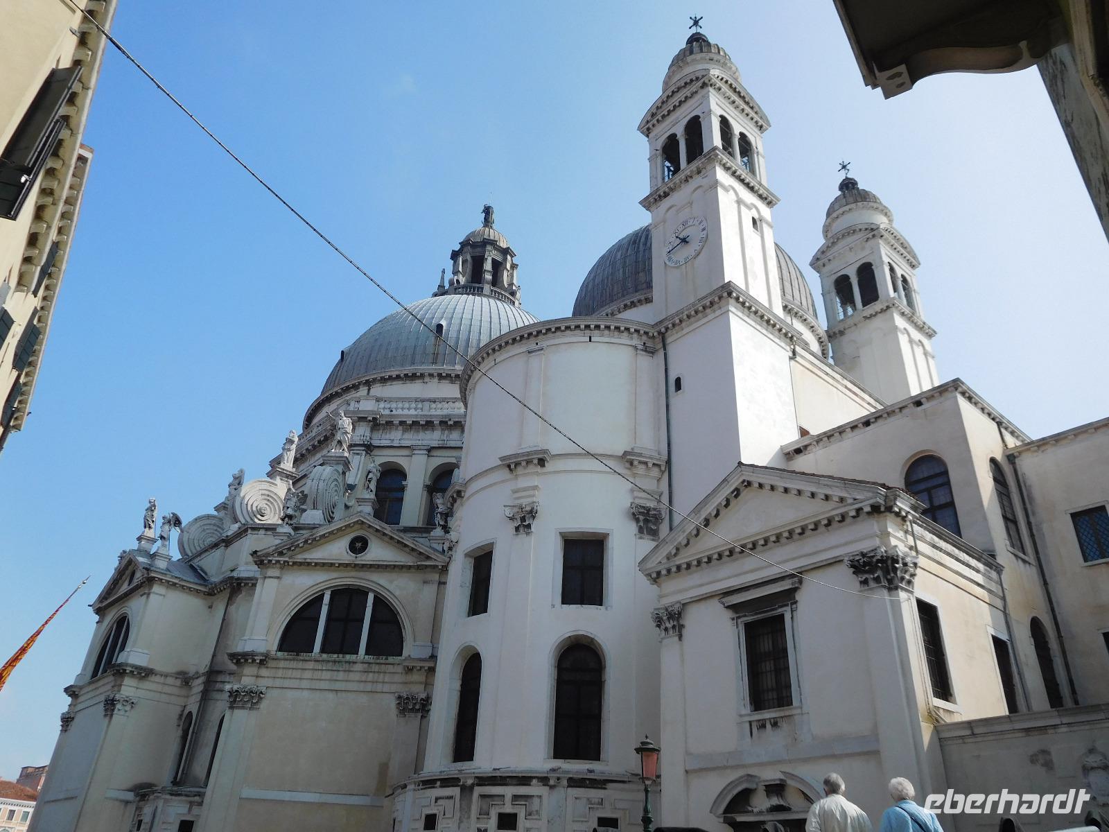 Um halbzehn holte uns Alessia vom Hotel ab und führte uns über die Akademiebrücke zum Stefansplatz, wo wir die Stefanskirche ansahen, durch deren Chorbereich ein befahrbarer Kanal verläuft. Weiter ging es zum berühmten Musiktheater La Fenice und durch verwinkelte Gassen, die man nur mit kleinen Gruppen begehen kann, zur Scala Contarini. Die außen an der gleichnamigen Villa angebrachte Wendeltreppe verbindet in malerischer Weise alle fünf Stockwerke. Weiter nach San Marco, wo wir Ausführliches über die Geschichte Venedigs und der wichtigsten Dogen erfuhren, der Vormachtsstellung seit dem vierten Kreuzzug, in dem die Venezianer 1203 die Kreuzfahrer dahingehend manipulierten, statt Jerusalems das reiche christliche Byzanz zu erobern, dessen Dominanz im östlichen Mittelmeer damit an Venedig überging. Beispiel dafür die vier Bronzepferde auf der Markuskirche, die bei dieser Gelegenheit dort geraubt wurden. Alessia hatte den Zeitplan so gestrickt, dass wir ohne Eintrittsgeld in die Markusbasilika hineingehen konnten, die auch nur um diese Zeit sehr schön beleuchtet ist. So hatten alle einen Eindruck von der Pracht der Mosaiken, von denen viele aus der Hagia Sophia in Konstantinopel geraubt worden waren. Vorbei am Dogenpalast, dessen Marmorverkleidung in der Mittagssonne glänzte, gingen wir noch zur Seufzerbrücke, die für viele Verurteilte der letzte Weg vor Gefängnis und Hinrichtung war. Die anschließende Freizeit bot jedem Gast Gelegenheit, seinen Interessen nachzugehen. Einige Gäste kauften mit dem Reiseleiter eine Tageskarte für die Vaporetti, wie die Linienboote genannt werden, und fuhren zunächst auf die San Marco gegenüber liegende Insel San Giorgio. Hier besichtigte man die gleichnamige Kirche mit drei bedeutenden Gemälden von Tintoretto, bevor es auf den Turm ging, von dem man einen grandiosen Blick auf San Marco und die anderen umliegenden Inseln hatte. Dann setzte man über auf die Insel Giudecca, wo die Kirche Il Redentore, wie San Giorgio vom Renaissancearchitekten Andrea Palladio, das Hauptziel war. Den Abschluß bildete eine Fahrt durch den Canale Grande mit seinen unzähligen meist gotischen Palästen. Vorbei am Bahnhof und am Hafen fuhr das Boot zurüch zum Zattere auf Dorsoduoro und abends trafen sich alle zum wirklich erlesenen Abendessen.