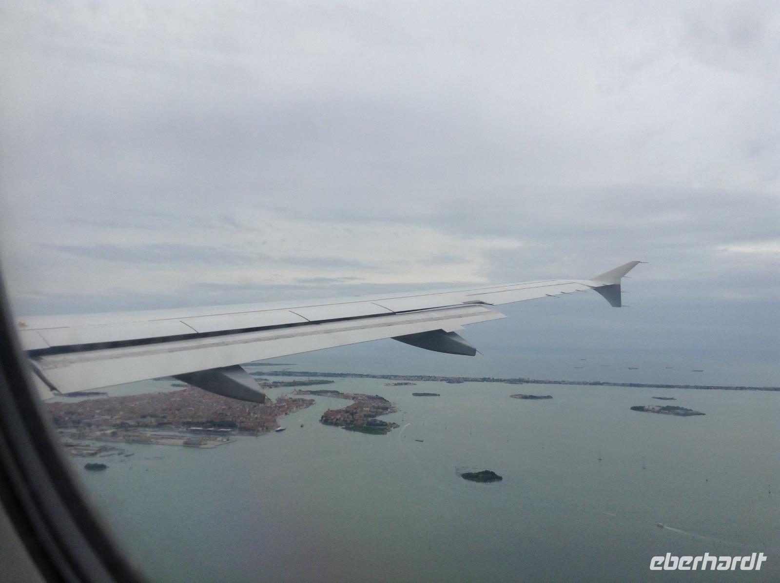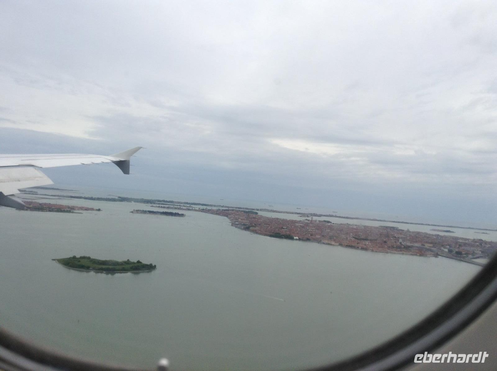 Gemeinsam checkten wir ein und warteten, bis kurz nach 6 Uhr unser Flieger in Richtung Frankfurt ging. In Frankfurt war Zwischenlandung und wir trafen vor dem Flug nach Venedig die Gäste, die aus Leipzig kamen. Gegen Mittag ging es dann nach Venedig. Vor der Landung hatten wir aus der Luft schon einen tollen Blick auf die Lagunenstadt. Wir holten unser Gepäck und am Ausgang wartete noch ein Reisegast aus Köln auf unsere Gruppe. Dann waren wir komplett.