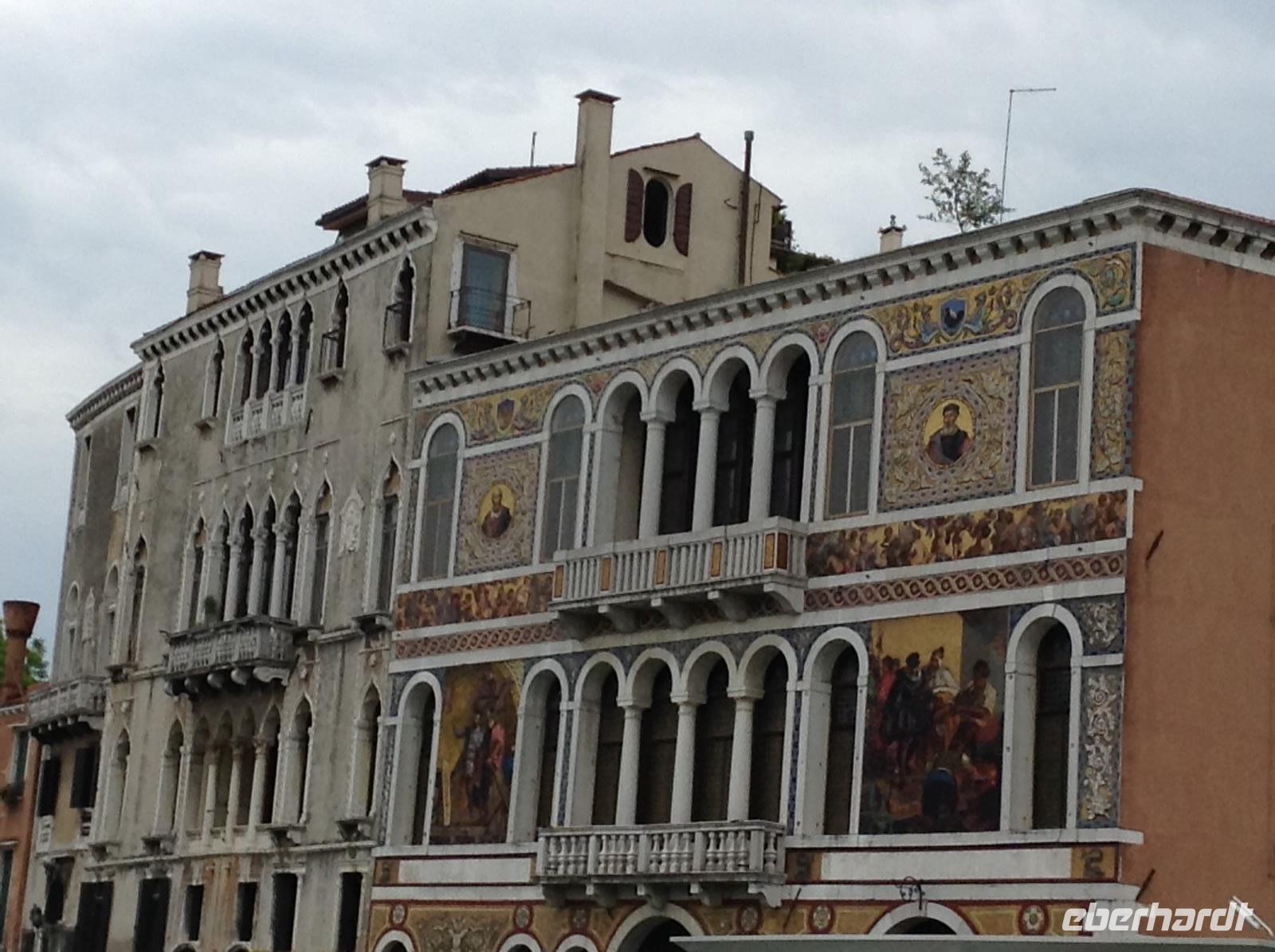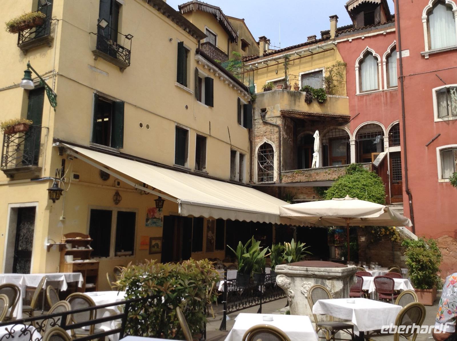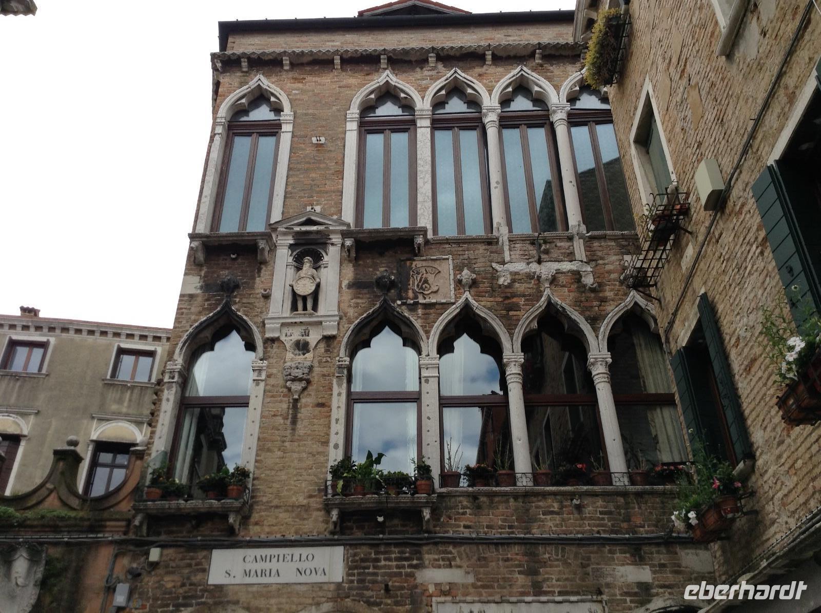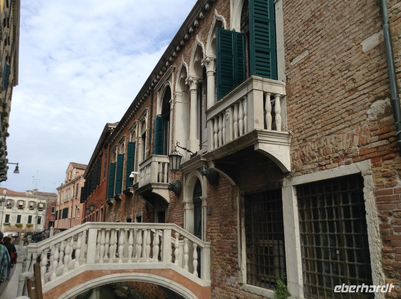 Alessia zeigte uns einige der in der Filmreihe immer wieder vorkommenden wunderbaren Gebäude, Ecken und Orte der Stadt. Wir wandelten die Gassen entlang, wie der Commissario, schauten uns an, wo er pflegt zu essen und zu trinken, wo er Blumen kaufen geht und wo Donna Leon wohnt. Dabei besichtigten wir Gassen und Plätze in den Stadteilen Cannaregio und Castello, sahen weitere Kirchen und das wunderschöne Eingangsportal des alten Krankenhauses der Stadt. Am Canale Grande sahen wir den Palazzo mit der Terasse, auf dem Herr Brunetti manchmal sitzt und zum Wasser schaut. Genau gegenüber endete unsere heutige Führung und alle verabschiedeten sich von Alessia. Danach war der heutige Nachmittag wieder zur freien Verfügung.