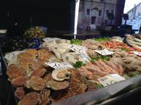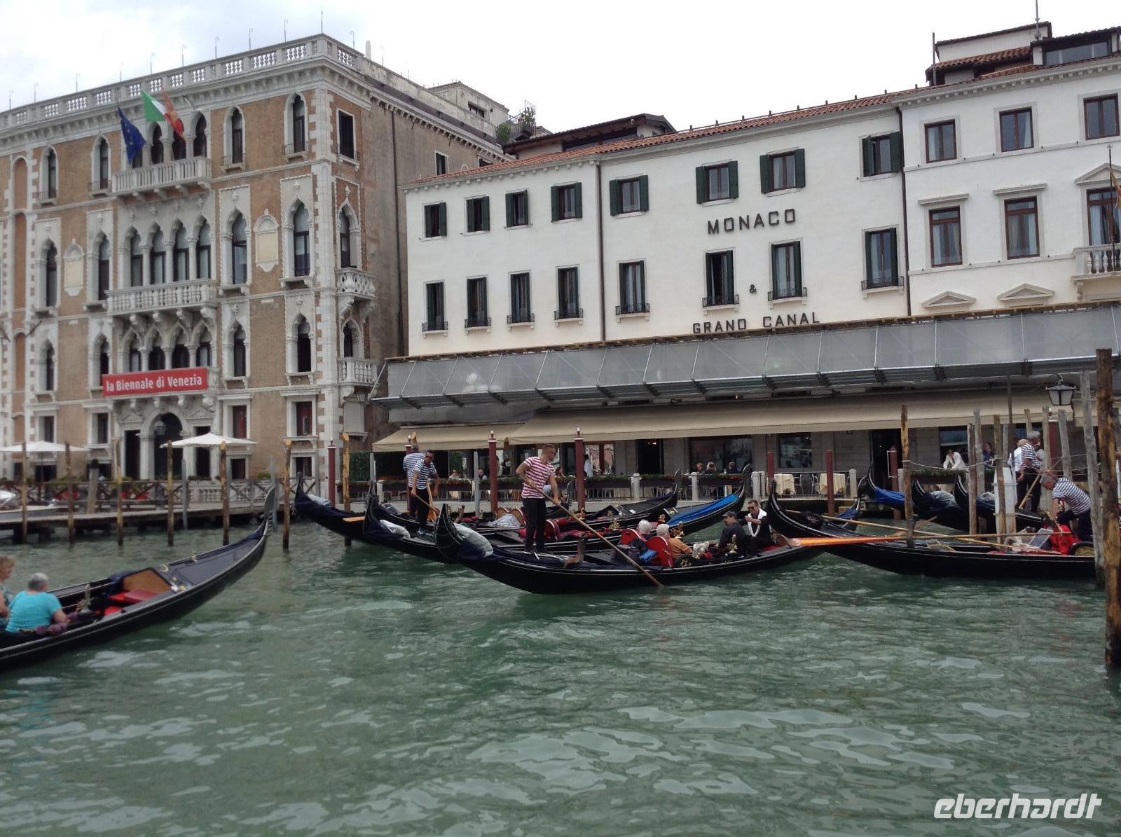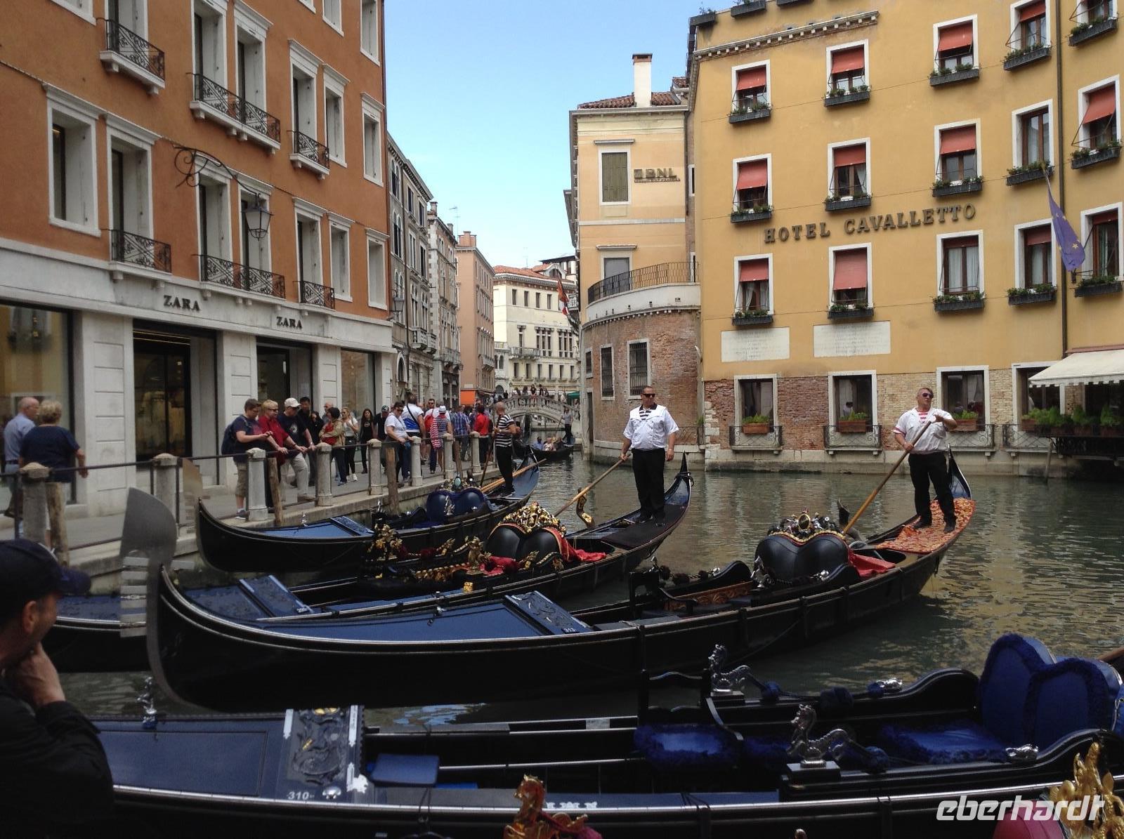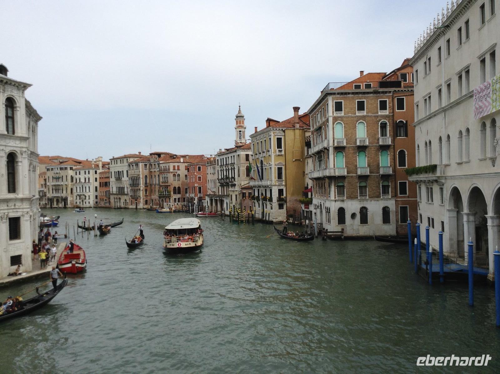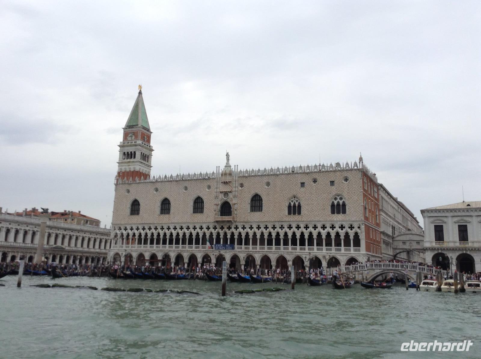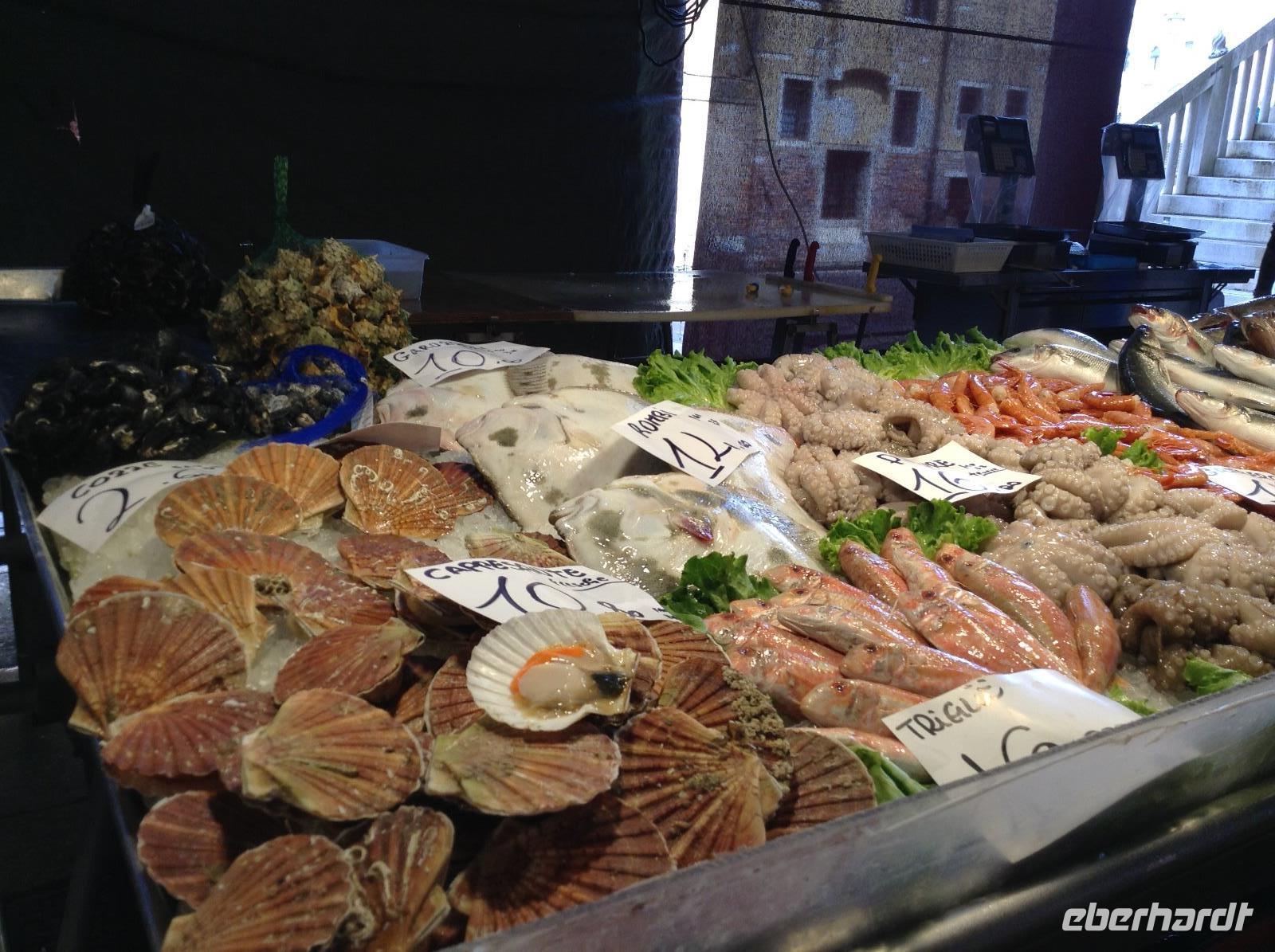 Nach dem Frühstück ging es dann mit der Bootslinie 1 das erste Mal zur Hauptinsel hinüber. Alessia wartete auf uns direkt an den beiden Säulen vor dem Dogenpalast. Der erste Eindruck beim Ankommen, war nur WOW, welche Schönheit. Wir wußten garnicht, wo wir zuerst hinschauen sollten und waren überwältigt. Mit Alessia bummelten wir zum Markusplatz, bestaunten die Gebäude und die Kirche. An diesem Morgen waren noch nicht so viele Touristen in der Stadt und wir hatten genügend Zeit und Ruhe. Vor dem Kaffee Florian spielte die Musik sehr angenehm, wir bestaunten die ersten Gondelboote und ihre geübten Fahrer. Alessia erläuterte uns jedes Detail. Langsam ging es bis zur Rialtobrück und auf der Brücke stehend hatten wir erstmals diesen tollen Blick auf den Canale Grande. Wir schauten dem bunten Treiben und den vielen Booten ein wenig zu, ehe es über die Brücke hinüber und dann zum Mercator, dem Frischemarkt ging. Obst, Gemüse, fangfrischer Fisch, wir schauten interessiert.