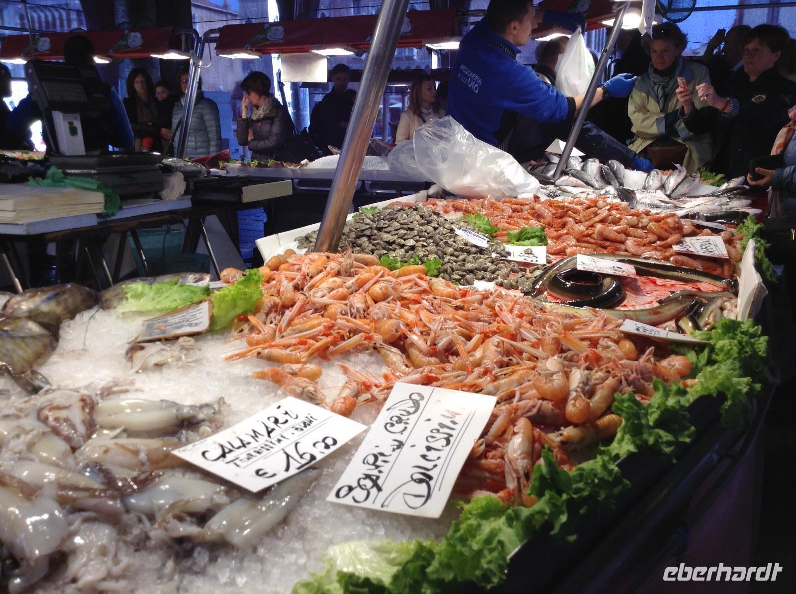 Anschließend versuchten wir gemeinsam auf die Dachterasse des Nobelkaufhauses Fondacco dei Tedeschi zu gelangen. Von dort aus hat man einen tollen Ausblick auf die ganze Altstadt mit Canale Grande. Im ersten Anlauf gelang uns dies aber nicht, wir brauchten eine Reservierung. Zwei Stunden später standen einige Gäste mit mir dann da oben und genossen einen wunderschönen Ausblick. Der Nachmittag war zur freien Verfügung und erst zum Abendessen trafen wir uns wieder an unserer Hotelrezeption. Wir waren jeden Abend in einem anderen Restaurant, lernten gut die venezianische Küche kennen und probierten viel Fisch und Meeresfrüchte. Mit einem gemütlichen Spaziergang klang auch dieser Abend aus.