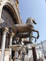Anschließend spazierten wir zum Markusplatz, der Piazza San Marco, einer der größten und berühmtesten Plätze der Stadt. Hier sahen wir den Dogenpalast und die Verbindung zum Markusdom, Porta della Carta, den Uhrenturm, die alte Procuratie mit ihrem napoleonischen Flügel, den Campanile, Markusdom und die Biblioteca Marciana. Die unglaubliche Fülle an Gebäuden, an historischer architektonischer Formensprache und machtpolitischen Ausstrahlung läßt niemanden kalt, jeder ist fasziniert.
