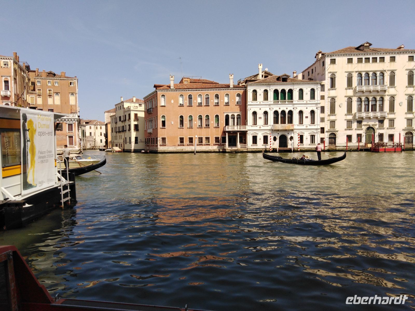 Gemeinsam starteten wir mit der nächsten Maschine nach Venedig und erreichten planmäßig die Stadt gegen 10 Uhr. Mit dem Alilaguna-Wassertaxi, das in regelmäßigen Abständen vom Flughafen in die Stadt verkehrt, fuhren wir, vorbei an kleinen Inseln und dann auch Murano, später in den Canal Grande ein. Venedig begrüßte uns hier schon mit seinen bedeutenden Bauten wie den Dogenpalast, der Markus-Basilika und den Campanile.