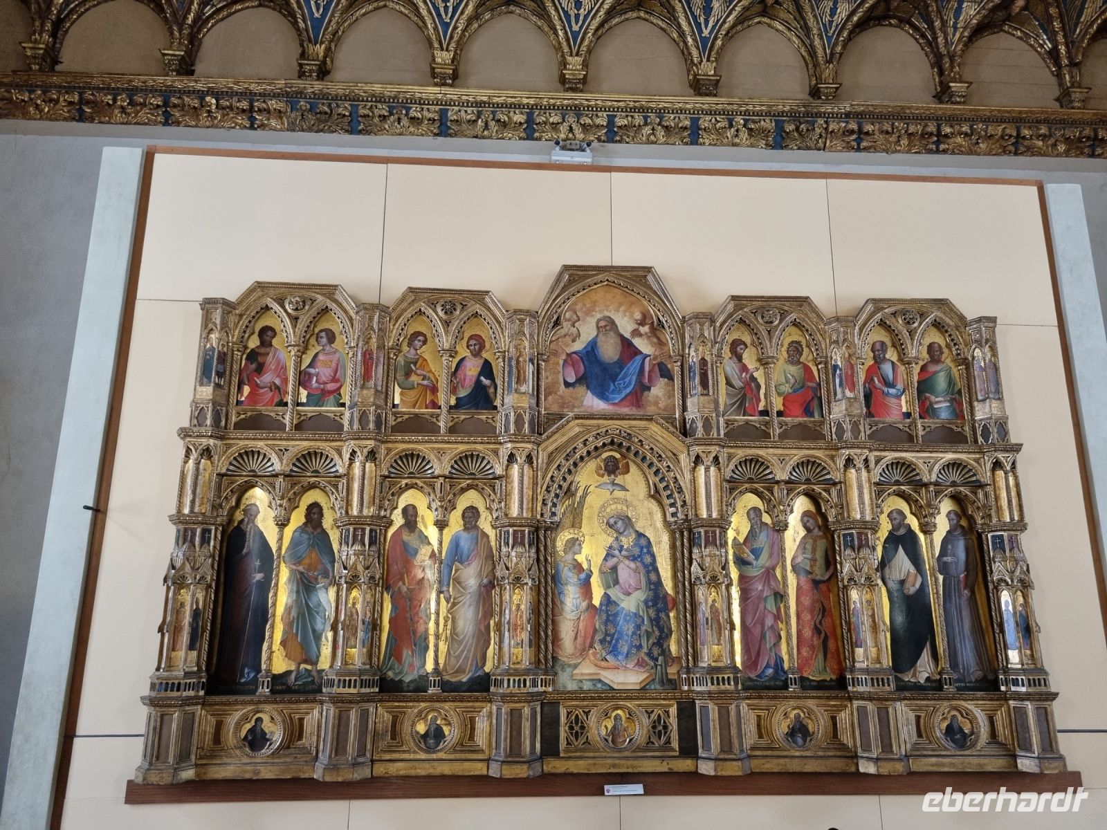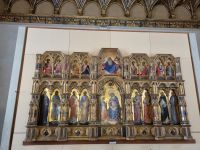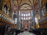 Den ersten freien Vormittag begannen wir mit einem gemeinsamen Spaziergang zum unweit des Hotels gelegenen Teatro La Fenice, welches das größte und bekannteste Opernhaus in Venedig ist. Wir waren ziemlich zeitig vor Ort und somit kamen wir ohne Wartezeit hinein. Während einer interessanten Audio-Tour wurden wir mit den wichtigsten Informationen versorgt und sahen zudem fünf Stockwerke, originalgetreu im Stil des Venezianischen Klassizismus. Stuck besetzte Wände, imposante Kronleuchter, vergoldetes Interieur und rote Samtpolster transportieren den Charme des alten, glamourösen Venedig, ohne dabei an Attraktivität einzubüßen. Das Opernhaus verfügt außerdem über verschiedene Logen und einen Zuschauerraum, ausgestattet mit Sesseln aus rotem Plüsch, vor der imposanten Bühne. Die raumfüllende Saalakustik wird von Besuchern der Vorstellungen sehr geschätzt und auch auf günstigeren Sitzplätzen lässt sich das Erlebnis Oper, sowohl musikalisch als auch visuell, genießen. Aufgeführt werden zumeist klassische und zeitlose Opern, von Komponisten wie Verdi, Puccini, Rossini, Wagner oder Mozart. Aber auch Stücke der Moderne werden im La Fenice gezeigt. Um 14 Uhr holte uns unsere reizende Stadtführerin Barbara vom Hotel ab. Mit ihr gingen wir zunächst erst einmal über die Akademiebrücke und über den Stefansplatz mit der gleichnamigen Kirche bzw. durch die zahlreichen engen Gassen in Richtung Markusplatz. Der Markusplatz (Piazza San Marco) ist der größte und zugleich auch der schönste Platz in Venedig. Er ist übrigens der einzige Platz der Stadt, der den Namen "Piazza" trägt, die anderen Plätze in Venedig werden nämlich "Campi" genannt, da sie ursprünglich nicht gepflastert waren. Wir sahen die den Platz dominierende Fassade der Markuskirche (Basilica di San Marco) und den freistehenden Markusturm. Wir flanierten weiter vorbei am Dogenpalast und näherten uns der nur wenige Schritte vom Markusplatz entfernten Seufzerbrücke. Diese charakteristische venezianische Brücke verbindet den Dogenpalast mit dem neuen Gefängnis. Diese ehemalige Haftanstalt ist zudem das erste Gebäude der Welt, das explizit als Gefängnis konzipiert wurde. Die Seufzerbrücke diente als Übergang der Gefangenen in die Büros der Inquisitoren, um dort vor Gericht gestellt zu werden und der Name der Brücke wurde gewählt, weil die Gefangenen der Überlieferung zufolge beim Überqueren der Brücke seufzten, da sie die Aussicht hatten, die Außenwelt gerade zum letzten Mal zu sehen. Ob diese Legende wahr ist, ist allerdings nicht ganz geklärt...! Unser Rundgang führte uns weiter zur Rialtobrücke, die über den Wasserweg Canal Grande führt... Sie gehört zu den bekanntesten Brücken der Welt und diese Steinbrücke wurde nach einigen Jahren Bauzeit im 16. Jahrhundert für den Verkehr freigegeben. Zuvor existierten lediglich einige einfache Holzbrücken über den Canal Grande, welche mehrmals abbrannten. Für mehrere Jahrhunderte war die Rialtobrücke die einzige Brücke über den Canal Grande und dadurch entwickelte sich die Gegend um die Brücke zum Zentrum der Stadt. Das Rathaus, die ersten Banken und Versicherungen, die Hauptpost von Venedig, der wichtigste Markt - alles das war und ist noch heute in der Nähe der Rialtobrücke zu finden. Zum Abschluß unseres heutigen Programms besichtigten wir die Frari-Kirche im Stadtteil San Polo. Diese einfache gotische Backsteinkirche wurde zwischen dem 14. und 15. Jahrhundert für die Franziskaner erbaut, und die Mönche beauftragten eine Reihe renommierter Künstler und Bildhauer der damaligen Zeit mit der Dekoration des Innenraums, wo sich eine Vielzahl italienischer Meisterwerke der Renaissance befinden.