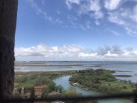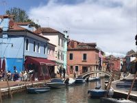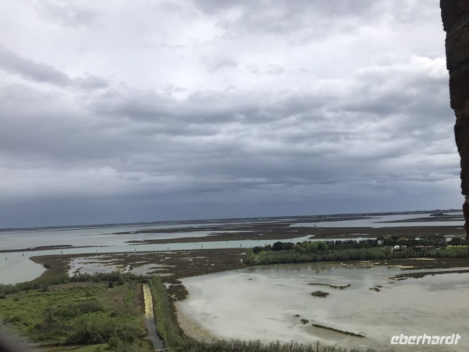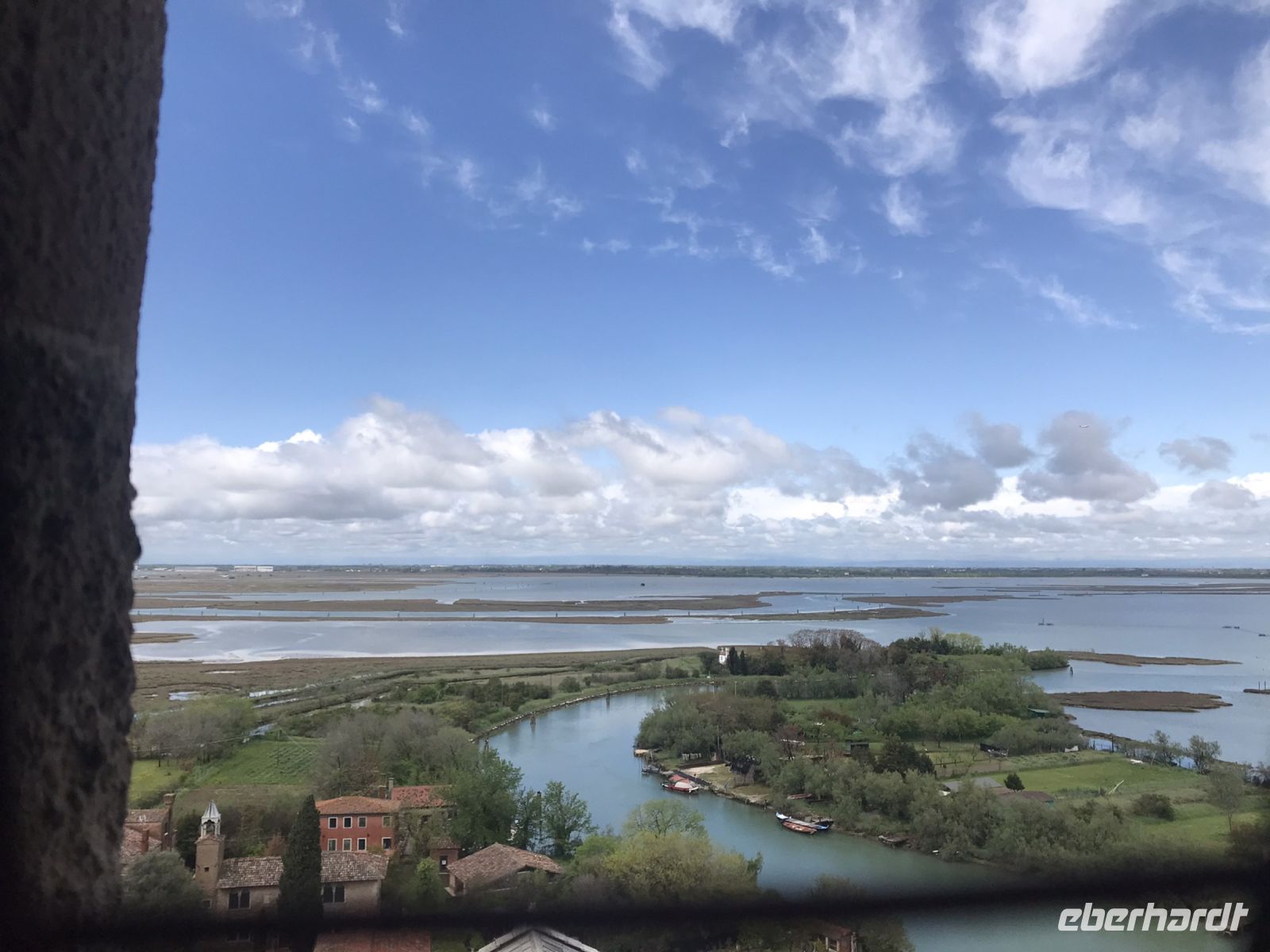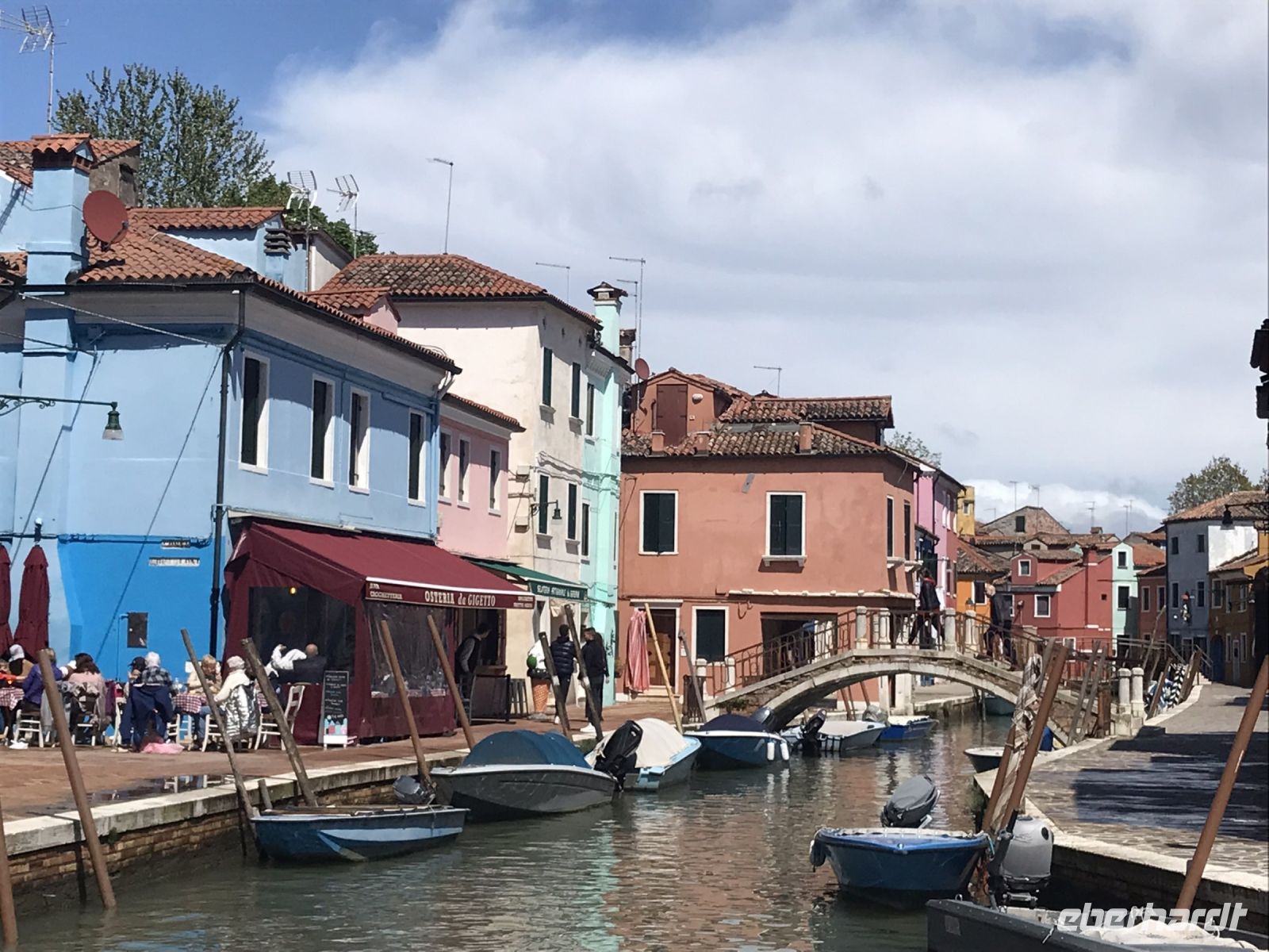 Wasser ist das Element, das Venedig zum Leben erweckt, das die Inselstadt über Jahrhunderte geschützt hat und auf dem sich der Reichtum und der Wohlstand der Stadtrepublik über Jahrhunderte begründeten. Wasser spielt auch heute noch eine wichtige Rolle in Venedig, es ist ein umschlingendes Element. doch wenn es- wie in unserem Fall- in Form von heftigem Regen von oben kommt und auch die Schuhe schnell durchnässt, wird es wenig geschätzt. In Murano, der Insel der Glasbläser, können wir immerhin die kalten Füße aufwärmen, wähend man uns vorführt, wie aus glühendem Glas förmlich im Handumdrehen ein sich aufbäumendes Pferd mit wehendem Schwanz wird, wie Vasen und Gläser geformt und bunt dekoriert werden. Bei anschließenden Spaziergang erhaschen wir die Blicke auf Häuser und Kirche und steuern dann als nächste Insel Torcelo an. Noch regnet es, doch bei einem stärkenden Kaffee und einer Pause am warmen Ofenfeuer wird auch die Stimmung wieder wohlig und warm. Auf Torcello besichtigen wir andächtig die Basilica, zünden ein paar Kerzen an und wir werden belohnt. Der Regen hat aufgehört und wir können noch die Rampen zum Turm hinaufsteigen und von dort einen Rundblick auf die Lagune genießen. Im Handumdrehen hat sich das Licht aufgehellt, das Grün leuchtet, die Wolken lassen sich vom Wind vertreiben und bei unserem Spaziergang auf der dritten Insel, auf Burano, blendet uns tatsächlich wieder die Sonne.