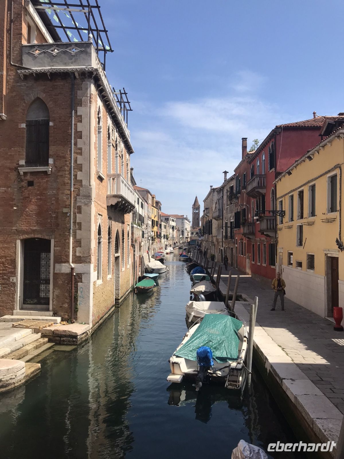 Die Accademia liegt mitten im Viertel Dorsoduro, dessen stille und abgelegene Ecken und Winkel wir bei einem anschließenden Spaziergang kennen lernen. Über den Kanal hinweg können wir auch einen Blick auf die noch bestehende Gondelwerft Squero San Trovaso richten. Sie ist die einzige noch verbleibende Werft, die es in Venedig gibt. Die Holzhäuser der Handwerker erinnern eher an eine Tischlerei, viele Werkzeuge stehen bereit, man kann erahnen, dass es viel Kunstfertigkeit braucht, um die Gondeln, die alle schwarz sind, zu bauen. Zehn Jahre lang, so erzählt uns Cristina, dauert er, bis man zum Gondelmeister wird.
