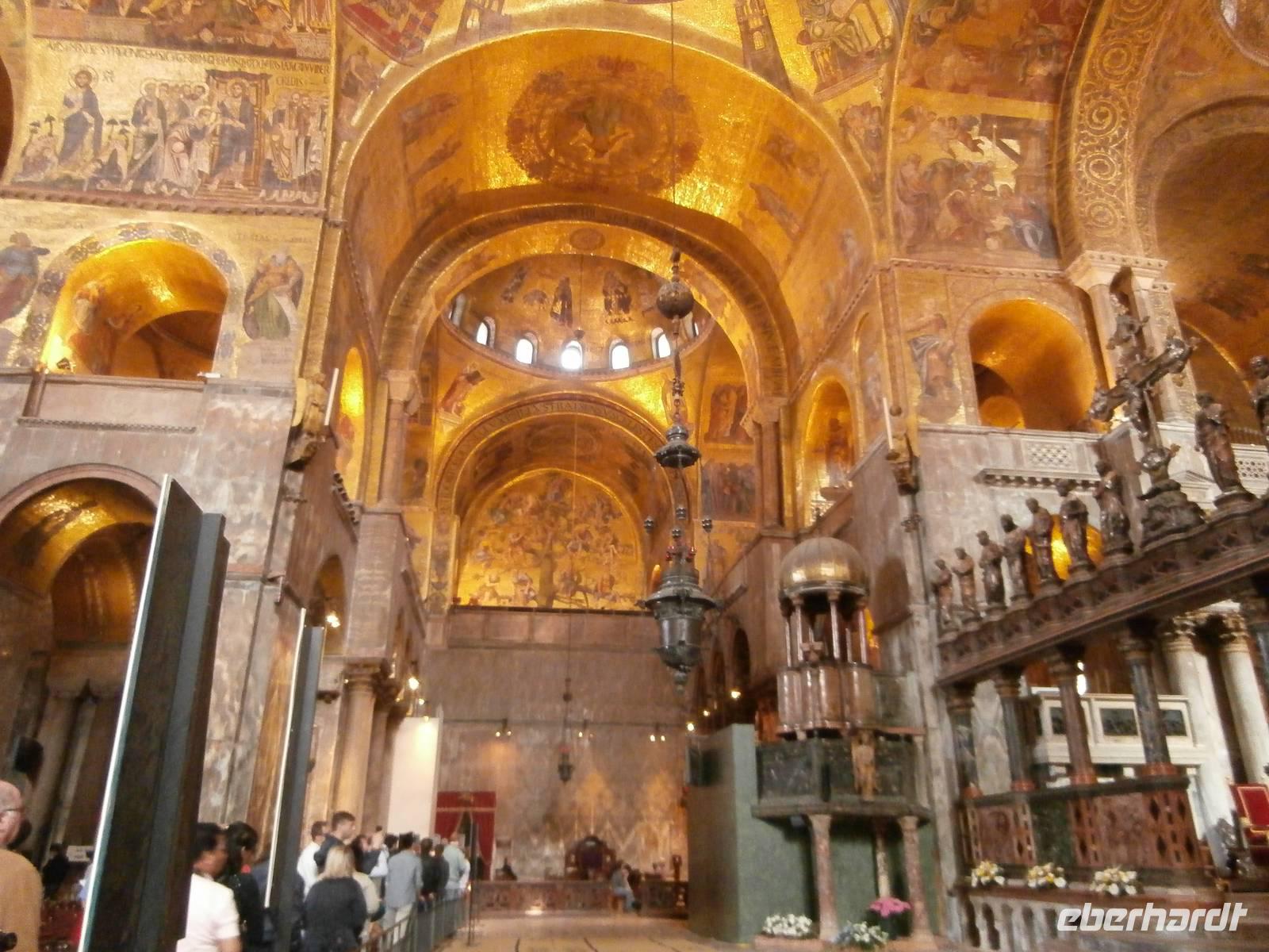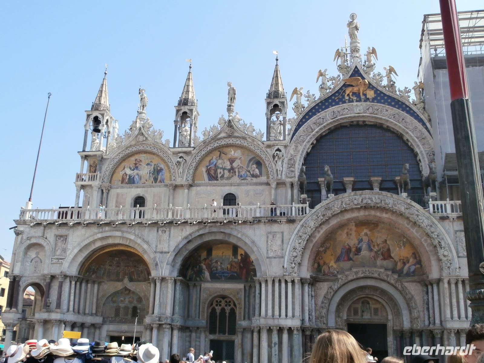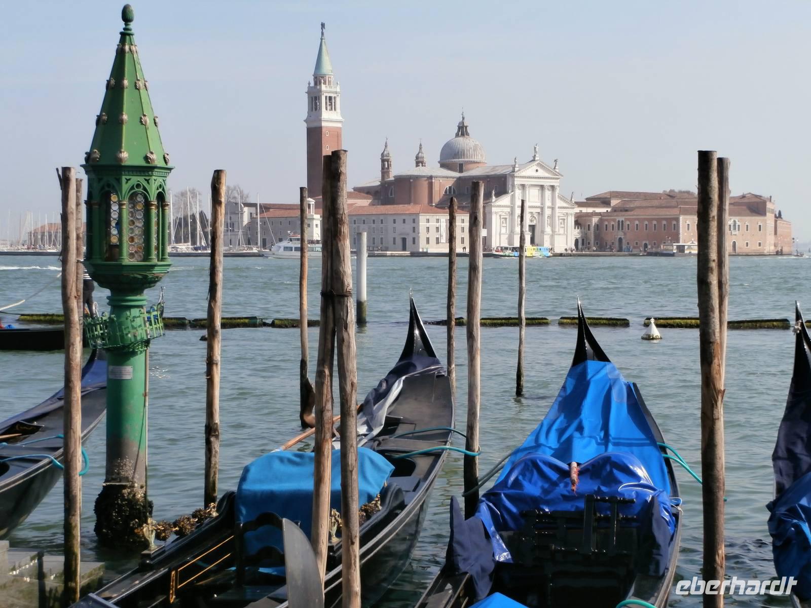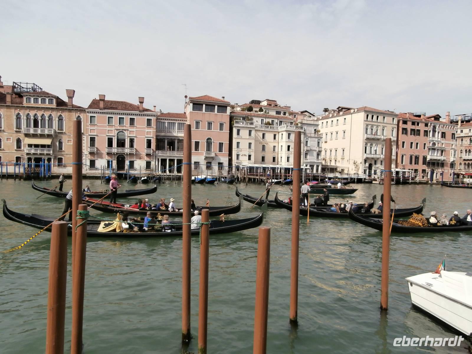 Mit dem öffentlichen Linienbus geht die Fahrt bis zur Punta Sabbioni, wir werden nun jeden Tag gemeinsam mit dem Bus dorthin fahren. Ingrid hat für alle die Fahrkarten organisiert und oft nehmen wir auch Sitzplätze im vollbesetzten Bus ein. Das Schiff von Marco Polo bringt uns in 30 Minuten Fahrt bis hinüber zur Ausstiegsstelle San Marco. Hier angekommen werden wir schon von Alessia, unserer örtlichen Reiseleitung in Venedig, erwartet. Sie stimmt uns herzlich ein auf diese einzigartige Stadt mitten in der Lagune, in der Wasser das alles beherrschende Element ist. Vorbei am Dogenpalast gelangen wir zum Markusplatz, sehen die Basilica San Marco auch von innen, den Campanile und den Torre dell' Orologio (Uhrenturm), Sonne, Mond und Sterne sind hier kunstvoll vereint in der Turmuhr. Bei angenehmen Temperaturen in Sonne ist es einfach märchenhaft an diesem ersten Tag in der Stadt der Löwen, Legenden und Leidenschaften. Am Nachmittag gönnen sich die Reisegäste ein herrlich romantisches Vergnügen, sie steigen in eine Gondel und lassen sich von den Gondolieri durch die vielen kleinen Kanäle bis hinein in den Canal Grande fahren. So kann man Venedig aus einer ganz anderen Perspektive sehen. Heute gibt es noch über 300 Gondeln, sie sind alle im privaten Besitz, aus Nussbaum Holz und in schwarzer Farbe bestehen sie. Im 16. Jahrhundert waren es über 10.000 Gondeln und damals das ganz normale Verkehrsmittel in der Wasserstadt.