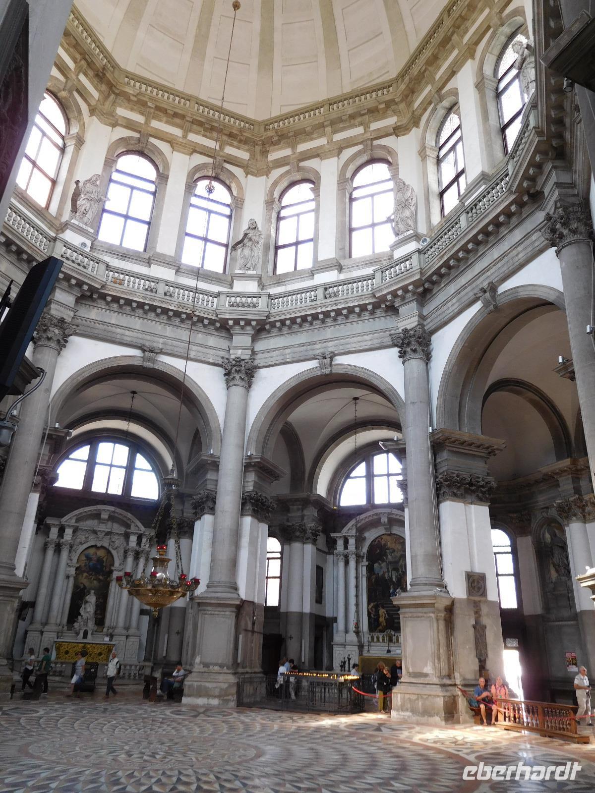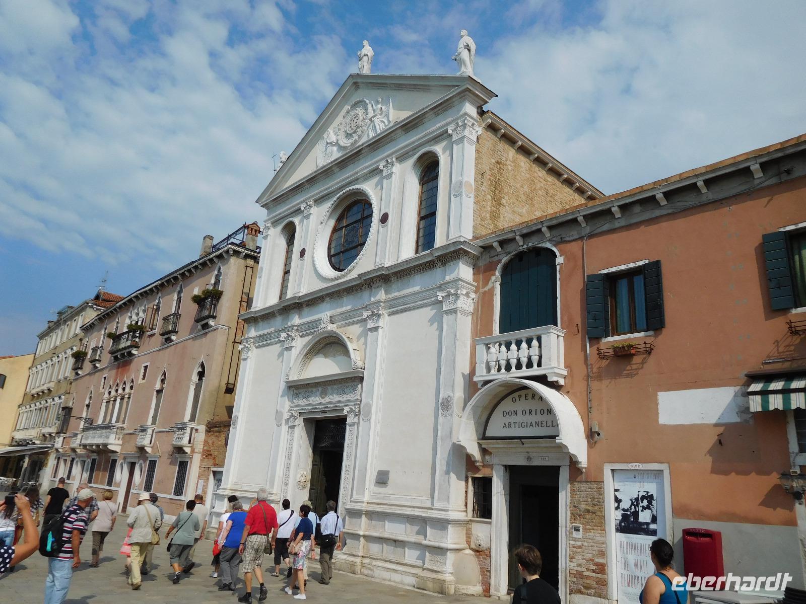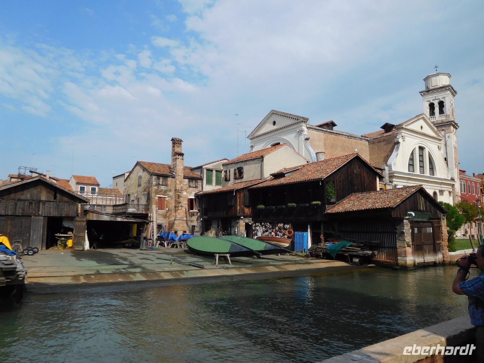 Wieder fuhr uns morgens ein Boot nach Zattere, wo Alessia uns erwartete. Zuerst gingen wir zu einer alten Gondelwerft im Dorsoduro gleich neben der Kirche San Trovasound schauten den Bootsbauern bei ihrer fast künstlerisch zu nennenden Arbeit zu. Schließlich muß jede Gondel auf Gewicht und Statur des Gondoliere genau abgestimmt sein und so sind alle quasi Unikate. Wir erliefen uns danach Dorsoduro bis an die Spitze der Insel zur Dogana, dem alten Zollamt und der daneben liegenden Kirche Santa Maria Salute, deren eindrucksvolle Kuppel Seefahrer und Ankommende von weiter Ferne begrüßt. Mit ihren beiden Tiziangemälden ist sie nicht nur architektonisch, sondern auch von der Ausstattung her ein Juwel.