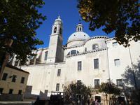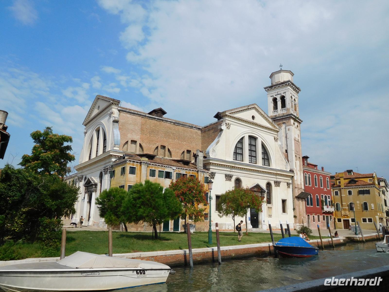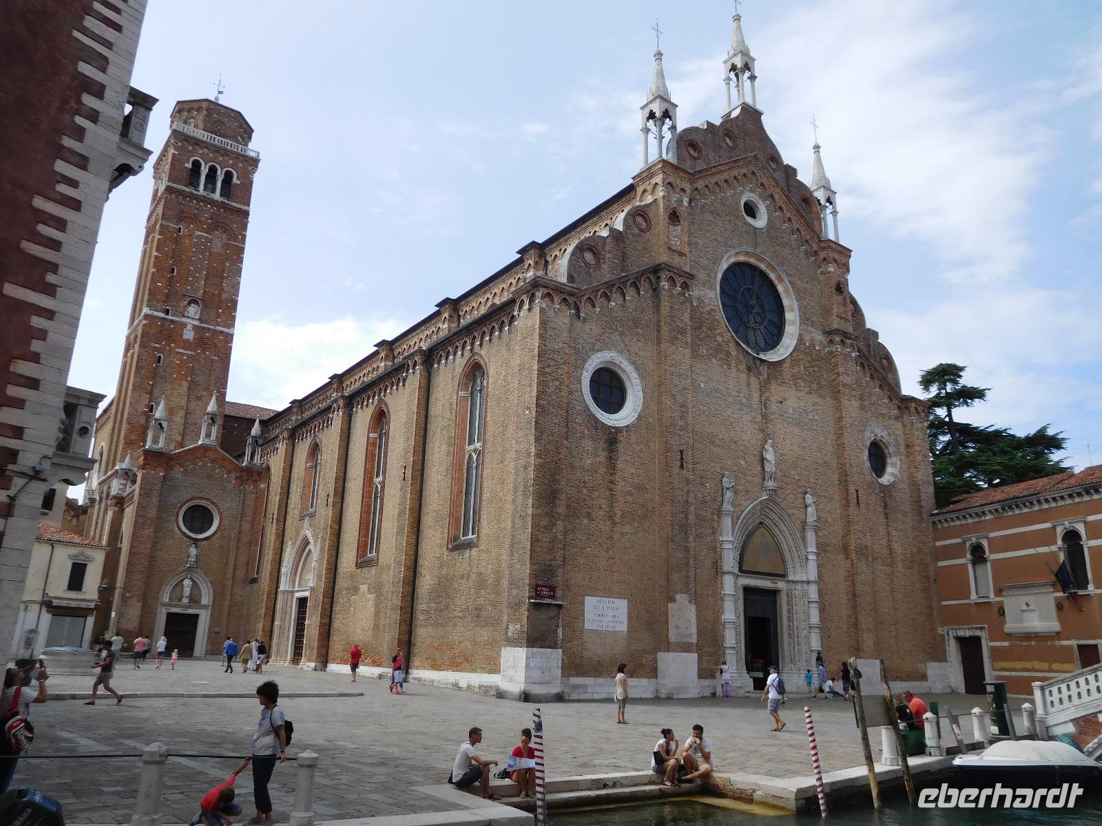 Anschließend spazierten wir zur Frarikirche, dem neben der Marcusbasilika und San Giorgio e Paolo wohl bedeutendsten Sakralbau der Stadt. 1926 erhielt sie den Ehrentitel einer päpstlichen Basilica minor. In den beiden ehemaligen zur Kirche gehörenden Klöstern befindet sich seit 1817 das Staatsarchiv Venedig. Um 1223 siedelten sich die Franziskaner in einem bestehenden Klostergebäude am Rand der damaligen städtischen Bebauung an. Dort begannen sie um 1250 mit dem Bau einer kleinen, der Gottesmutter geweihten Kirche, die 1280 konsekriert wurde. 1340 wurde diese rund 40 Meter lange Kirche abgerissen, um Platz für einen Neubau zu schaffen, da sie wegen des großen Zulaufs zu den Predigten der Brüder bald zu klein geworden war. 1361 wurden Apsis und Querhaus der nunmehr südwestlich ausgerichteten Kirche geweiht und der Bau des 1396 fertiggestellten Campanile durch die Baumeister Jacopo und Pierpaolo Celega begonnen. 1420 wurde im Auftrag von Marco Corner, des Vaters der späteren Königin Caterina Cornaro die Capella Corner südwestlich der Milanese-Kapelle angefügt. Sie ist dem Namenspatron ihres Auftraggebers, dem heiligen Markus, geweiht und beherbergt ein von Bartolomeo Vivarini geschaffenes Triptychon mit den Heiligen Markus, Hieronymus, Petrus, Nikolaus und Johannes dem Täufer. Südlich an das Seitenschiff anschließend wurde 1432 bis 1434 die dem heiligen Petrus geweihte Cappella Emiliana errichtet, eine Taufkapelle, die von den Stiftern, der Familie Emiliana, als Grablege genutzt wurde. Beide Kapellen verfügen jeweils über ein Portal zum Campo dei Frari. In der Mitte des 15. Jahrhunderts wurde im nördlichen Querhaus die Sakristei als eigenständiges Gebäude erbaut. 1468 erhielt die Kirche die ihre mit vierzehn Reliefs verzierten Chorschranken im Joch vor der Vierung, an denen Bartolomeo Buon mitgearbeitet haben soll. Das geschnitzte Chorgestühl wurde um 1468 vollendet. Gegen Ende des 15. Jahrhunderts wurde die Fassade fertiggestellt. In den Seitenschiffen sind die prächtigsten Grabmale wichtiger Dogen neben Epitaphen für bedeutende Venezianer, wie Tizian oder Canova zu bestaunen.