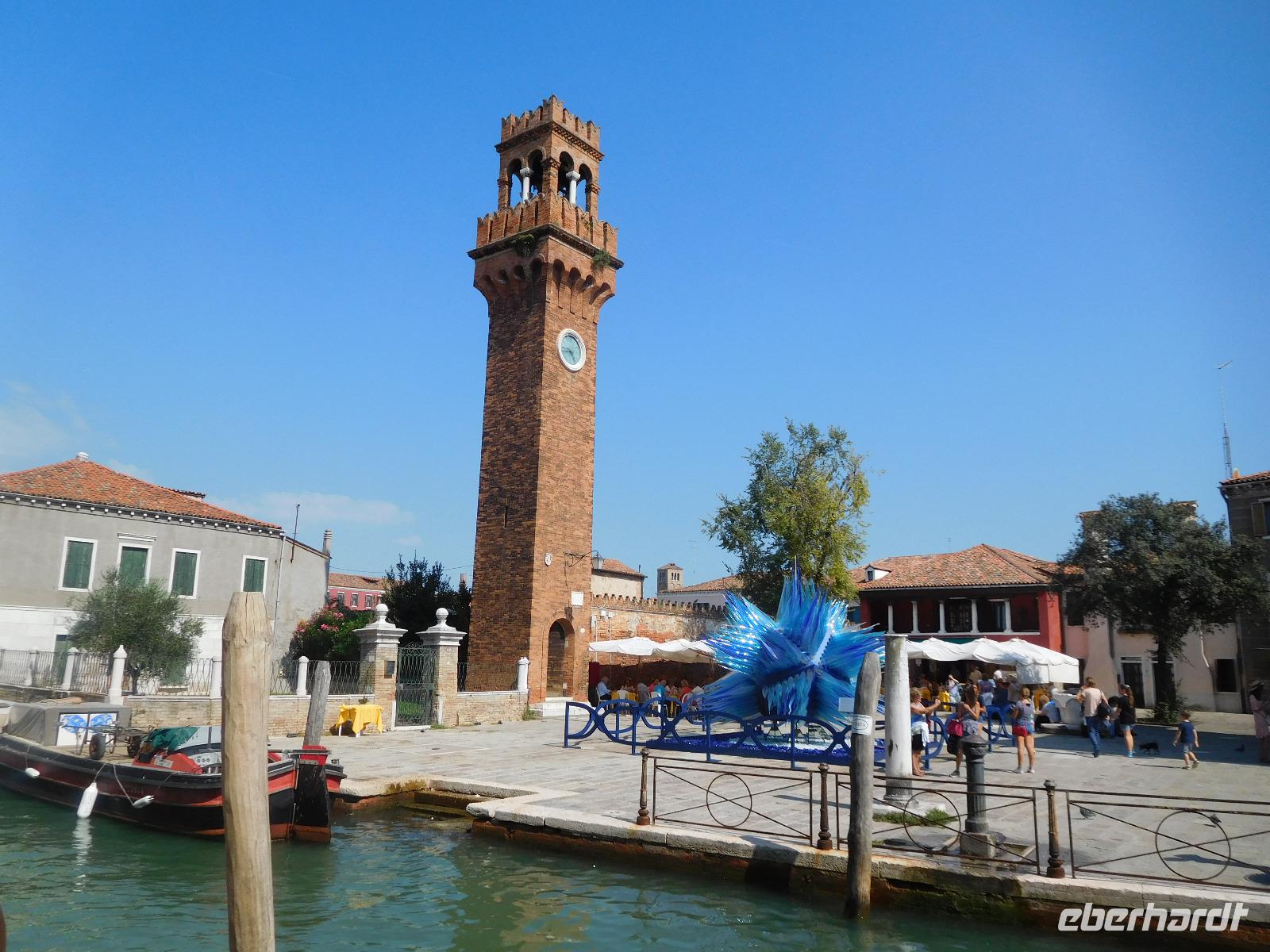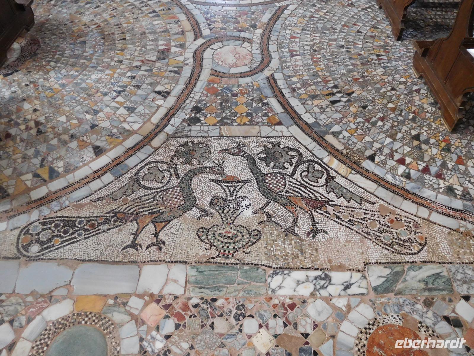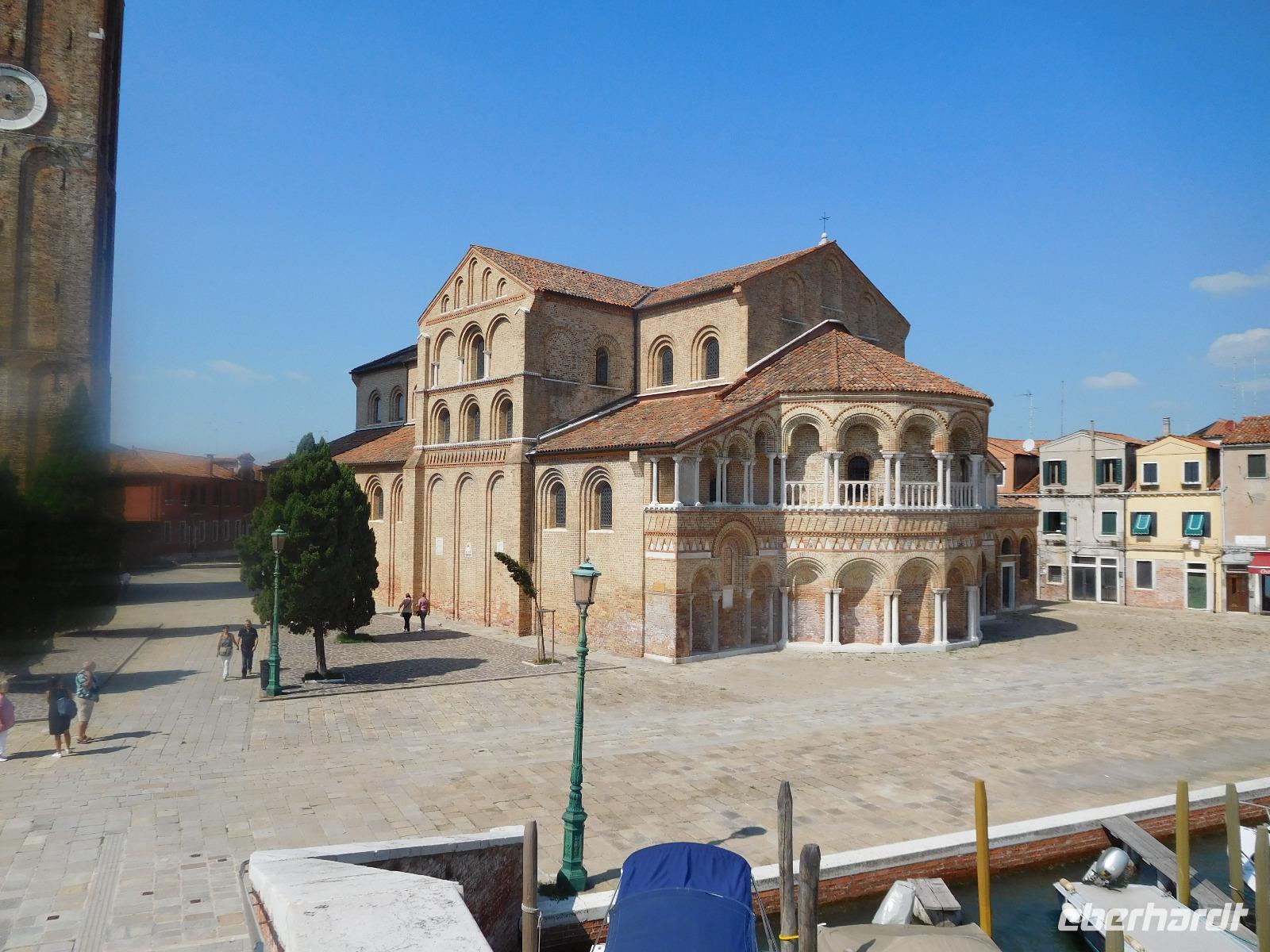Auf allgemeinen Wunsch der Gruppe nutzten wir die Flexibilität eines „eigenen" Privatbootes und erweiterten unser Programm durch einen Besuch der wahrscheinlich bekanntesten Laguneninsel Murano. Vorbei am Glasmuseum schlenderten wir zum romanischen Dom mit den markanten Apsiden, deren Gesims durch archaische Verzierungen hervorgehoben wird. Innen begeistert vor allem der antike Mosaikfußboden mit verschiedensten Mustern und Pfauen, die mit gespreizten Federn den Eingang bewachen. An den Schaufenstern einiger Glasboutiquen erklärte Alessia viel Interessantes zur Geschichte und Technik der Glasproduktion auf Murano.