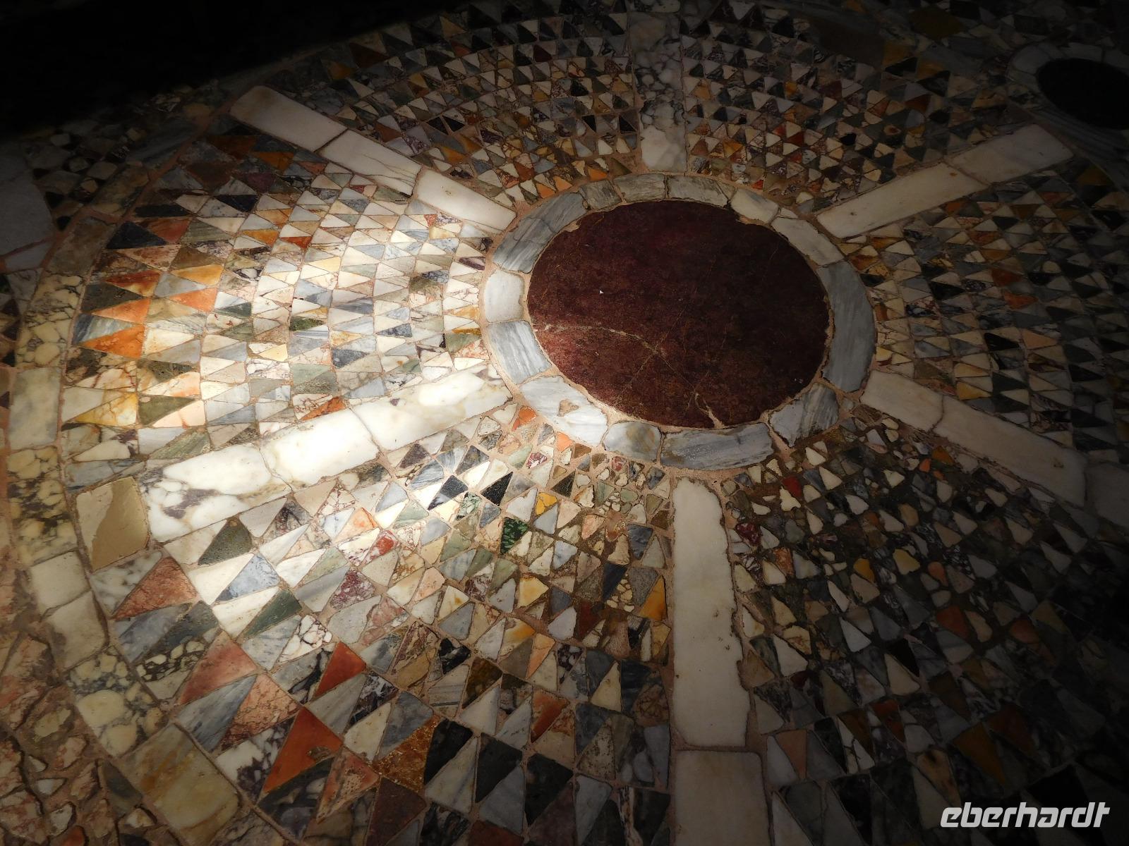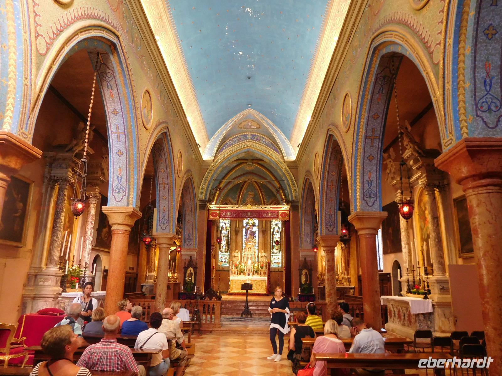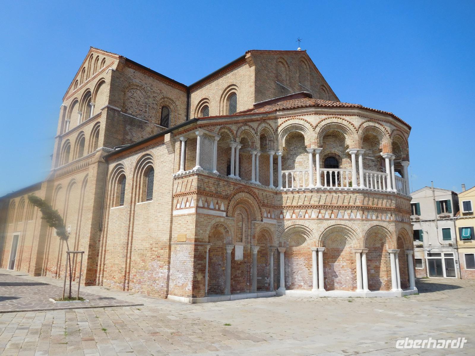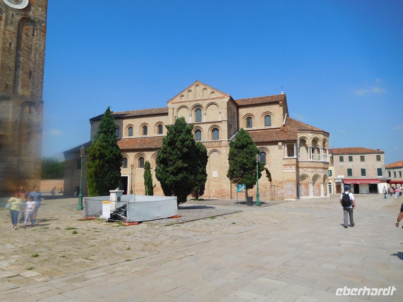 Auf allgemeinen Wunsch der Gruppe nutzten wir die Flexibilität eines „eigenen" Privatbootes und erweiterten unser Programm durch einen Besuch der wahrscheinlich bekanntesten Laguneninsel Murano. Vorbei am Glasmuseum schlenderten wir zum romanischen Dom mit den markanten Apsiden, deren Gesims durch archaische Verzierungen hervorgehoben wird. Innen begeistert vor allem der antike Mosaikfußboden mit verschiedensten Mustern und Pfauen, die mit gespreizten Federn den Eingang bewachen. An den Schaufenstern einiger Glasboutiquen erklärte Alessia viel Interessantes zur Geschichte und Technik der Glasproduktion auf Murano.