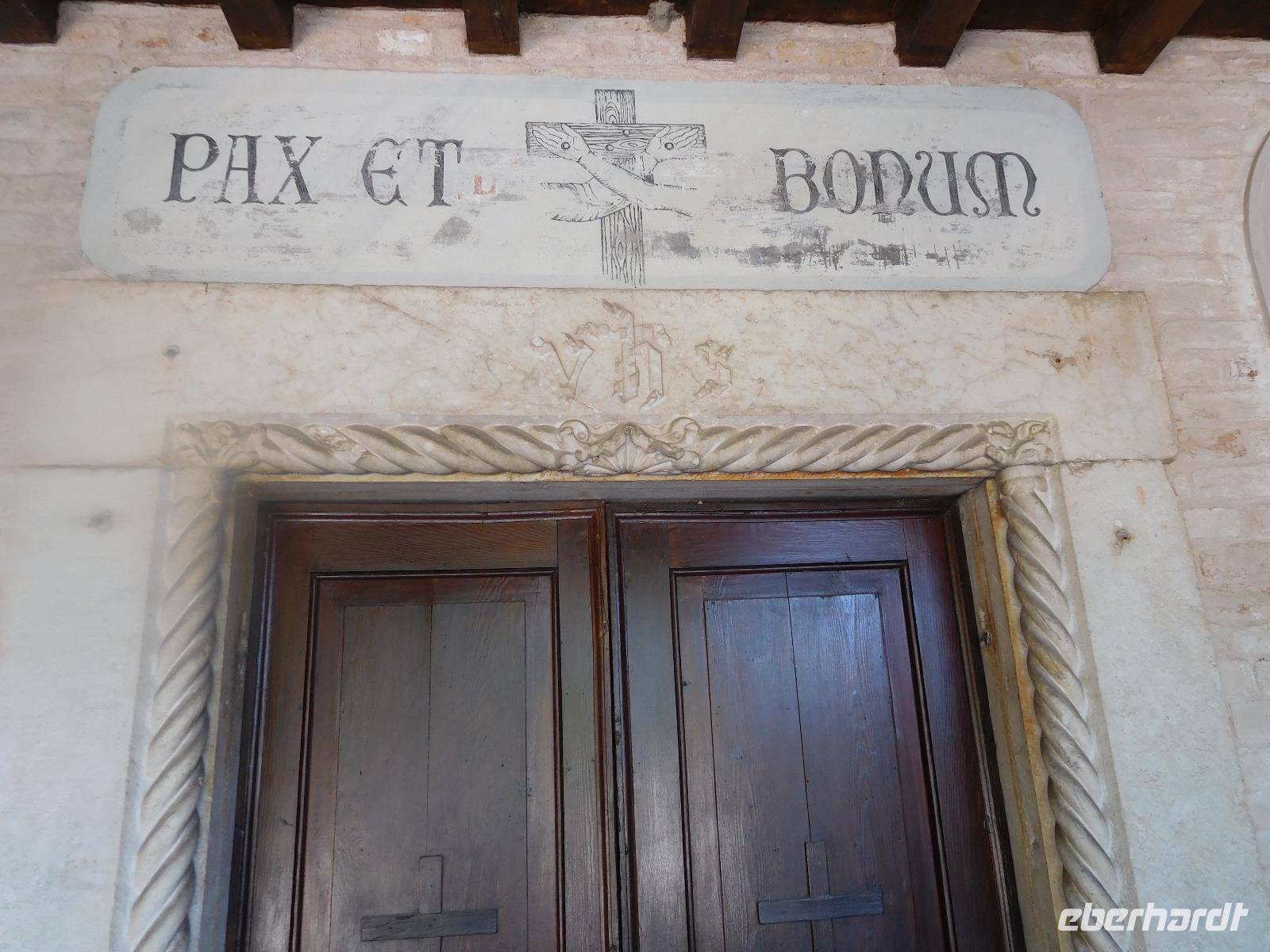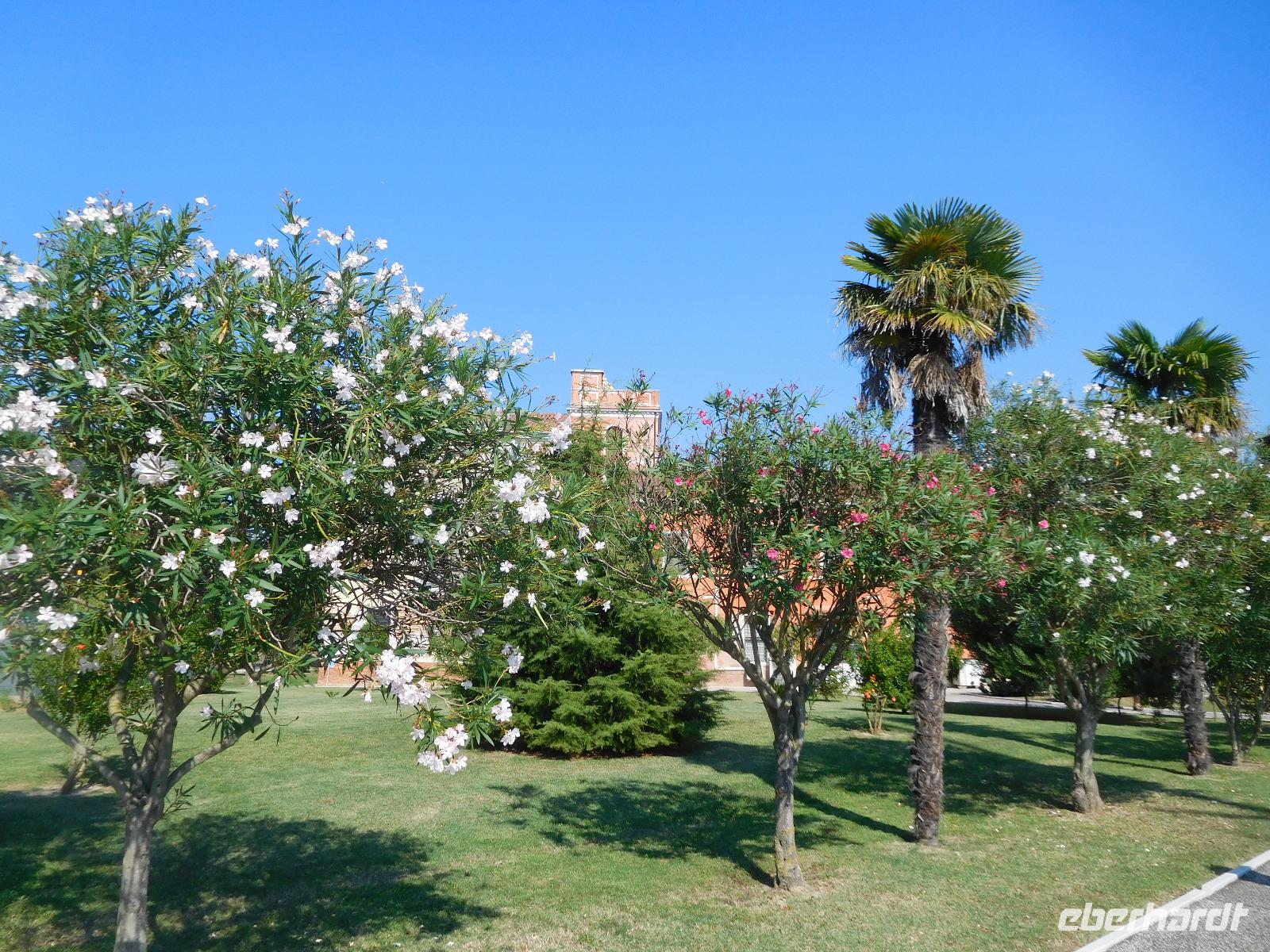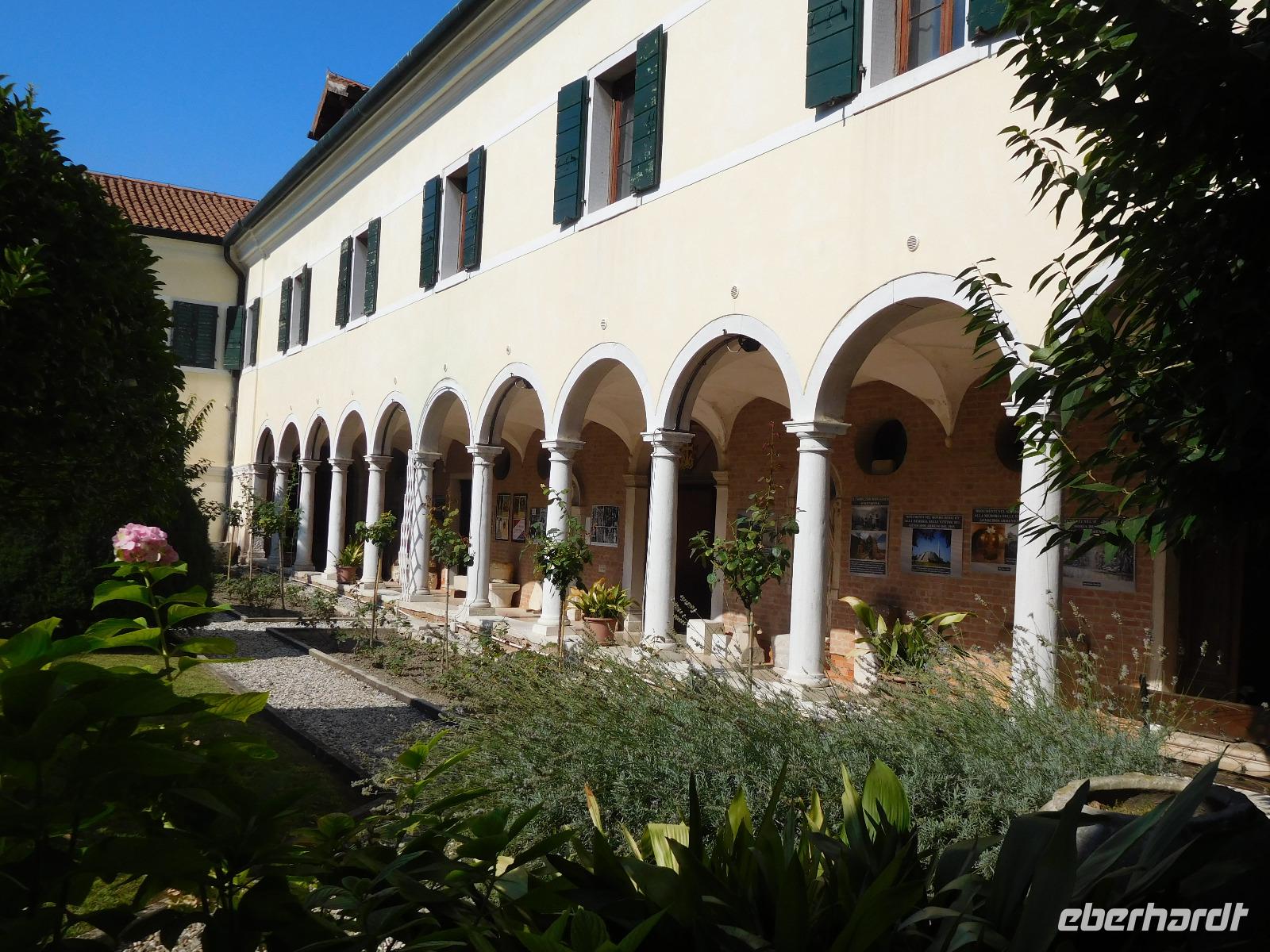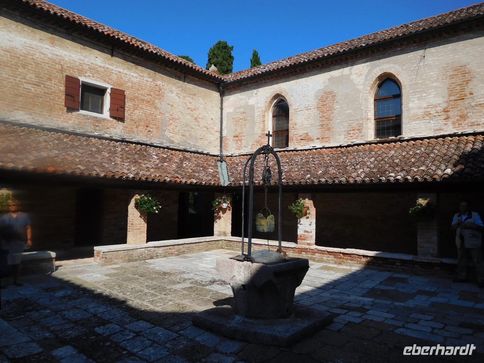 Erstes Ziel war San Francesco del Deserto, eine knapp 3,7 ha große Insel zwischen Burano und Sant'Erasmo in der Lagune von Venedig. Sie war in römischer Zeit bis etwa 650 bewohnt, musste dann aufgegeben werden, um im 13. Jahrhundert neubesiedelt zu werden. Das dortige Kloster geht auf einen legendenhaften Besuch des heiligen Franz von Assisi zurück. Die Insel ist 300 Meter lang und bis zu knapp 170 Meter breit, sowie bis zu einem Meter hoch. Die Flächenausdehnung beträgt 3,68 Hektar (36.832 Quadratmeter). Die Insel wies zur Volkszählung 2001 neun Bewohner auf, davon waren acht Männer. Uns führte ein freundlich agiler Mönch von achtzig Jahren, dessen Händen man ansah, dass sie auch körperliche Arbeit gewöhnt waren.