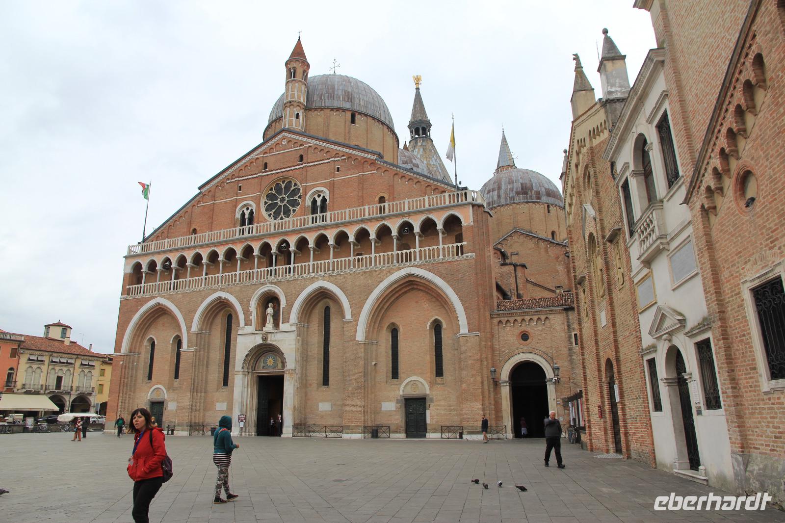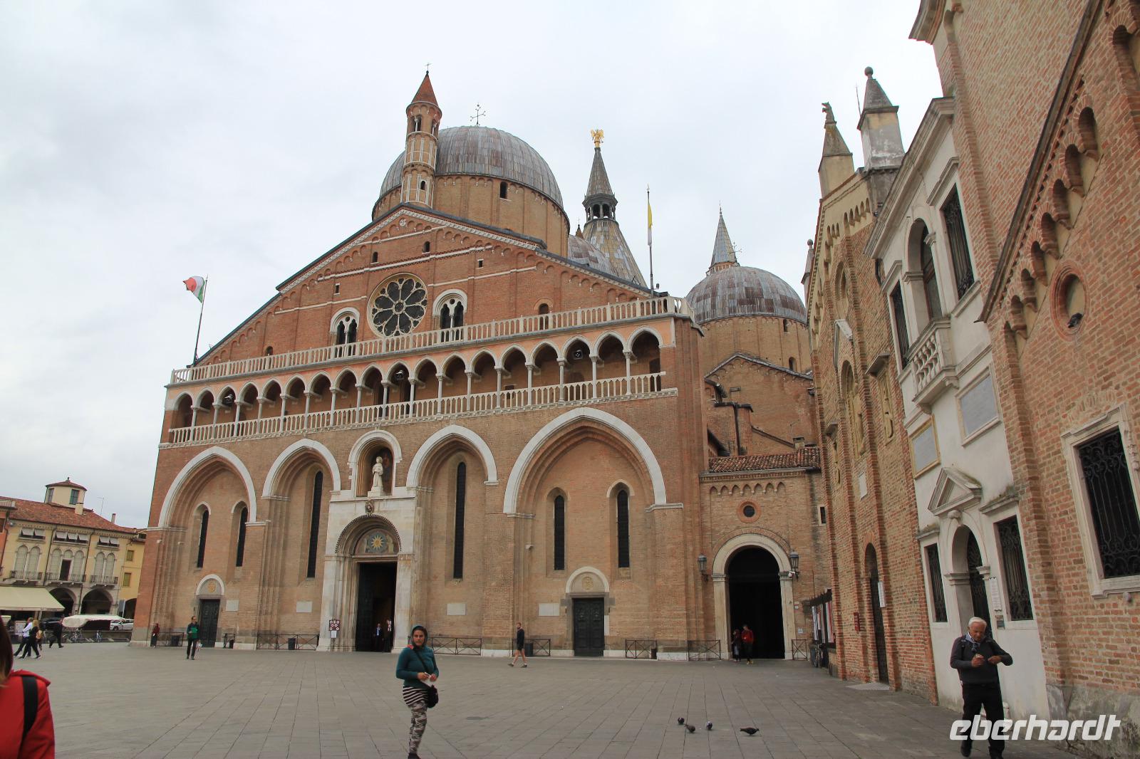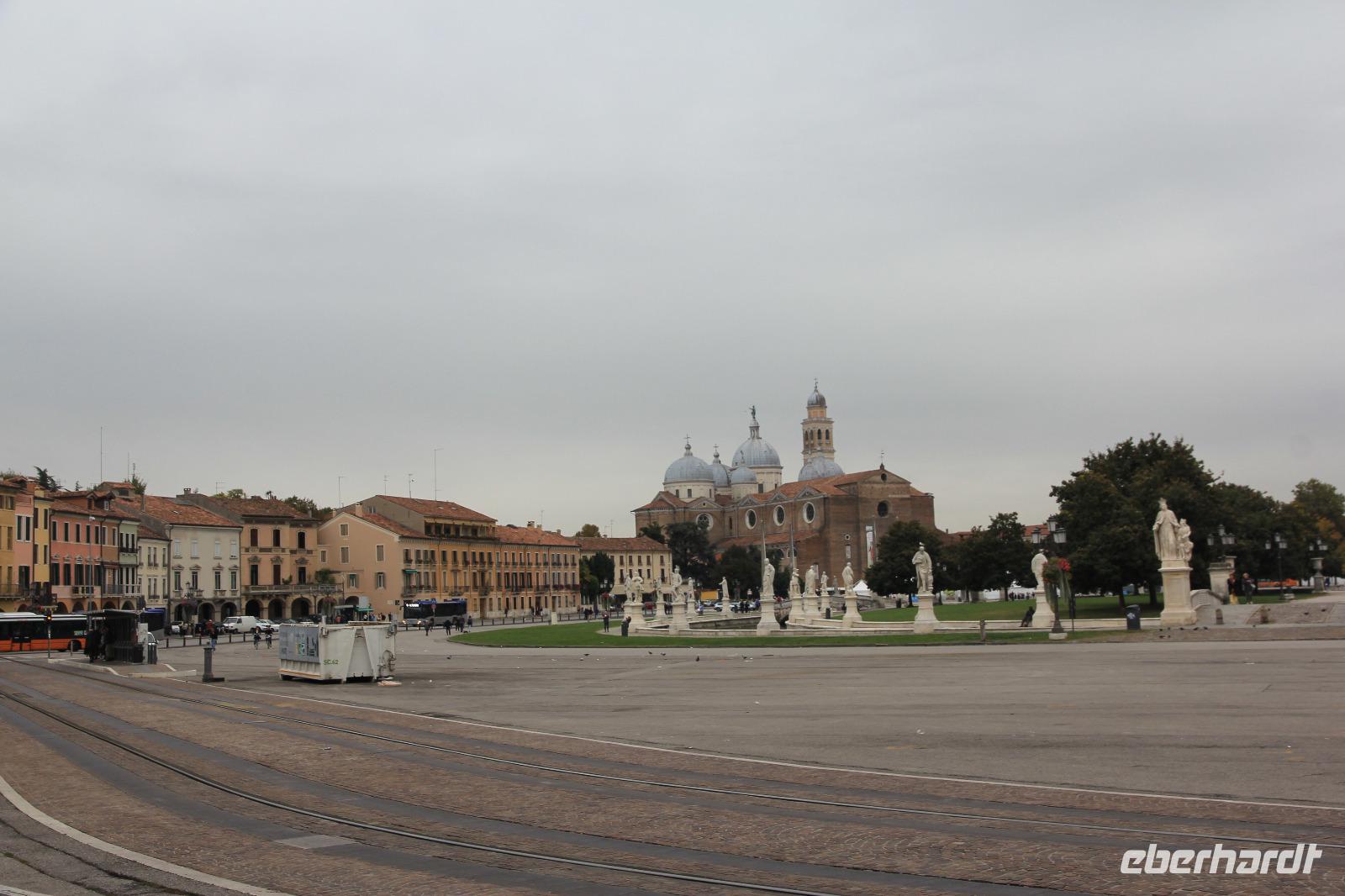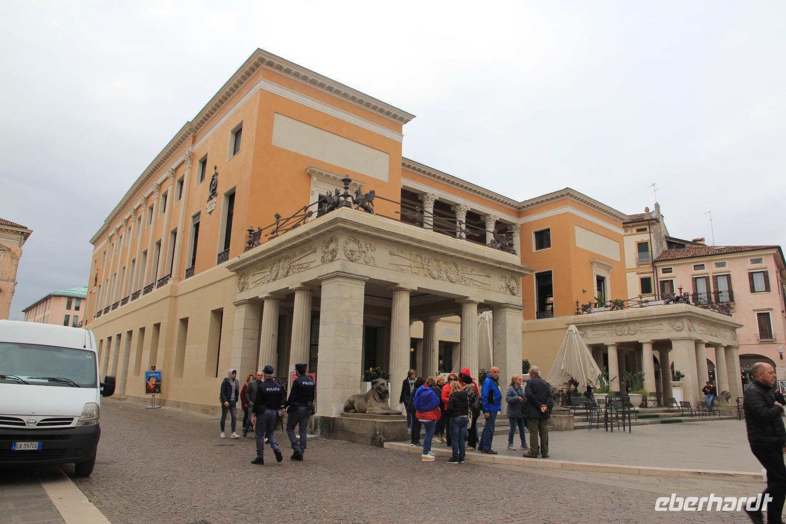 Heute steht die eine halbe Stunde Busfahrt entfernte Universitätsstadt Padua auf unserem Programm, leider ist es Montag und damit der Schließtag vieler Museen in Italien. Aber die bedeutendste Sehenswürdigkeit in Padua, die Scrovegni-Kapelle, ist geöffnet. Wir sind für den Besuch angemeldet, aber es gibt keine Audioguides in deutscher Sprache. Auch der obligatorische Film im Vorraum der Kapelle ist auf Italienisch mit englischen Untertiteln. Trotzdem gelingt es der Reisebegleitung, die kunsthistorische Bedeutung des Werkes von Giotto di Bondone als richtungsweisendes Werk der frühen Renaissance deutlich zu machen. Unser anschließender Spaziergang durch die Stadt führt uns am Café Pedrocchi, am Rathaus, der Universität und dem Palazzo della Ragione vorbei - und wird durch eine Mittagspause in einem urigen Lokal unterbrochen. Unsere Stadtführerin macht uns mit der Baugeschichte wichtiger Gebäude und der Stadtanlage vertraut. Danach geht es zum ellipsenförmigen Platz Prato della Valle: wir sehen von außen die Amulea-Loggia und Basilika Sante Giustina. Anschließend treten wir in die St.-Antonius-Basilika ein. Wir bewundern im Innern der Grabeskirche für den Heiligen Antonius u.a. Donatellos Jungfrau auf dem Throne mit dem Kind und den kunstvollen Reliquienschrein. Den Rückweg zu einer Stelle, an der uns der Transfer zum Hotel wieder aufnehmen kann, müssen wir unter Arkaden nehmen, weil es in Strömen regnet. Es ist gut, dass wir am Abend gleich in der Nachbarschaft des Hotels unser Abendessenrestaurant haben und damit nur wenige Schritte durch den Regen haben.