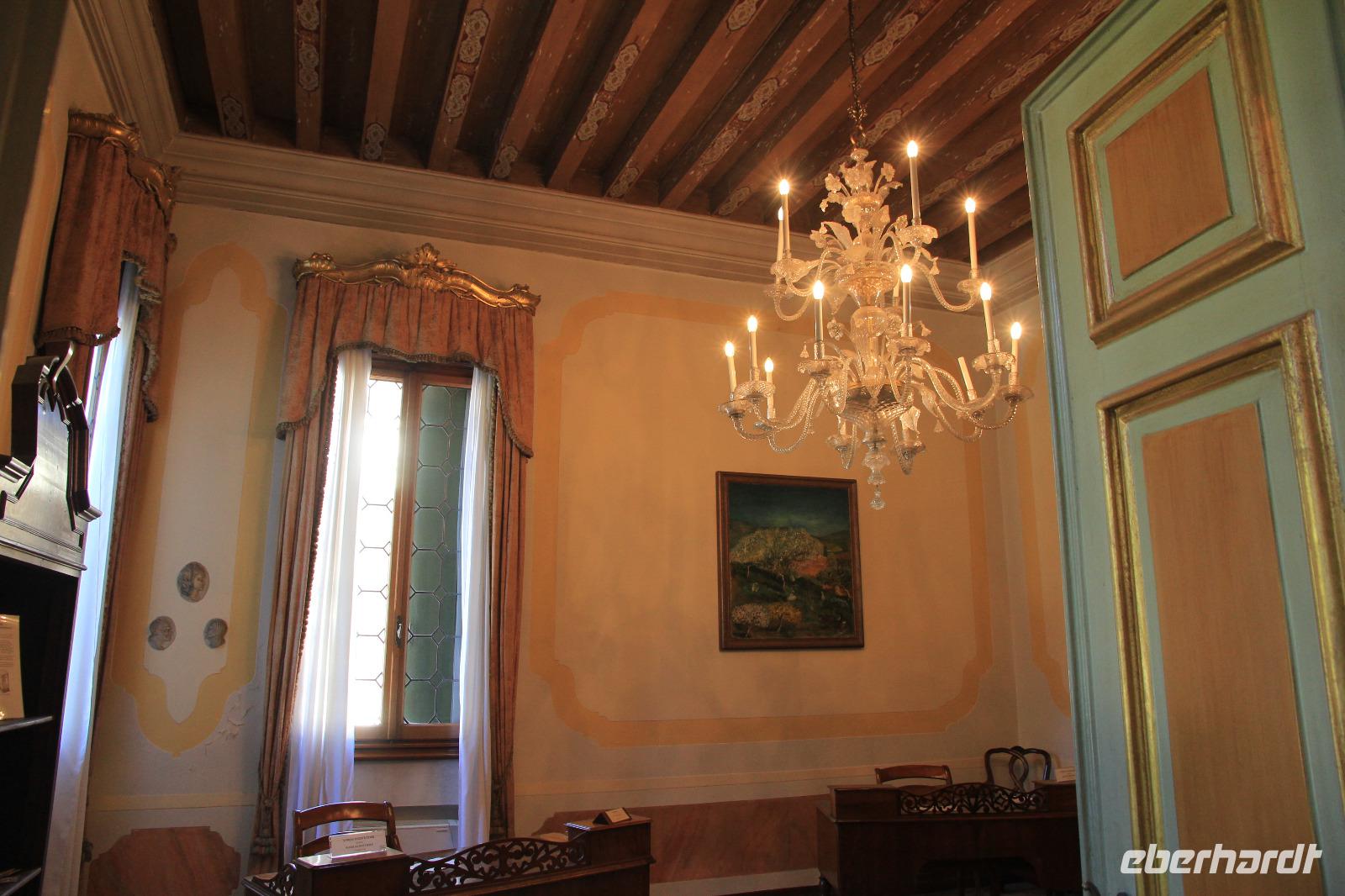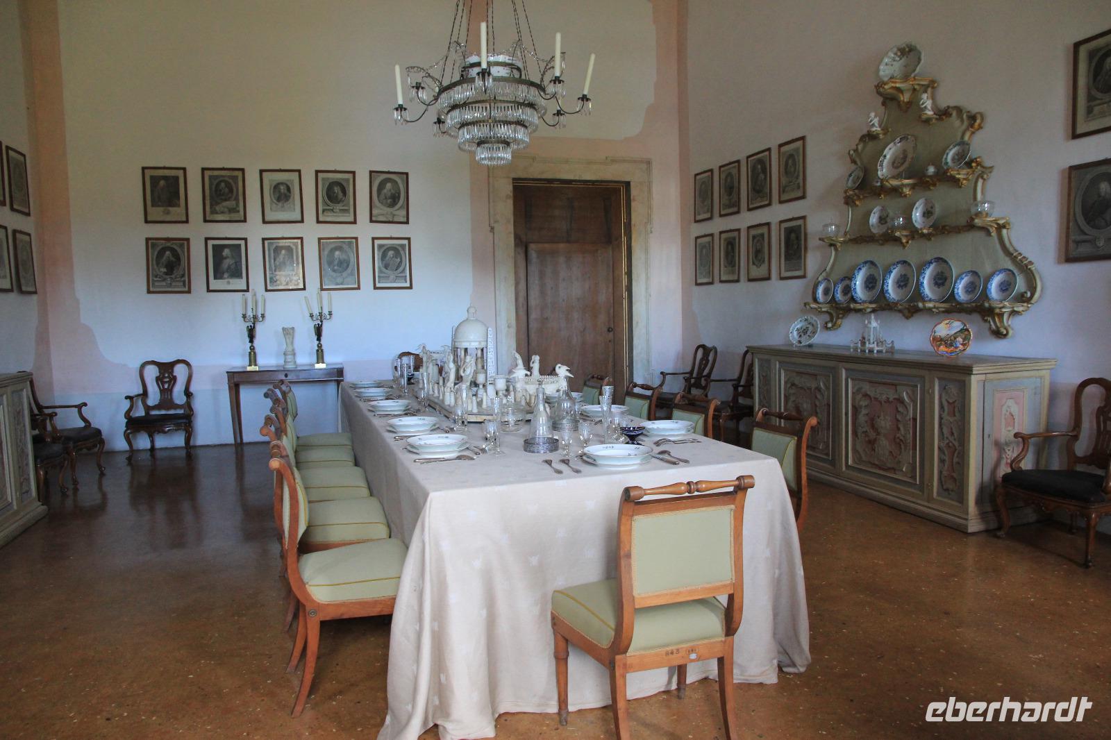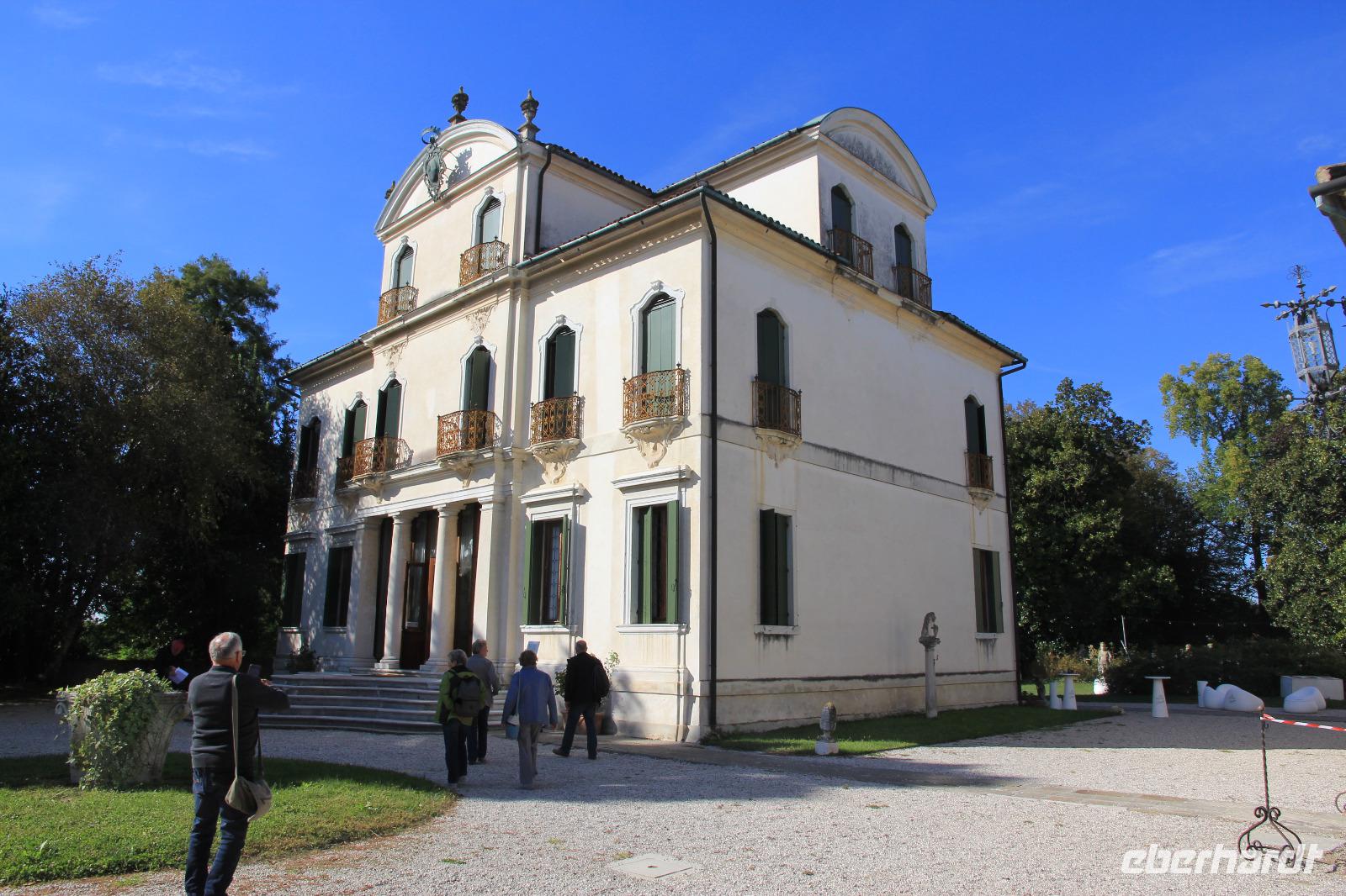 Heute lacht uns wieder die Sonne: Es stehen drei sehr unterschiedliche und doch beeindruckende Villen auf unserem Besuchsplan. Zuerst besichtigen wir die Villa Pisani, deren Erbauer bei der Planung nicht so sehr an eine Villa, sondern an das Schloss von Versailles dachte. Der 114. Doge von Venedig, Alvise Pisani, lebte viele Jahre in Paris und konnte sich nur vorstellen, mit demonstrativ zur Schau gestelltem Reichtum regieren zu können. Im Jahre 1934 wählte der dem Dogen wahrscheinlich charakterlich ähnliche Mussolini genau diesen Prunkbau für sein erstes Zusammentreffen mit Hitler. Trotzdem genießen wir die Schönheit und die Verspieltheit des Parkes. Weiter geht es auf dem Brenta-Kanal, unser Burchiello wird von Kapitän Alessandro gesteuert, der unverhohlen mit unserer Reiseführerin Irene schäkert. Wahrscheinlich brennt bei ihm "Das Feuer" von D'Annunzio. Wir passieren zwei Schleusen und mehrere Brücken werden für uns, die Durchfahrt ermöglichend, verdreht. Die Villa Widmann gefällt uns aufgrund ihrer Zartheit und Kunst. Wir erfahren viel über die Geschichte der Familie der Besitzer. Jetzt wechseln wir noch einmal auf ein schnelleres Schiff, mit dem wir Malcontenta nahe der Lagune von Venedig erreichen. Nach artigem Klingeln am Eingangstor betreten wir das Grundstück der Familie Foscari, die ihren alten Besitz, die von Andrea Palladio entworfene Villa Foscari, wieder erhalten und restauriert hat und jetzt noch bewohnt. Irene schildert uns das wechselvolle Schicksal des Gebäudes und erklärt die künstlerische Botschaft der Architektur und der Fresken in den Innenräumen. Zufrieden mit dem Erlebten und dem Erfahrenen kehren wir ins Hotel zurück und genießen dann ein Abendessen in einem benachbarten Restaurant.