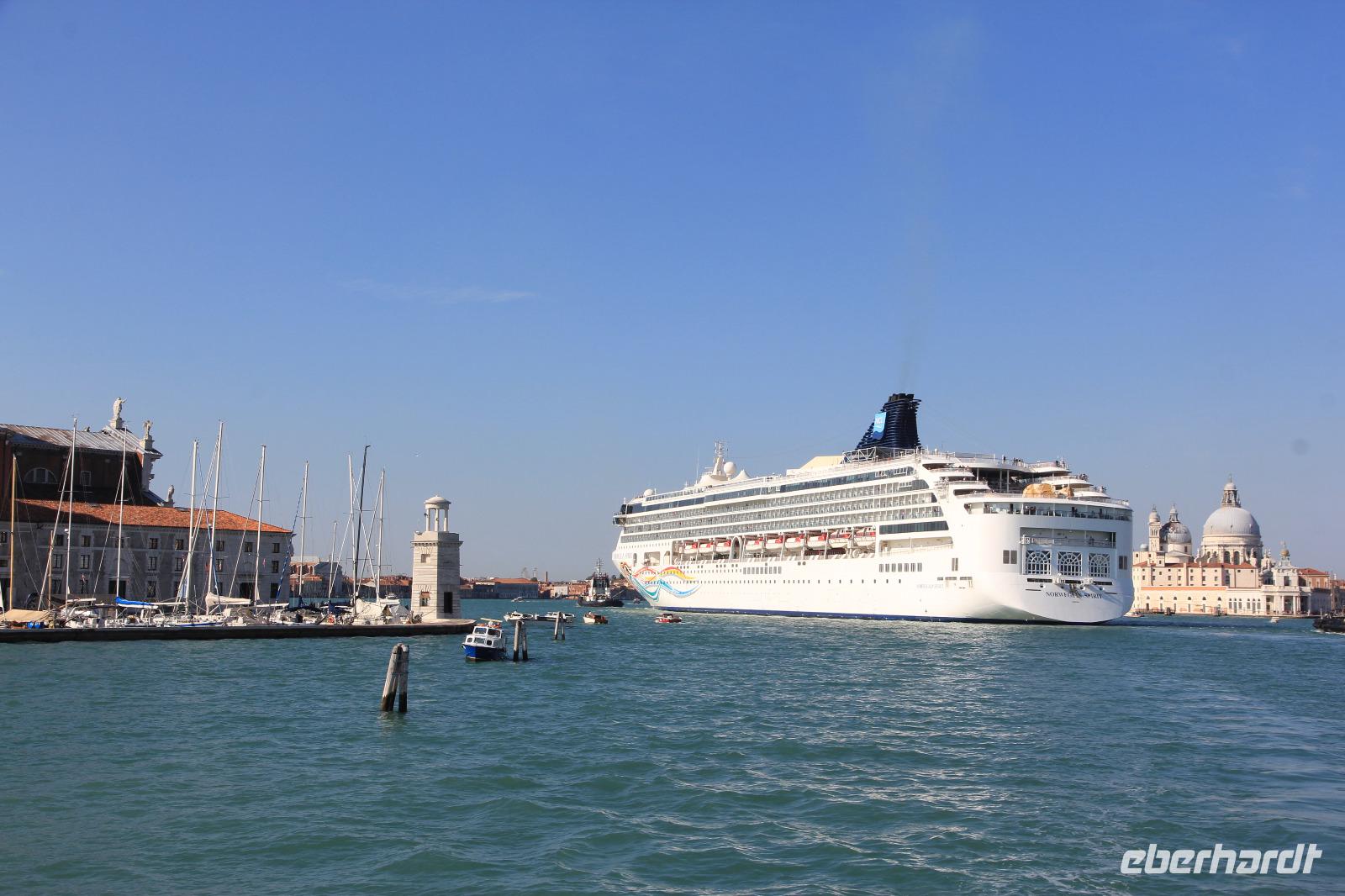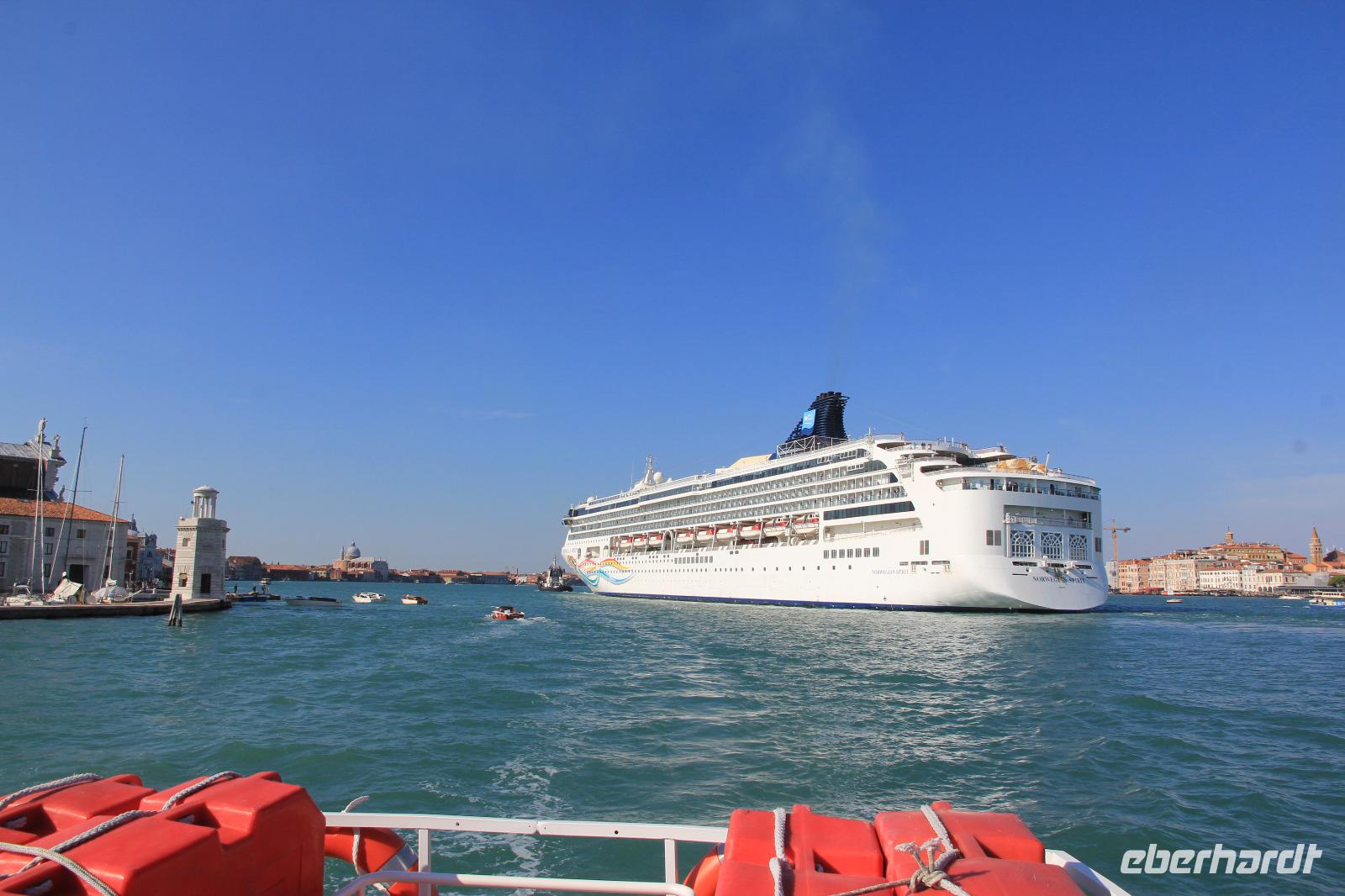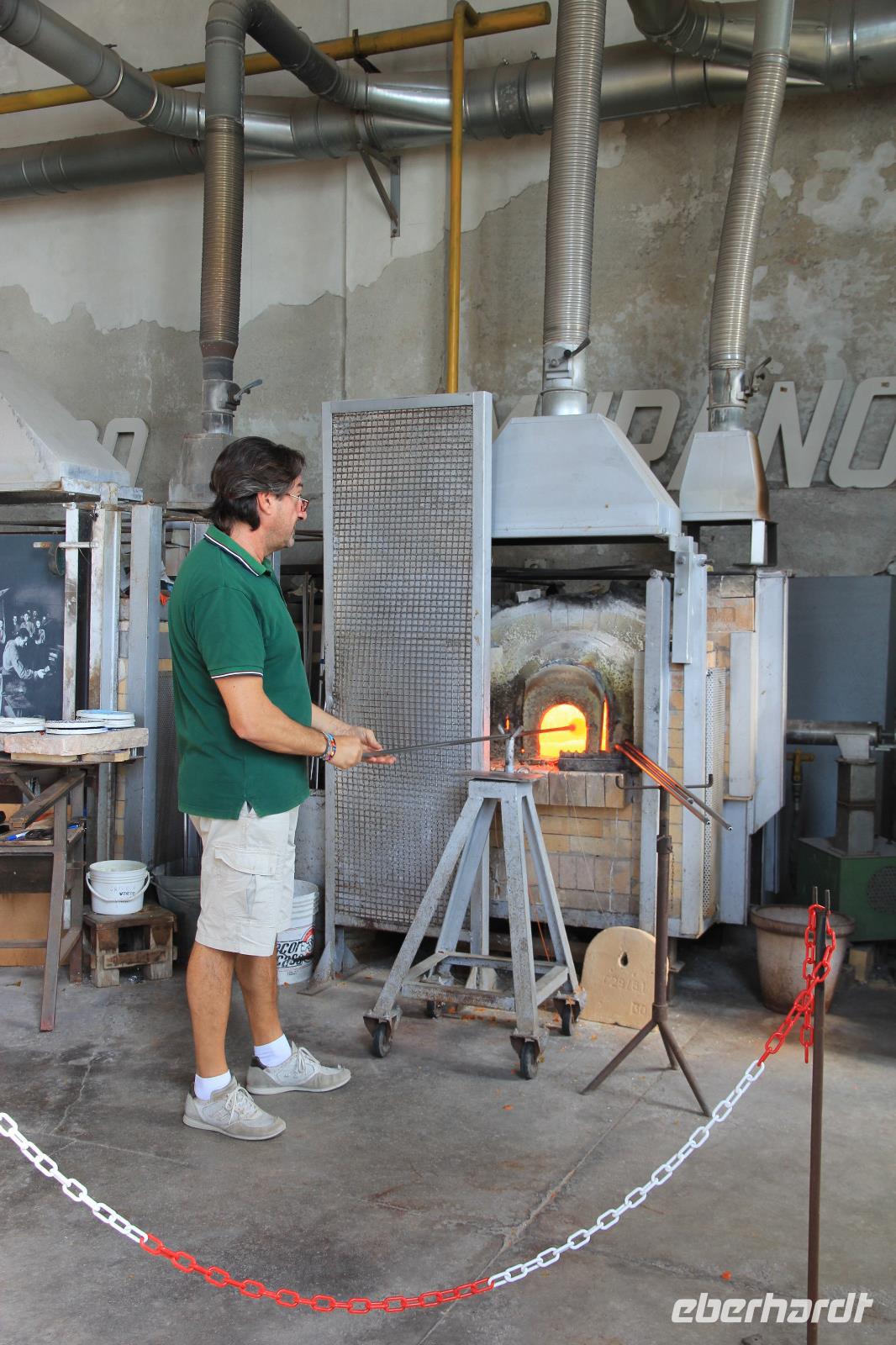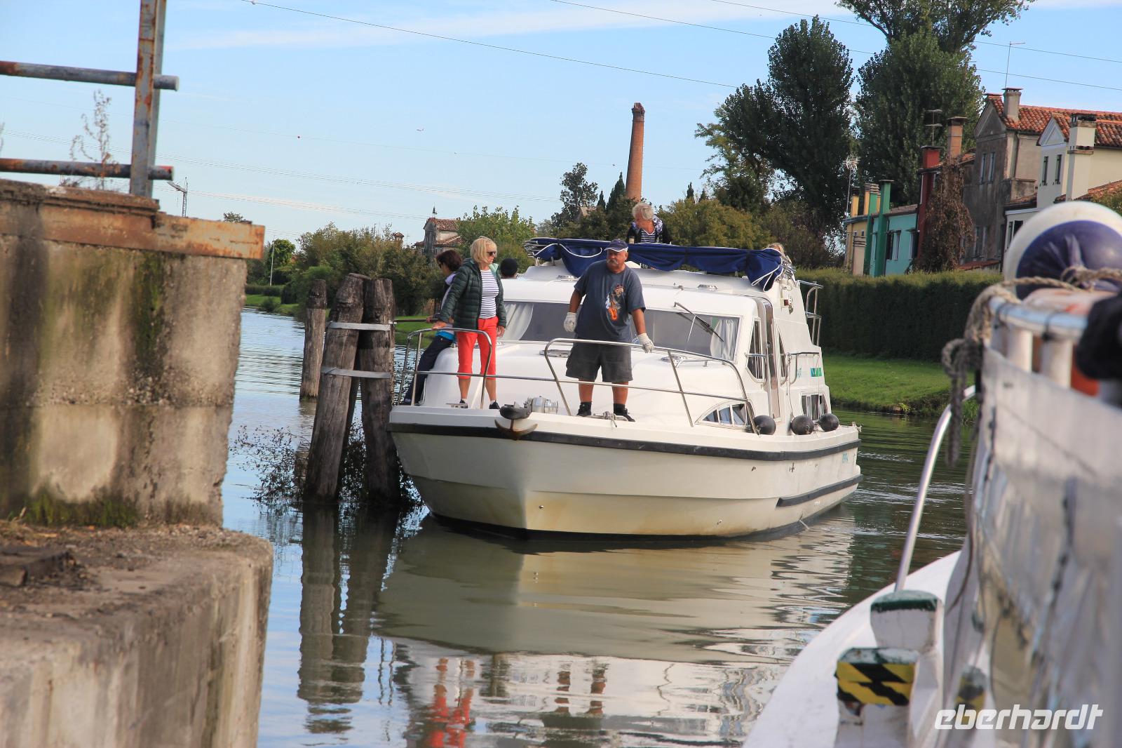 An der Schiffsanlegestelle von Fusina besteigen wir wieder das Boot von Kapitän Alessandro. Heute macht uns die quirlige und gestenreiche Barbara mit der Wasser- und Landschaft der Lagune bekannt. Wir durchfahren den Giudecca-Kanal, konzentrieren uns ganz auf die von ihr erklärten Gebäude beiderseits des Kanals, da schiebt sich plötzlich ein Riesen-Kreuzfahrtschiff vor die Augen- und Kamera-Linsen. Als der Blick wieder befreit ist, bewundern wir die Szenerie am Canale di San Marco. Weiter geht es um die Hauptinsel herum in den Norden der Lagune nach Murano, die Insel der Glasmacher und -bläser. Wir überzeugen uns bei einer Vorführung des Glasblasens von dieser handwerklichen Kunst und entrichten an diese unseren Tribut, indem wir im Werkverkauf gegen Geld zerbrechliche Geschenke für unsere Lieben zu Hause eintauschen. Wir schiffen dann an der langgestreckten Insel St. Erasmo vorbei, dabei genießen wir ein von Smutje Michele gezaubertes 3-Gänge-Mittagsmahl mit Wein und Prosecco. Die Insel Torcello hat nur noch wenige Einwohner, macht aber einen charmanten Eindruck und besticht durch die tausendjährige Kirche Santa Maria Assunta, die u.a. mit byzantinischen Mosaiken die Kirchenkunst des frühen Mittelalters bewahrt. Es ist heute kaum vorstellbar, dass diese Insel vor hunderten Jahren von tausenden Menschen bewohnt und Bischofssitz war. Weiter geht es zur Nachbarinsel Burano, welche aufgrund seiner farbigen Häuschen ein begehrtes Foto- und Selfi-Motiv und damit Ziel des Massentourismus ist. Während die Herren der Schöpfung fotografieren, werden die Frauen in zahllosen Geschäften zum Kauf schöner Dinge zum Schmücken und Bekleiden verführt. Wir genießen hier noch einmal einen Spaziergang in der Sonne und treiben mit dem Strom der Touristen. Auf dem Rückweg bewundern wir vom Schiff aus das in der Abendsonne erstrahlende Venedig. Wir danken Barbara für die lebendigen Erklärungen und freuen uns auf den morgigen Landgang in Venedig.