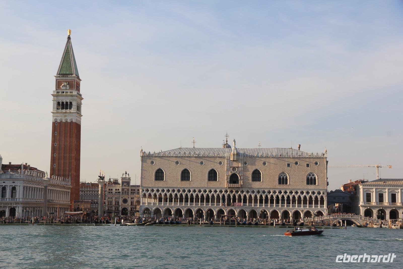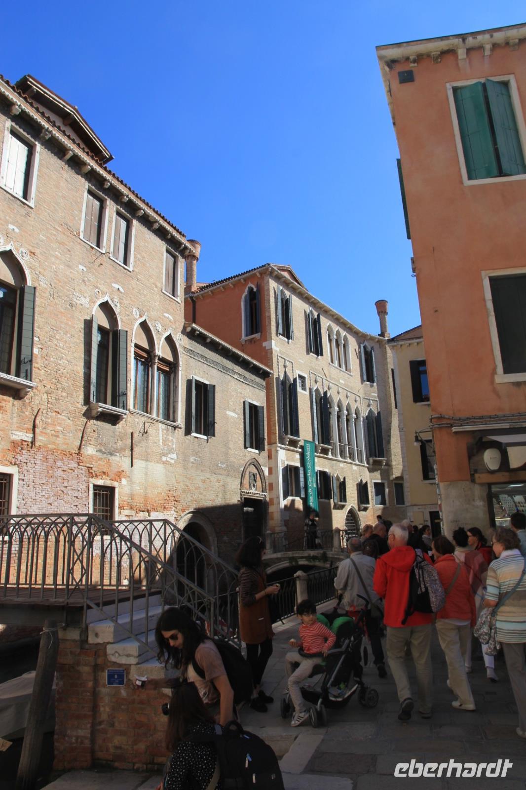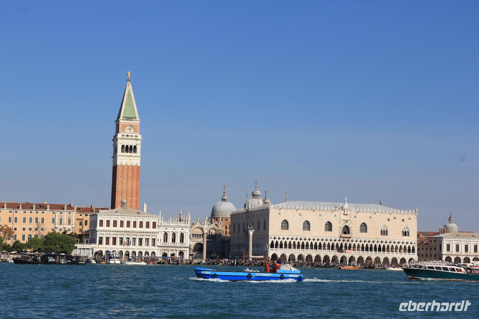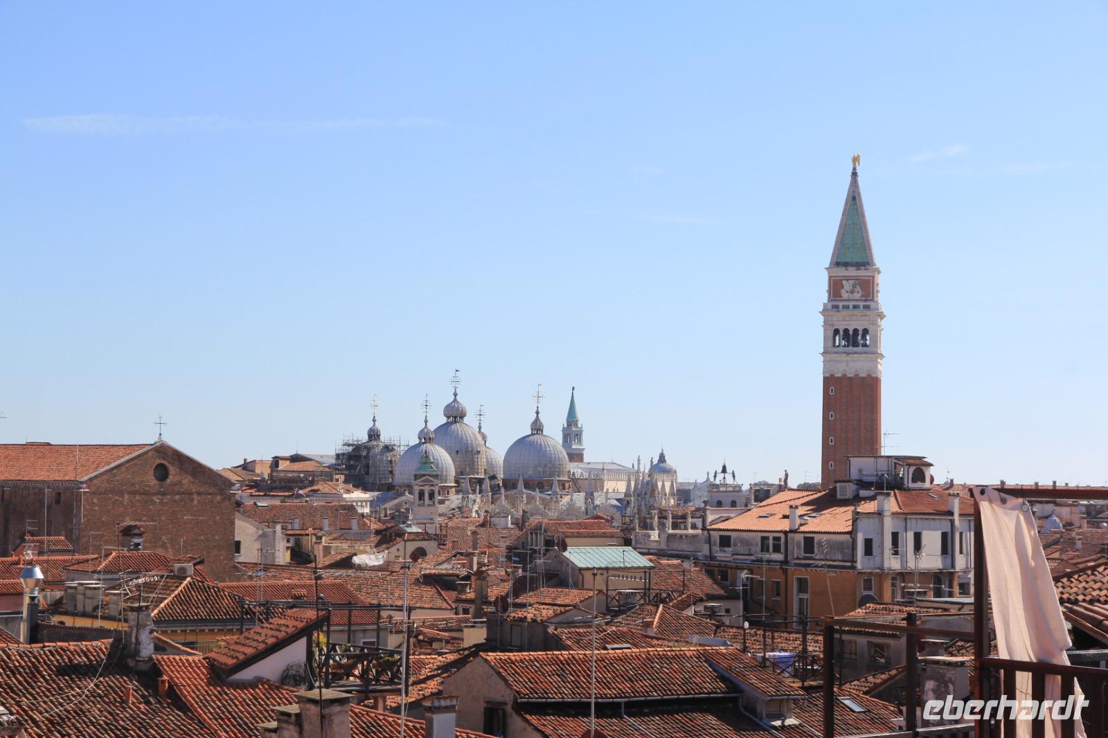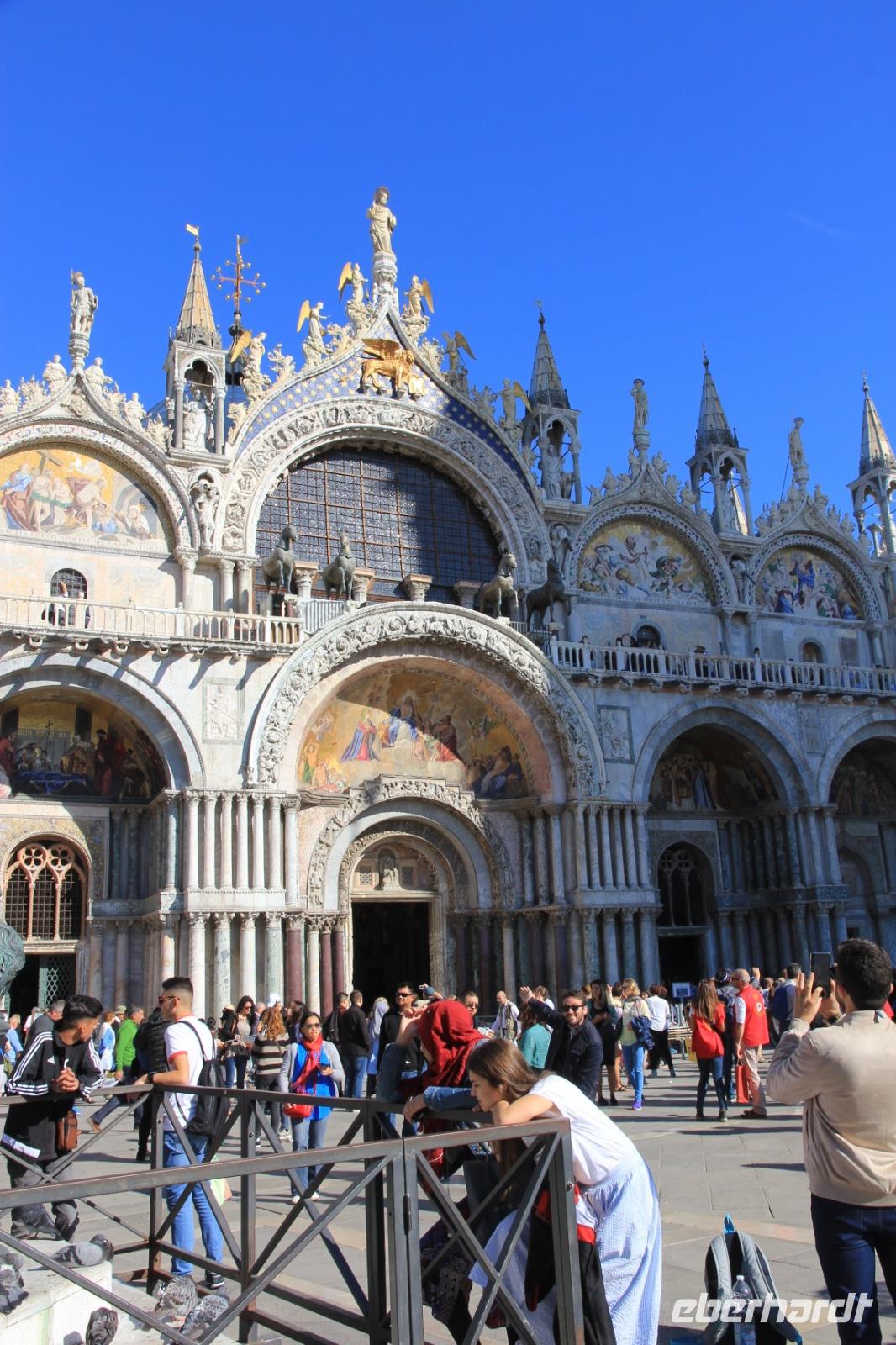An der Piazzale Roma erwartet uns unsere charmante Stadtführerin Alessia zum Stadtrundgang. Dieser führt uns zuerst durch die Gassen des Stadtteils Santa Groce zur Innenbesichtigung der Kirche Santa Maria Glorioso dei Frari. Wir bewundern u.a. Tizians Assunta über dem Altar, sein von seinen Schülern geschaffenes pyramidenförmiges Grabmahl und das Pesaro-Tryptichon von Giovanni Bellini. Alessia zeigt uns abseits des Touristenstromes noch von den Venezianern bewohnte Gassen, eine Schule und romantische Plätze. Kurz vor der Rialto-Brücke machen wir Halt für einen Mittagsimbiss. Danach geht es über die Rialtobrücke zum Fondaco dei Tedeschi, dem ehemmaligen Handels- und Wohnhaus deutscher Händler im mittelalterlichen Venedig, auf dessen Dachterasse wir wunderbare Ausblicke auf den Canal Grande und die gesamte Stadt genießen und mit unseren Kameras festhalten. Den Abschluss unseres Rundganges bildet die Piazza San Marco. Wir besichtigen die Privatkapelle der Dogen, die Basilica di San Marco, von innen. Am Dogenpalast trennen wir uns, um allen noch etwas Zeit für private Entdeckungen zu geben. Dann geht es gemeinsam über die Ponte dell' Accademia auf die andere Seite des Canal Grande zu unserem Lokal, in dem wir ein Fischmenü zu uns nehmen. Von hier aus ist es nicht mehr weit zum Ausgangspunkt unseres heutigen Rundgangs, an dem uns unsere Transfer-Autos zum Hotel erwarten.