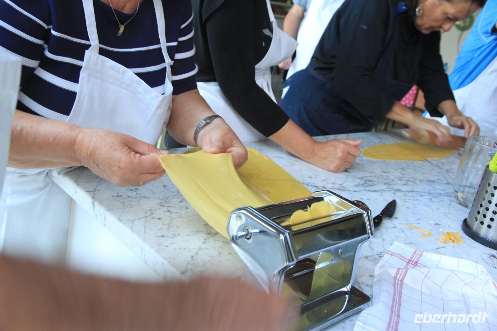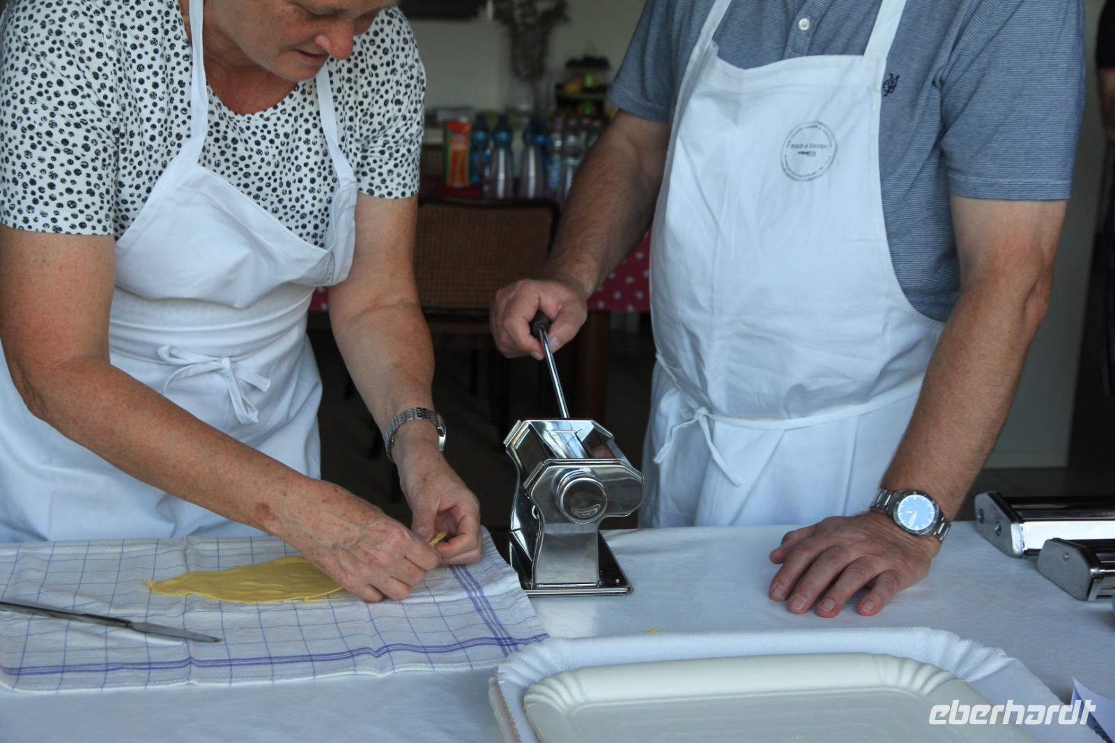 Am Nachmittag sind wir bei einer ehemaligen Gastwirtsfamilie eingeladen, bei der wir italienische Gerichte zuzubereiten lernen. Nach einem Glas Prosecco mischen und kneten wir Pizzateig, richten wir Nudelteig an und schneiden wir diesen mit einer Maschine in Streifen, formen wir Gnocchi und bereiten wir unterschiedliche leckere Soßen. Schnell sind die zweieinhalb Stunden der Vorbereitung vergangen - jetzt tut uns der Rücken weh und haben wir Hunger. Paolo und Alexandra erhitzen und richten unsere Meisterwerke der Kochkunst an. Nach dem reichlichen Verzehr ahnen wir, dass unsere Verdauungsorgane für den Rest der Reise reichlich zu tun haben werden.