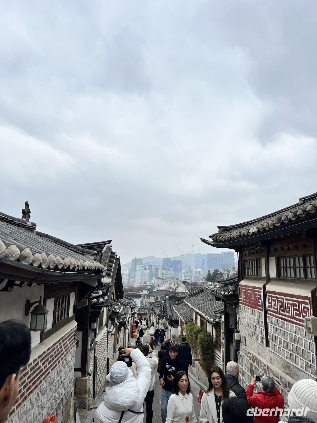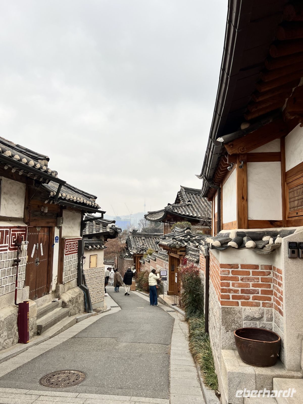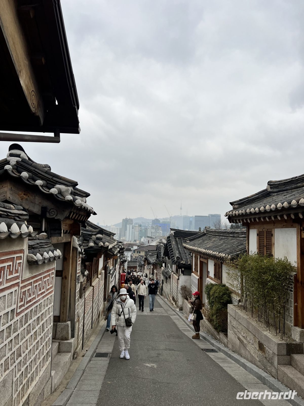 Unsere letzte Station vor dem Abendessen ist das Dorf Bukchon Hanok. Dieses Dorf liegt eingebettet zwischen den Palästen Gyeongbokgung und Changdeokgung. Diese Häuser blicken auf eine rund 600-jährige Geschichte der kaiserlichen Dynastie zurück und rund 900 traditionelle Hanok-Häuser, werden hier von Touristen aus aller Welt besichtigt. Die meisten Häuser sind noch bewohnt, weshalb wir besonders leise sein mussten, um die Bewohner nicht zu stören.